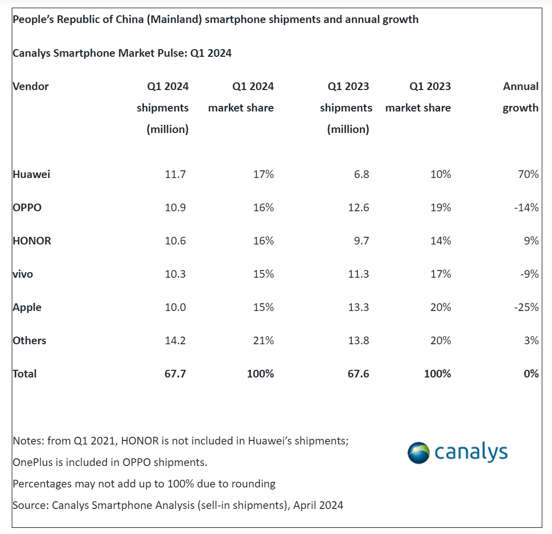 Canalys的最新研究显示,中国大陆智能手机市场在两年之后终于出现了反弹,2024年第一季度的出货量为6770万部。值得注意的是,华为在13个季度后重返榜首,出货量为1170万部,占17%的市场份额,这要归功于Mate和nova系列的热烈市场反应。在Reno 11系列强劲表现的推动下,OPPO以1090万部的出货量位居第二。相反,继去年第四季度表现强劲之后,荣耀、vivo和苹果本季度的销量有所放缓,分别排名第三、第四和第五。荣耀以1060万部位居第三,同比增长9%。Vivo以1030万部排名第四,同比下降9%。在前五名中,苹果的下滑幅度最大,为1000万部,同比下降25%。