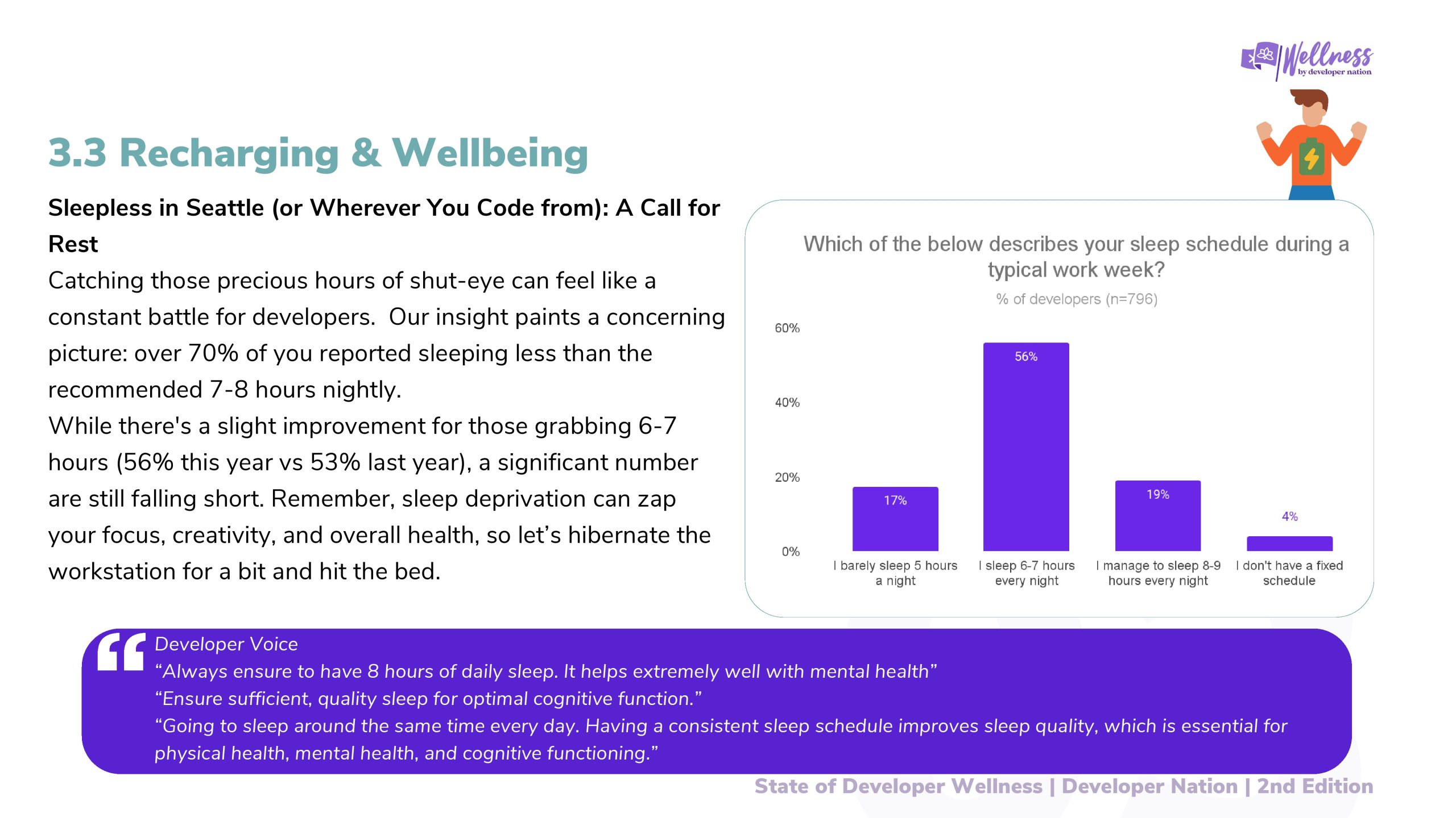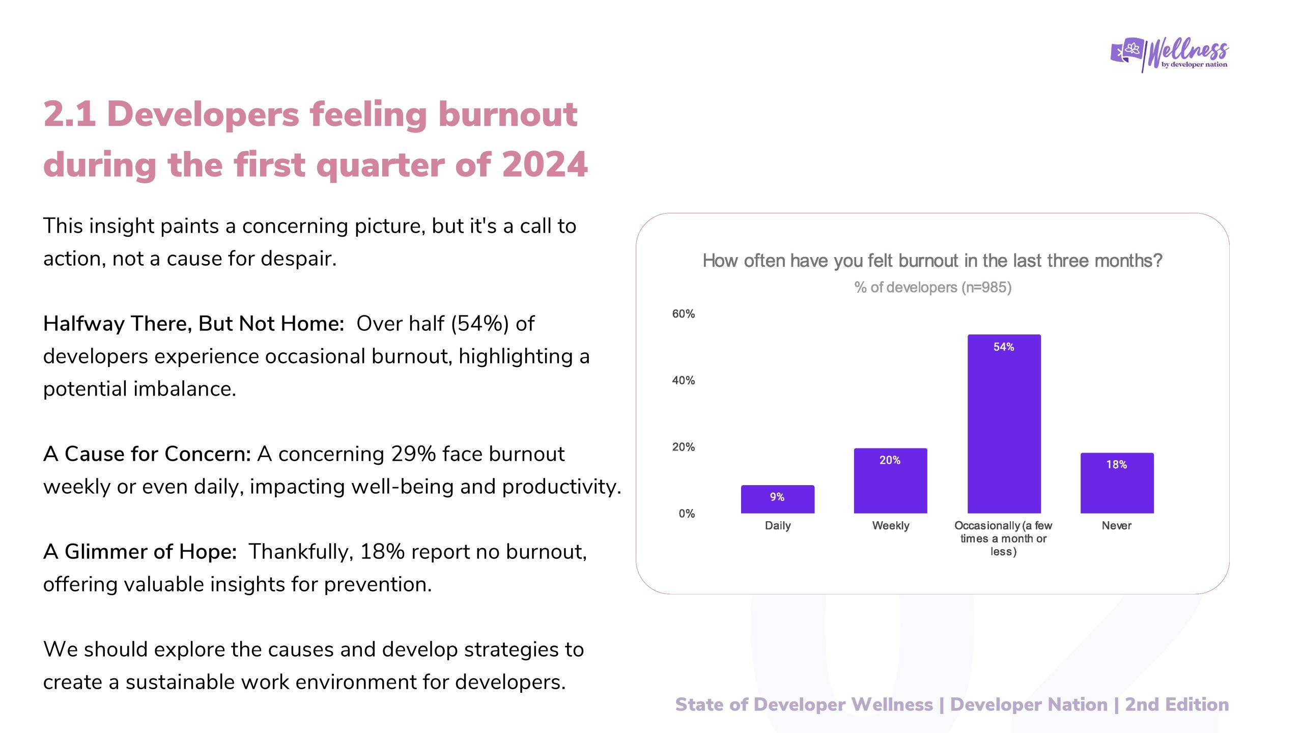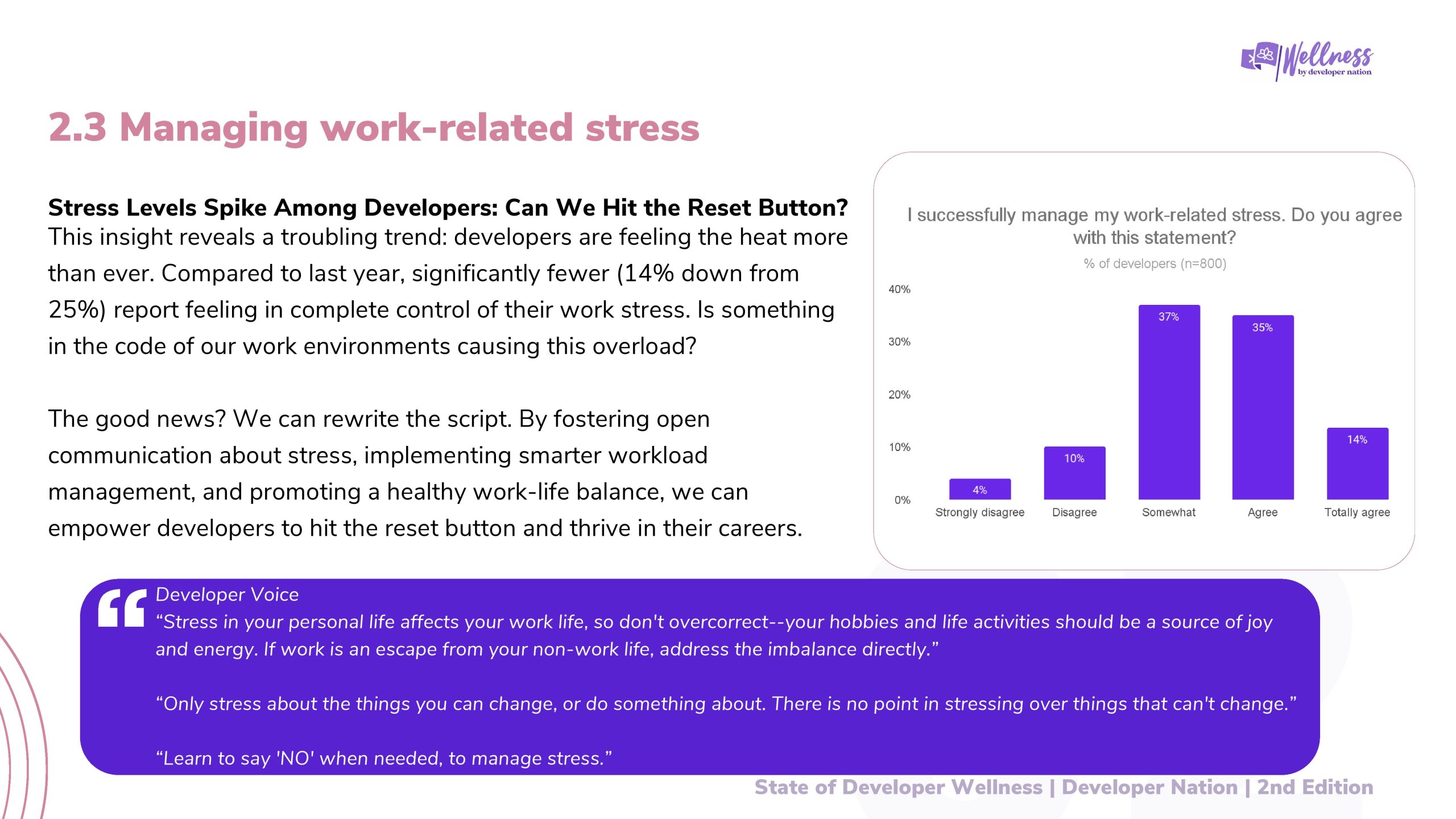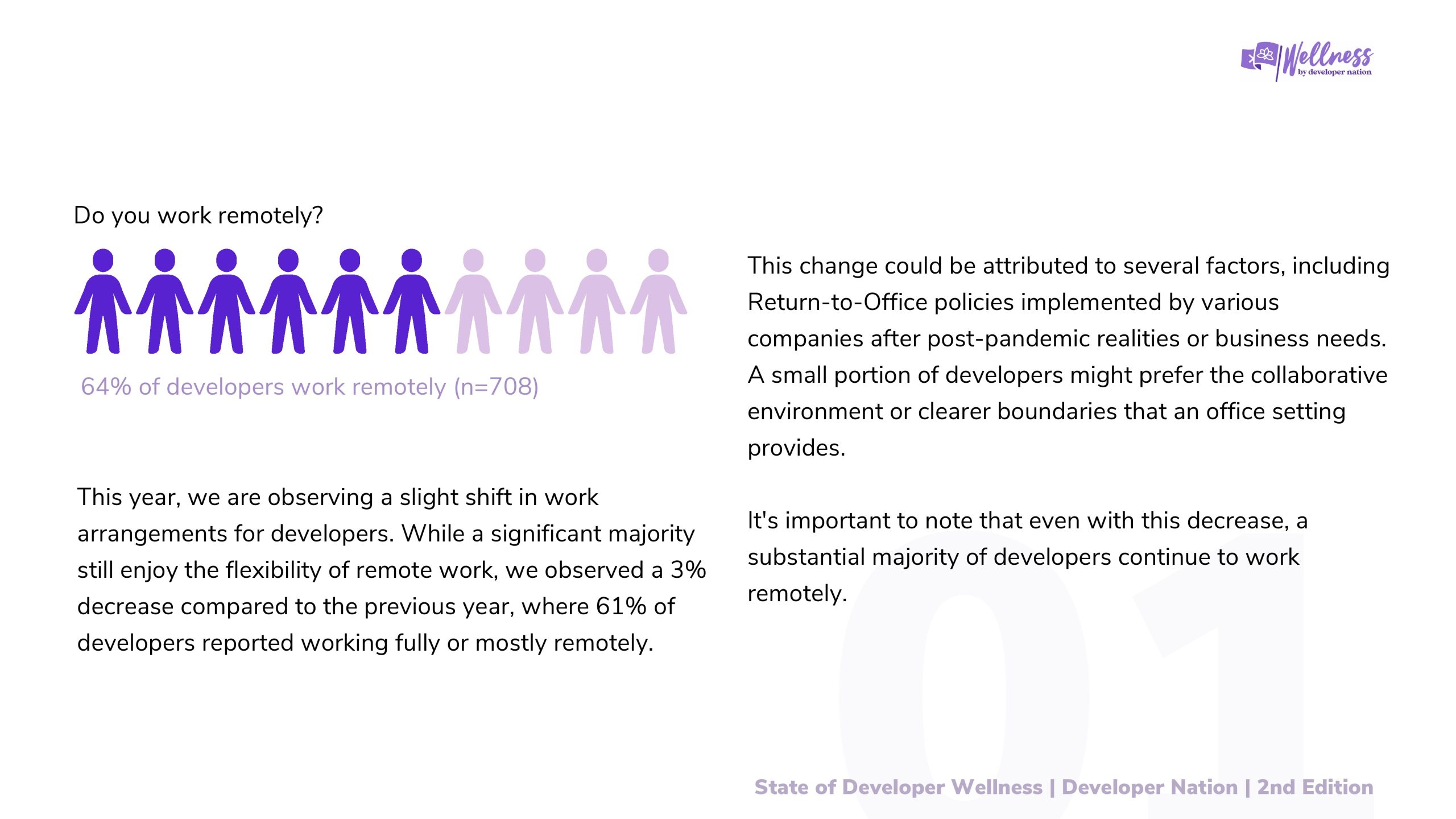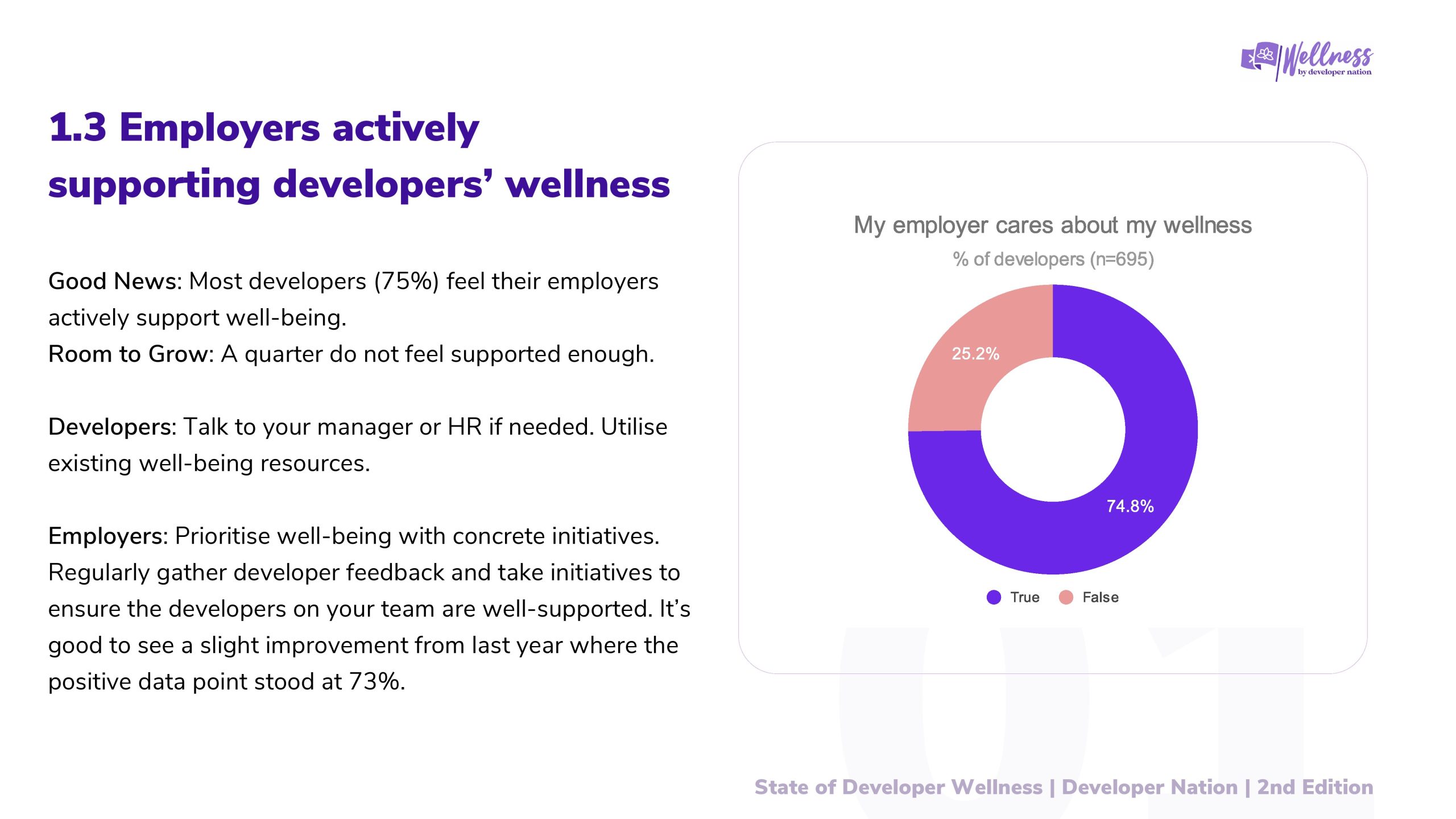 2023年Developer Nation进行了第一次开发者健康调查,目的是更好地了解开发者的健康和快乐水平。去年的报告引发了关于开发者社区幸福感的重要讨论,揭示了开发者在职业生涯中面临的挑战。
