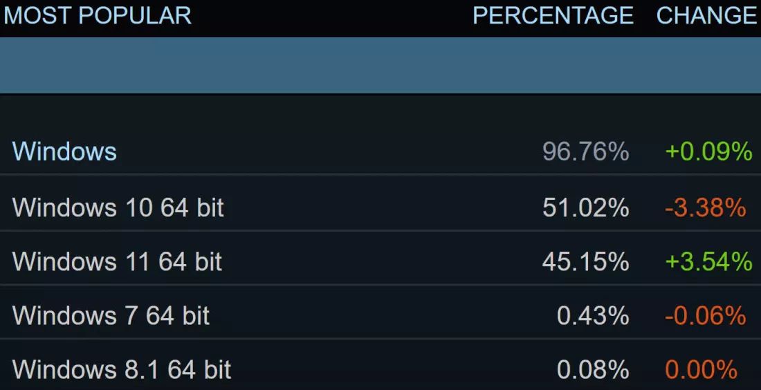根据 Statcounter 的数据,Windows 11 在全球 Windows 系统中的普及率在上市两年半后仍未突破 30%。但在 Steam 的调查中,该操作系统的前景稍好一些,几个月来首次出现大幅增长。