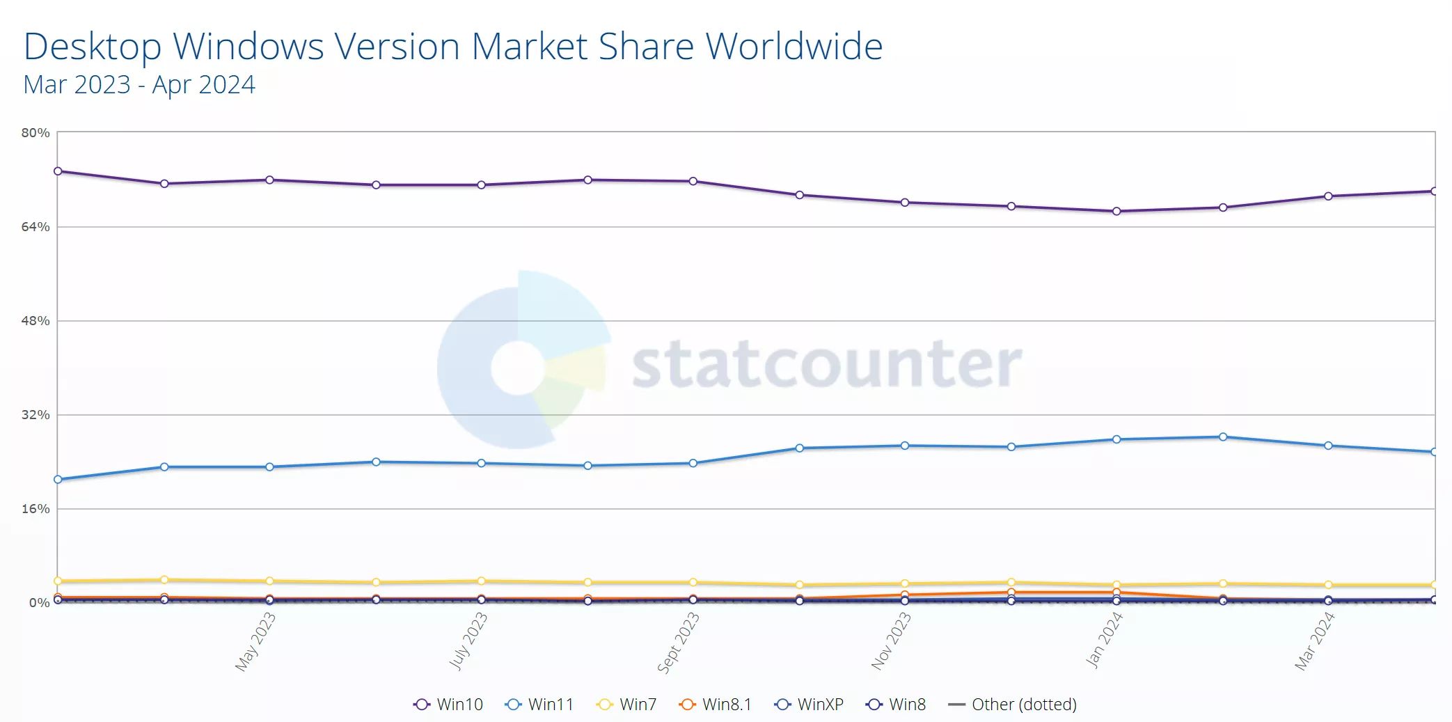 在 Statcounter 的全球排行榜上,Windows 11 的市场份额已进入第二个月的下滑期。该操作系统在Windows用户中的采用率降至25%左右,而Windows 10则回升至70%。