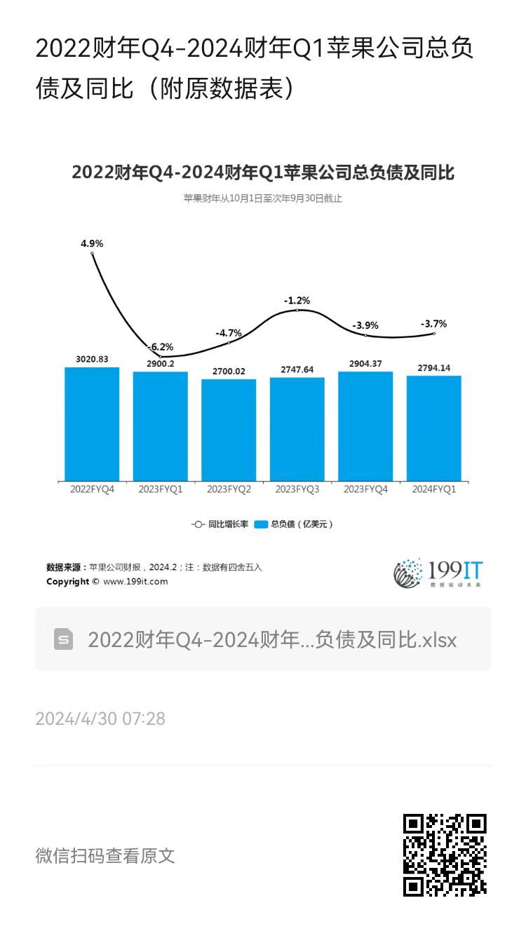 2022财年Q4-2024财年Q1苹果公司总负债及同比(附原数据表) ​​​