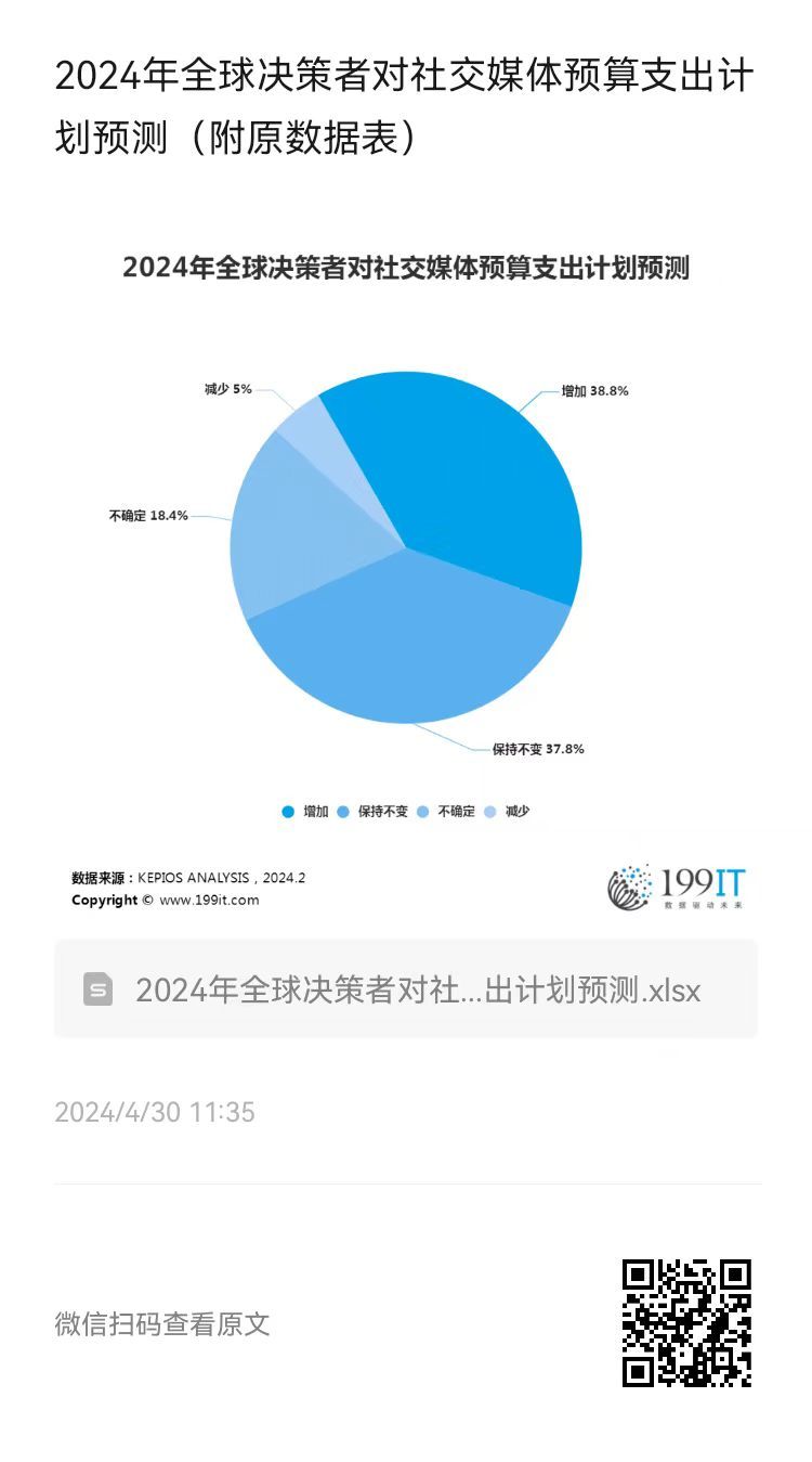 2024年全球决策者对社交媒体预算支出计划预测(附原数据表) 更多阅读:2023年全球社交媒体上品牌对消费者产生负面影响因素比例(附原数据表) 2023年美国18-34岁听众在社交媒体发现主要音乐比例(附原数据表) 2020-2021年美国社交媒体用户规模同比增长率(附原数据表) 对您的品牌来说,最有效的社交媒体渠道是什么?(附原数据表) WeAreSocial:2021年全球网络概览皮尤:2024年青少年、社交媒体和科技报告Sprout Social:2025年澳大利亚社交媒体指数Jungle Scout:2024年第二季度消费者趋势报告美国餐饮协会:2024年热门烹饪预测走向流行:文化创作者报告Socialinsider:2021年TikTok平均参与度达到 5.96%Rival IQ:2022年第一季度社交媒体行业报告IAS:2021年推文趋势和信息流广告研究报告GWI:2021年千禧一代报告RivalIQ:2023年社交媒体十大户外品牌