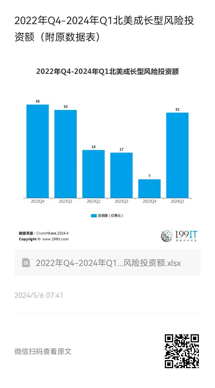 2022年Q4-2024年Q1北美成长型风险投资额(附原数据表) ​​​
