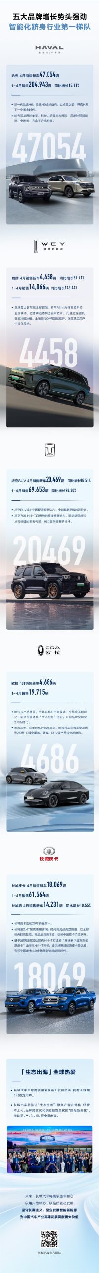 魏牌品牌也取得了显著增长,4月销售新车4,458辆,同比增长87.71%,1-4月累计销售14,066辆,同比大涨143.44%。