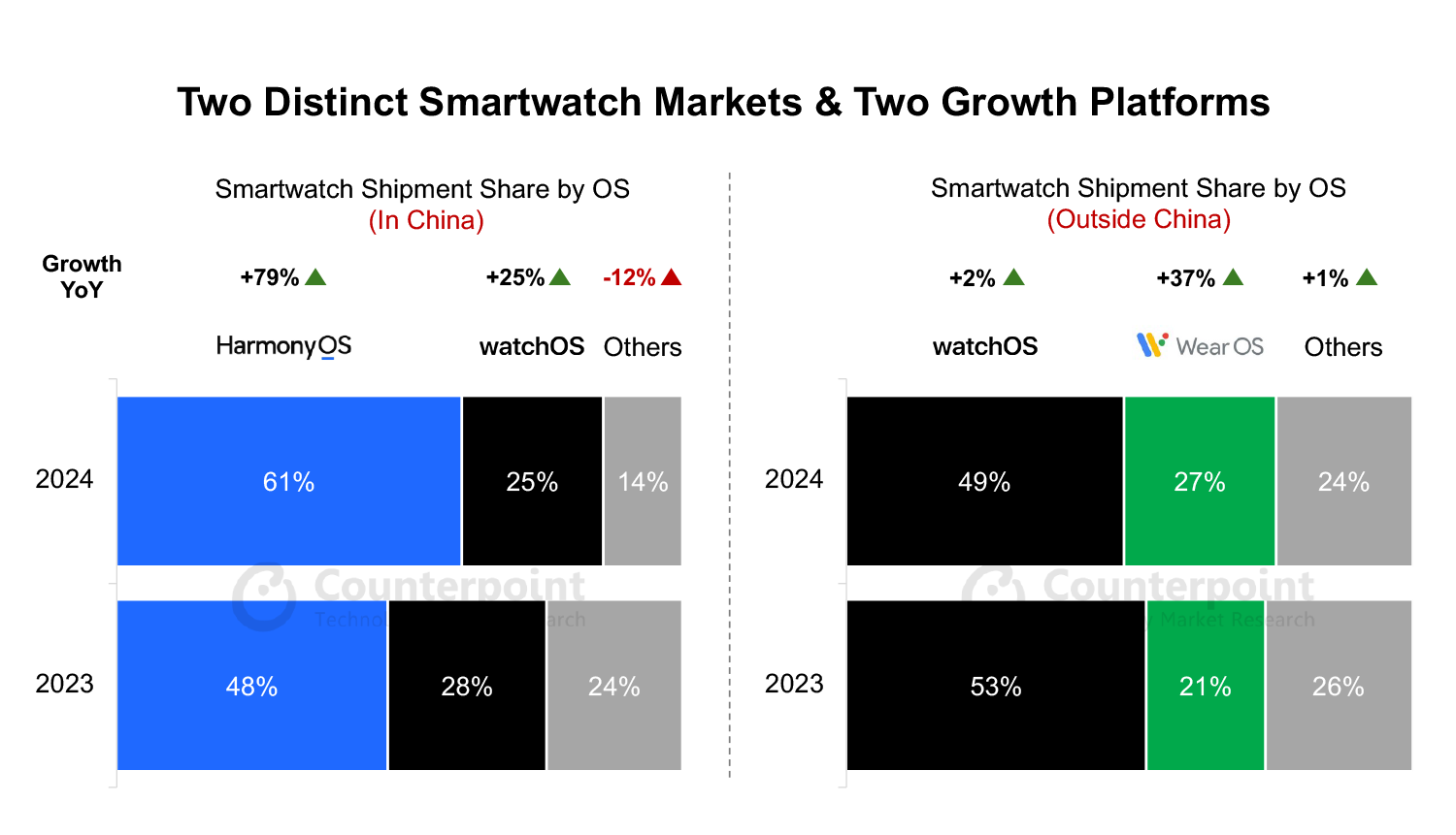 按地区、品牌和操作系统划分,全球HLOS智能手表市场在2023年持平增长后,预计2024年将实现15%的增长速度。这一增长的主要来自非苹果智能手机用户,他们要么在中国以外使用基于谷歌Wear操作系统的智能手表,要么在中国使用基于华为鸿蒙的智能手表。