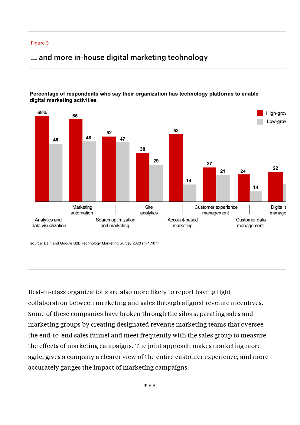 这种领导地位也延伸到了技术领域。大约2/3的公司安装了分析和数据可视化(68%)和营销自动化(65%)技术,而低增长公司中只有不到一半(分别为46%和48%)。超过一半的高增长企业(53%)采用了基于客户的营销技术,而在低增长企业中,这一比例仅为14%。