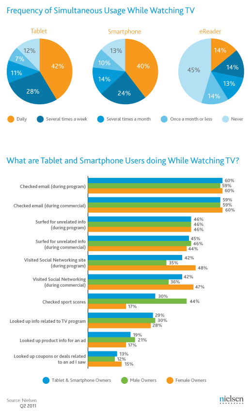 Nielsen研究表明,多数美国人在观看电视节目的时候,会使用智能手机、平板电脑或电子书设备获得更高的生产率,或者获取更多的娱乐内容。根据尼尔森的调查数据,在拥有平板电脑的用户中,有42%的用户会在每天看电视的时候使用平板电脑。而使用智能手机和电子书同时观看电视的用户比率分别为 40%和14%。同时,仅观看电视而不使用这些设备的用户比率分别为平板电脑用户12%,智能手机用户13%,电子书用户45%。