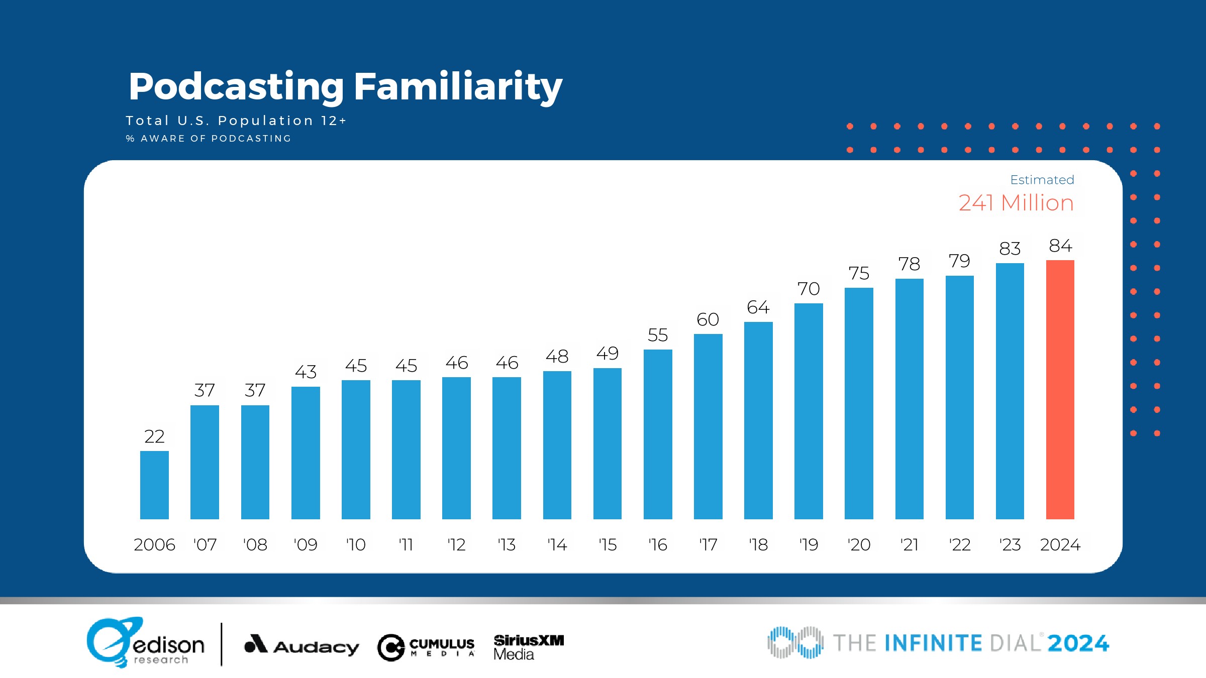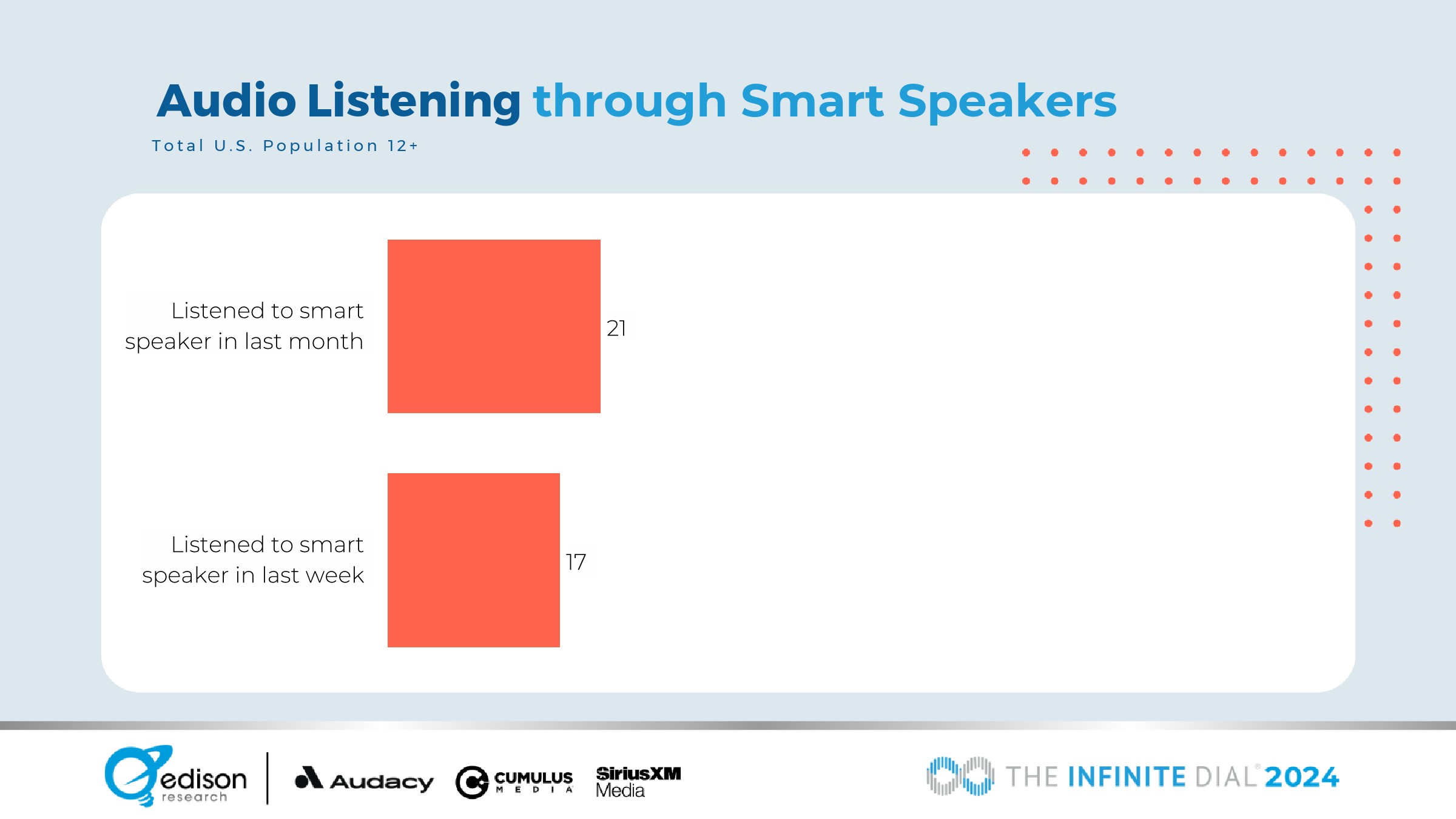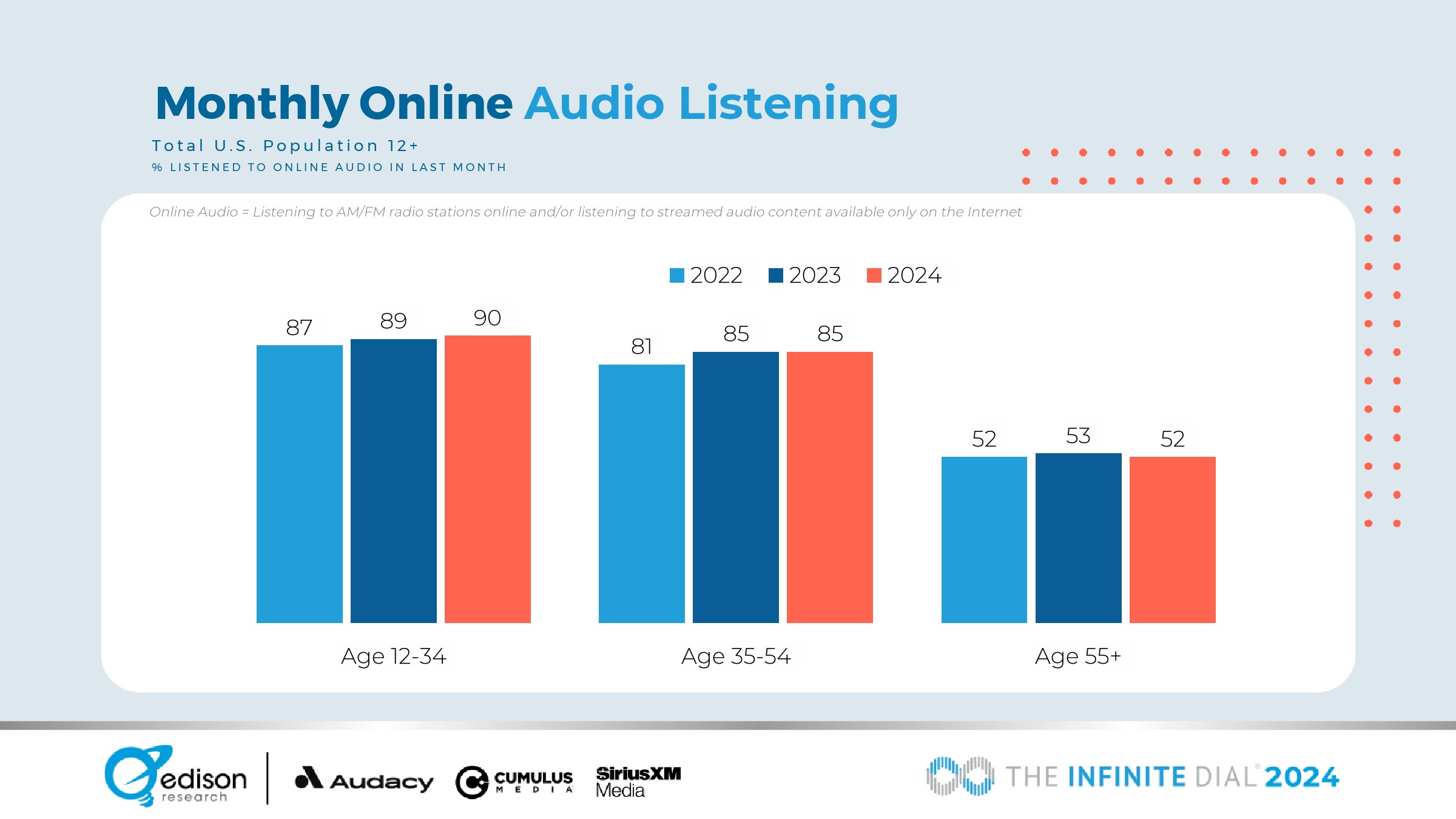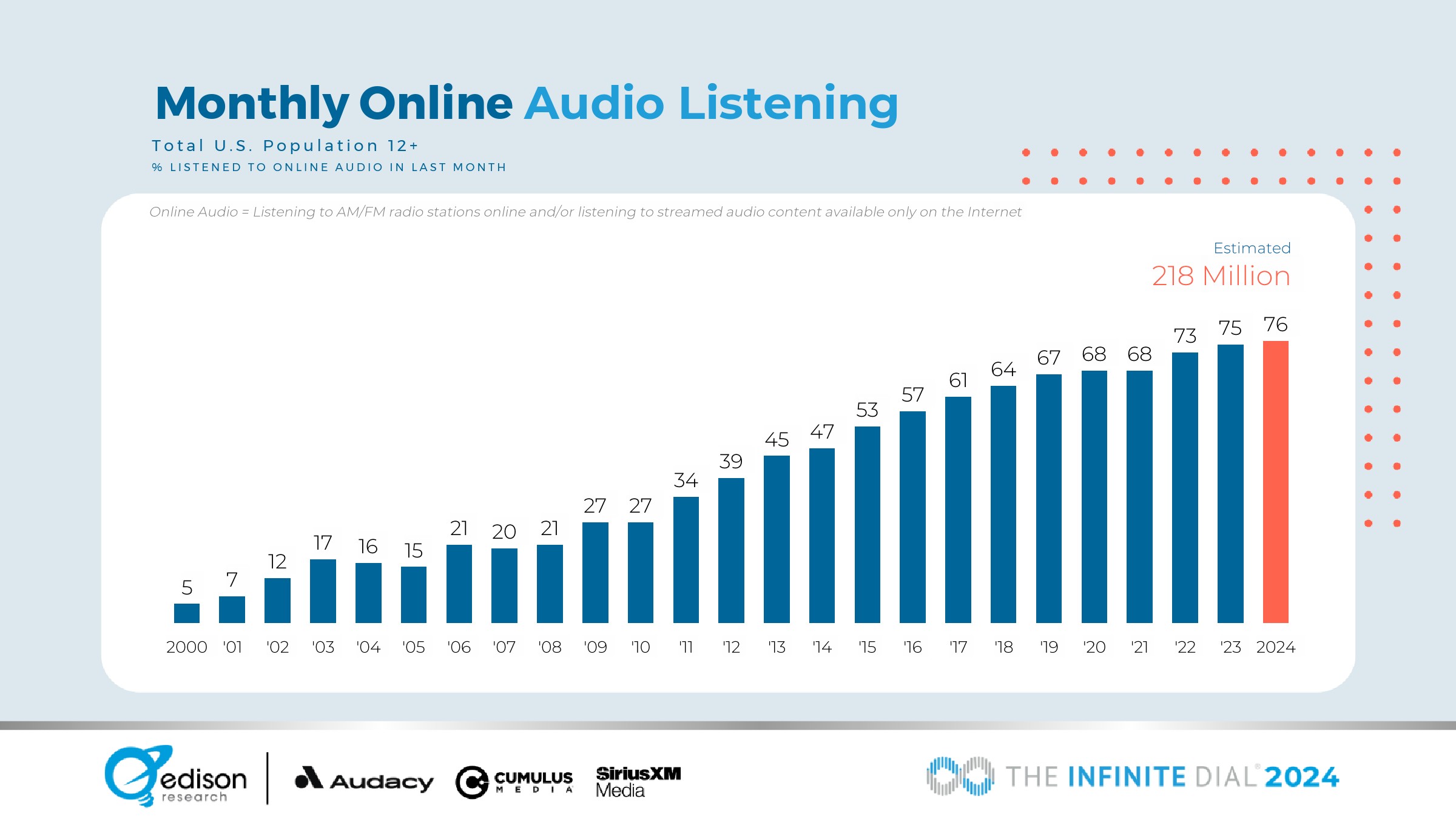 76%的12岁以上美国人在上个月听过在线音频,估计有2.18亿人。