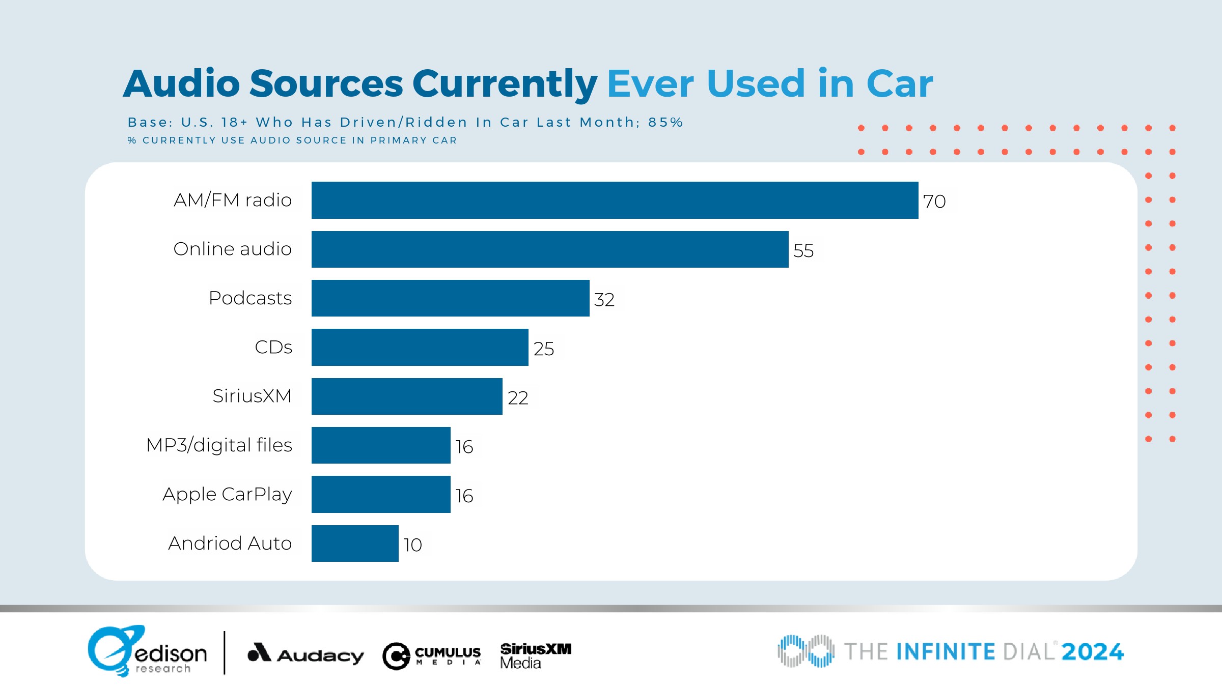 在过去一个月驾驶或乘坐汽车的18岁以上人群中有70%目在汽车中收听广播;55%听在线音频;32%听播客。
