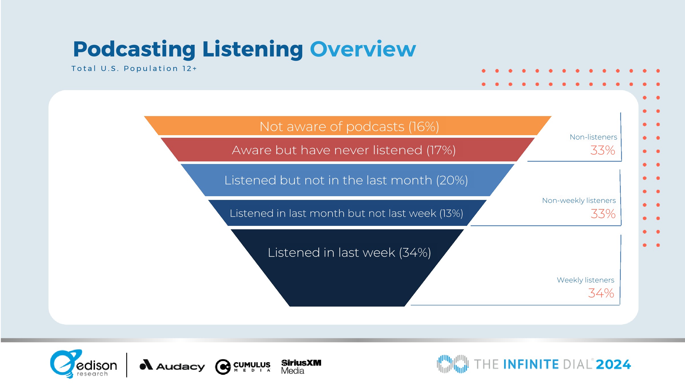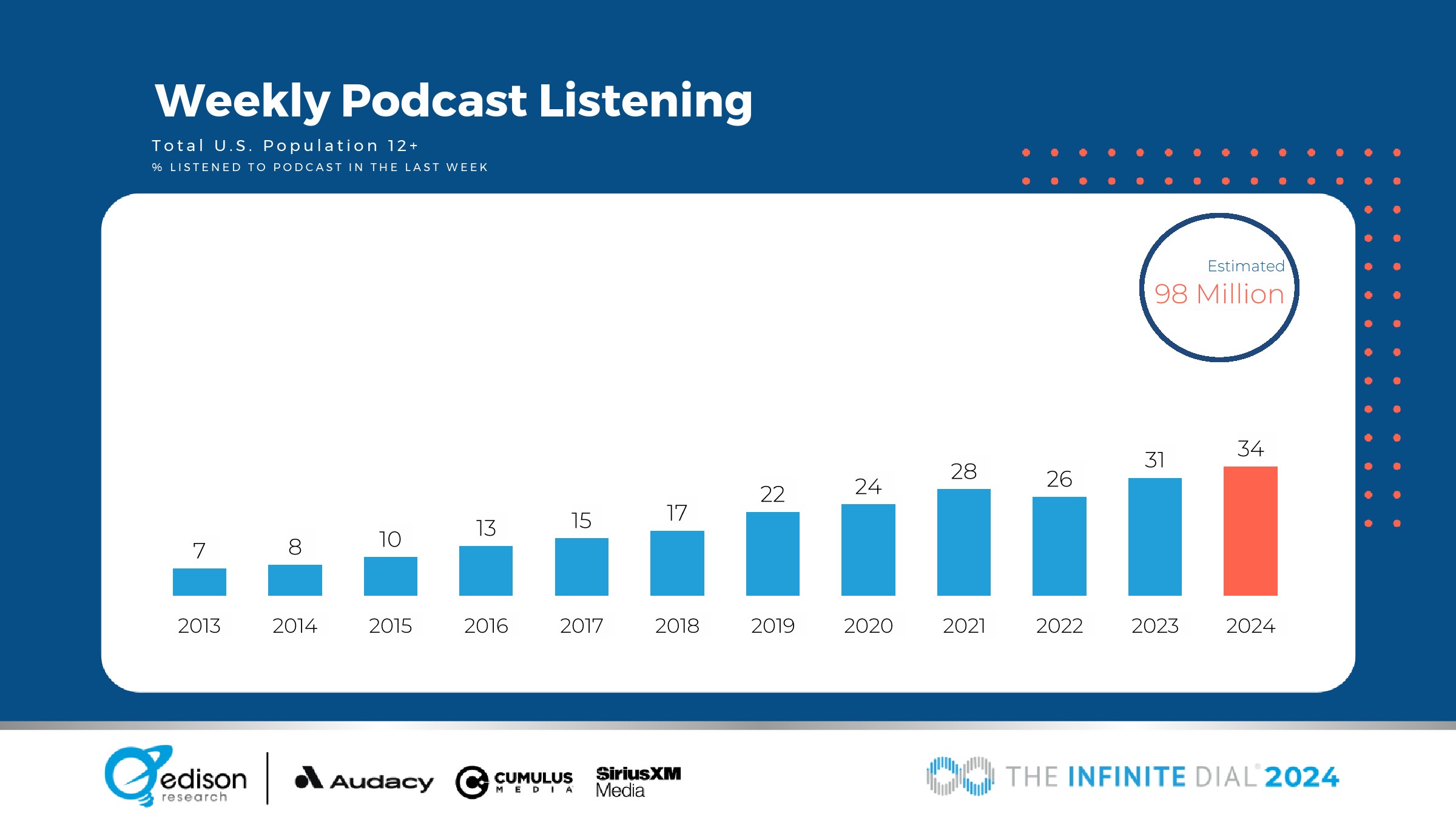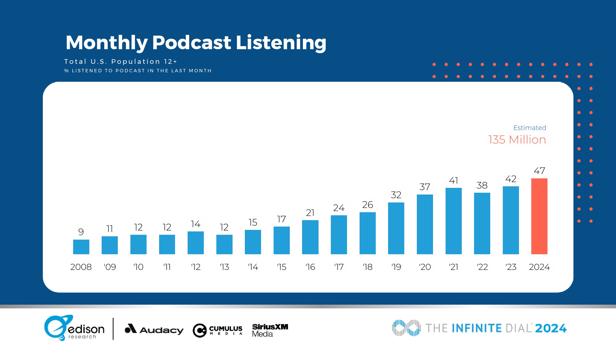 47%的美国12岁以上人口在上个月听过播客,同比增长12%;美国12岁以上人口中有34%在上周听过播客,同比增长10%。收听水平显著提高。