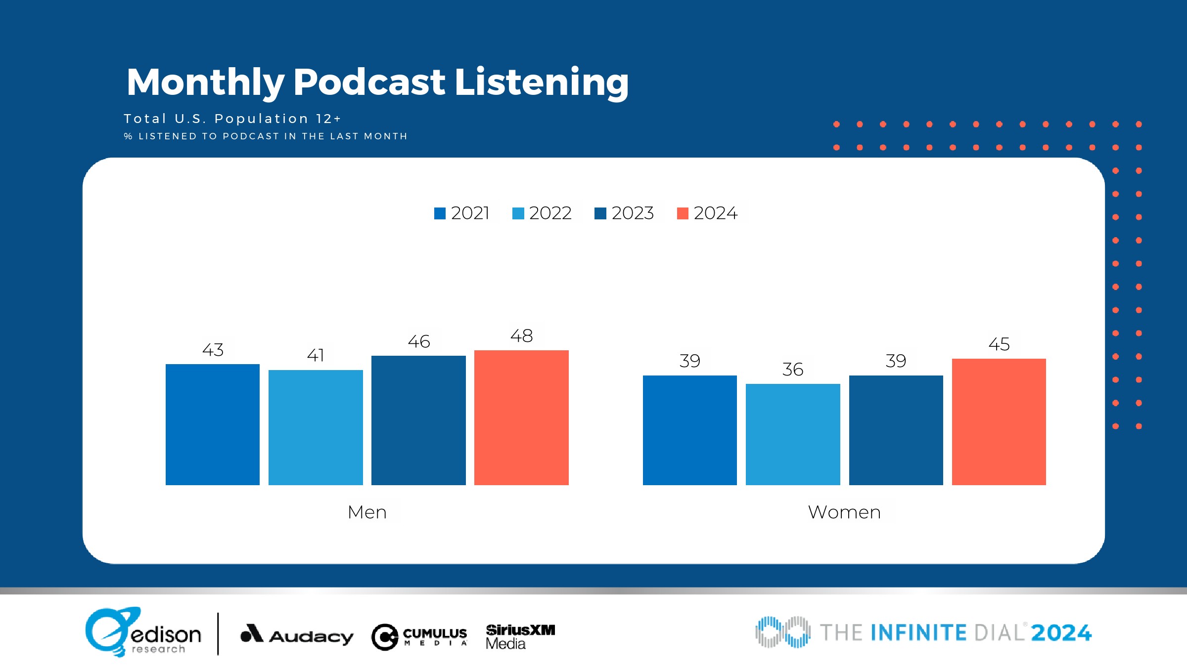 男性每周和每月收听播客的人数分别增长了3%和4%。
