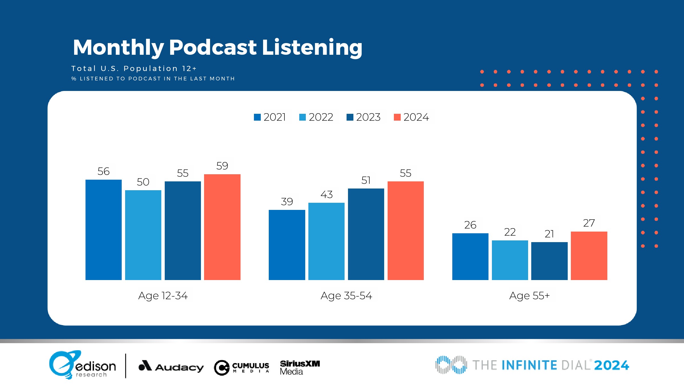 所有年龄组每月和每周收听播客的人数都有所增加。