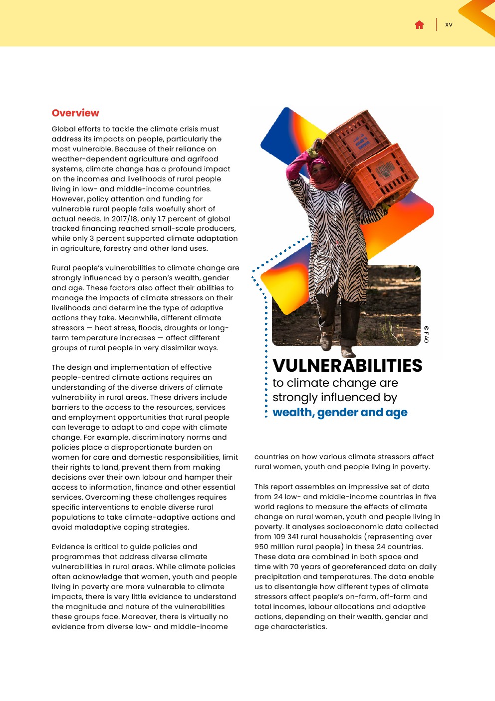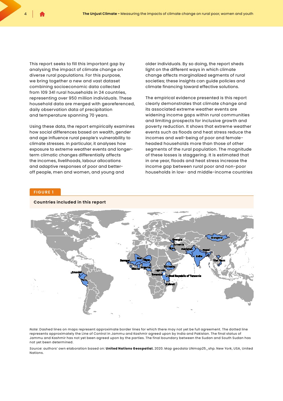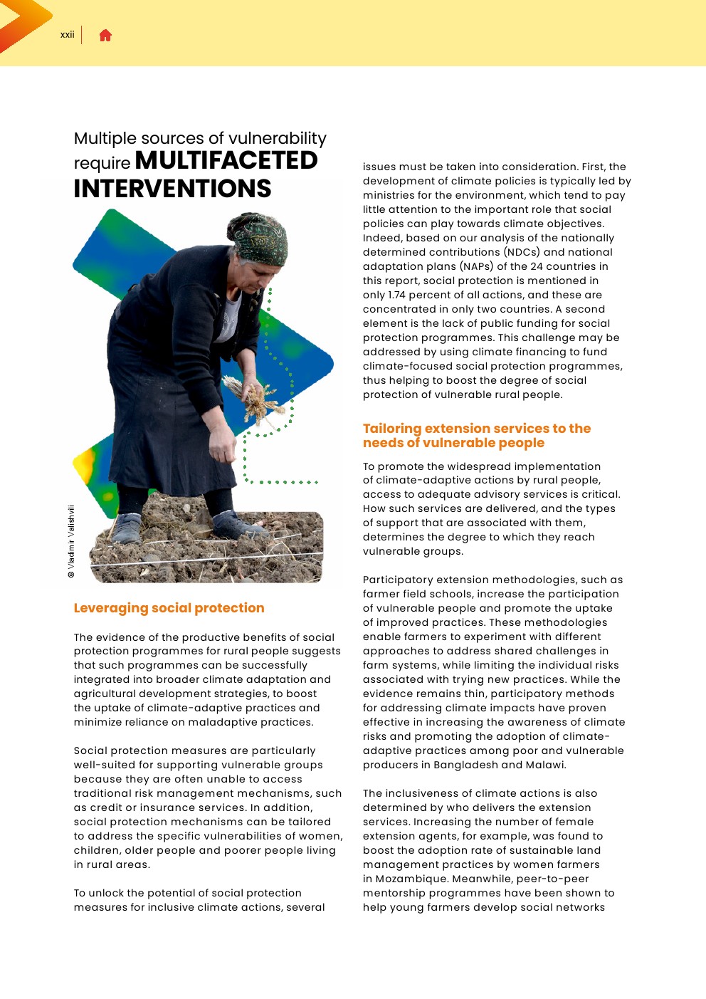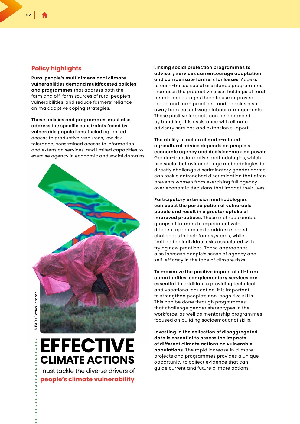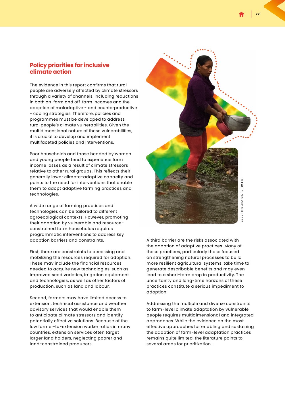 农村人口及其气候脆弱性在国家气候政策中几乎不为人所知。在报告分析的24个国家的国家自主贡献(NDCs)和国家适应计划(NAP),在拟议的4164项气候行动中,只有6%提到了妇女,2%明确提到了青年,不到1%提到了穷人,约6%提到了农村社区的农民。