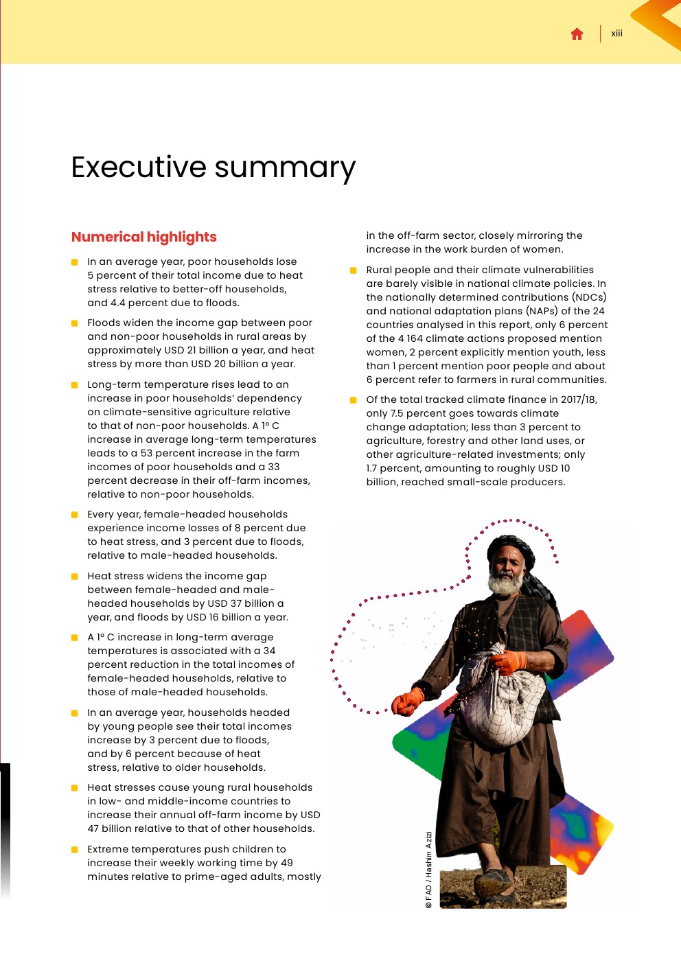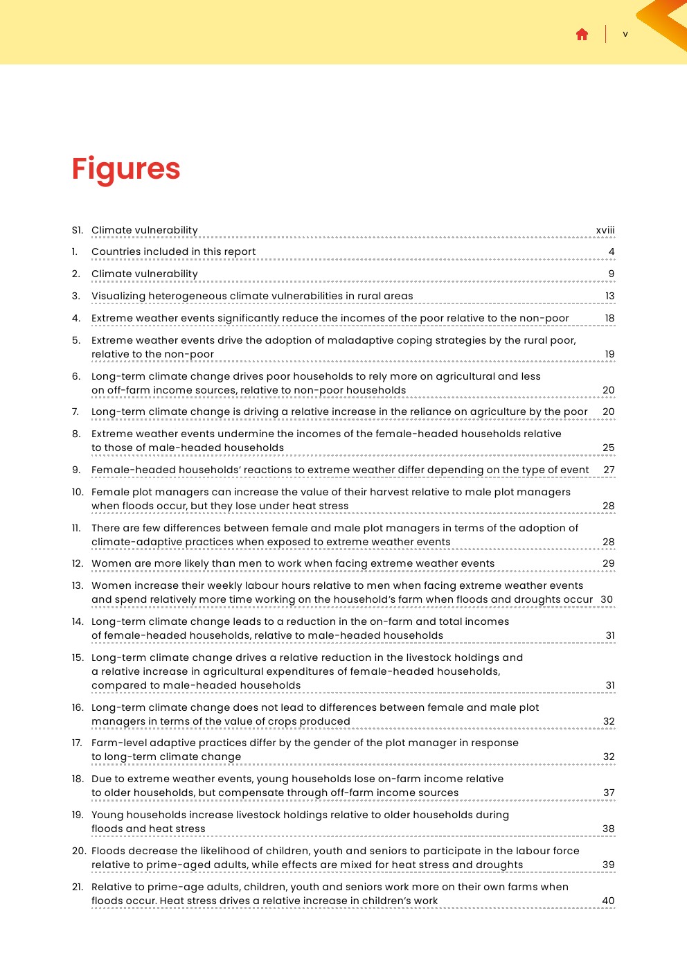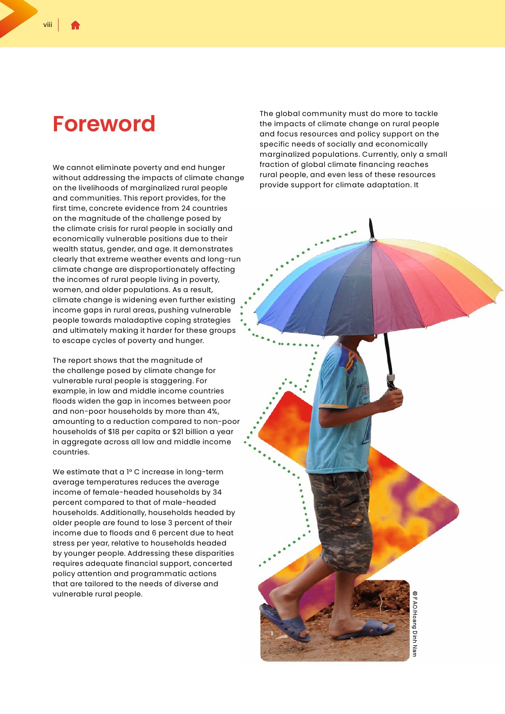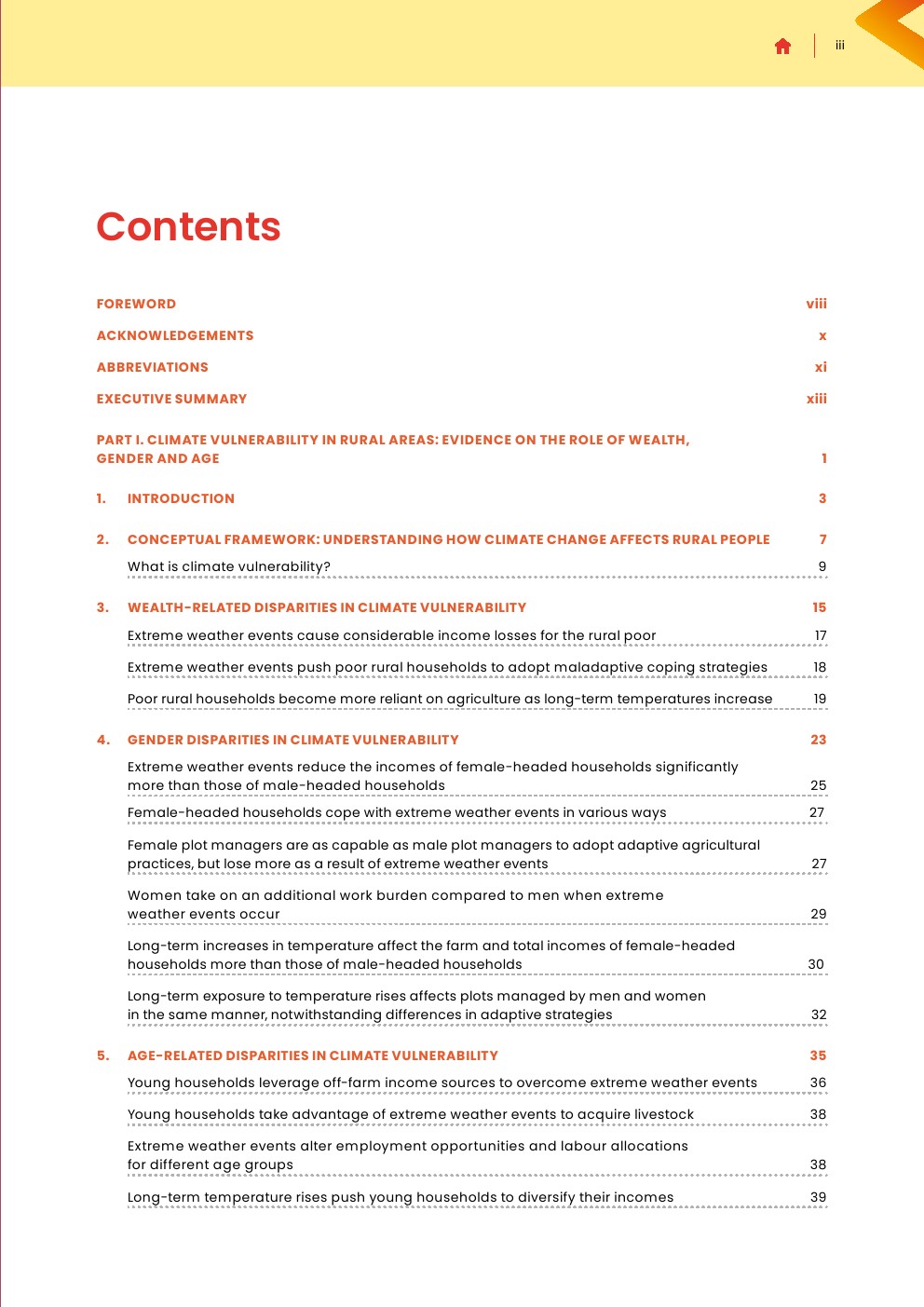 农村人口及其气候脆弱性在国家气候政策中几乎不为人所知。在报告分析的24个国家的国家自主贡献(NDCs)和国家适应计划(NAP),在拟议的4164项气候行动中,只有6%提到了妇女,2%明确提到了青年,不到1%提到了穷人,约6%提到了农村社区的农民。