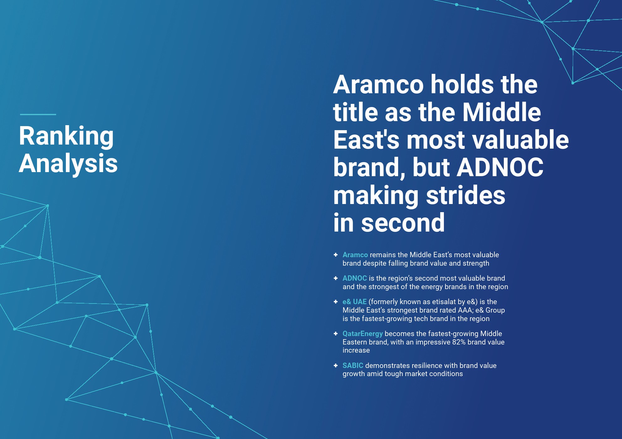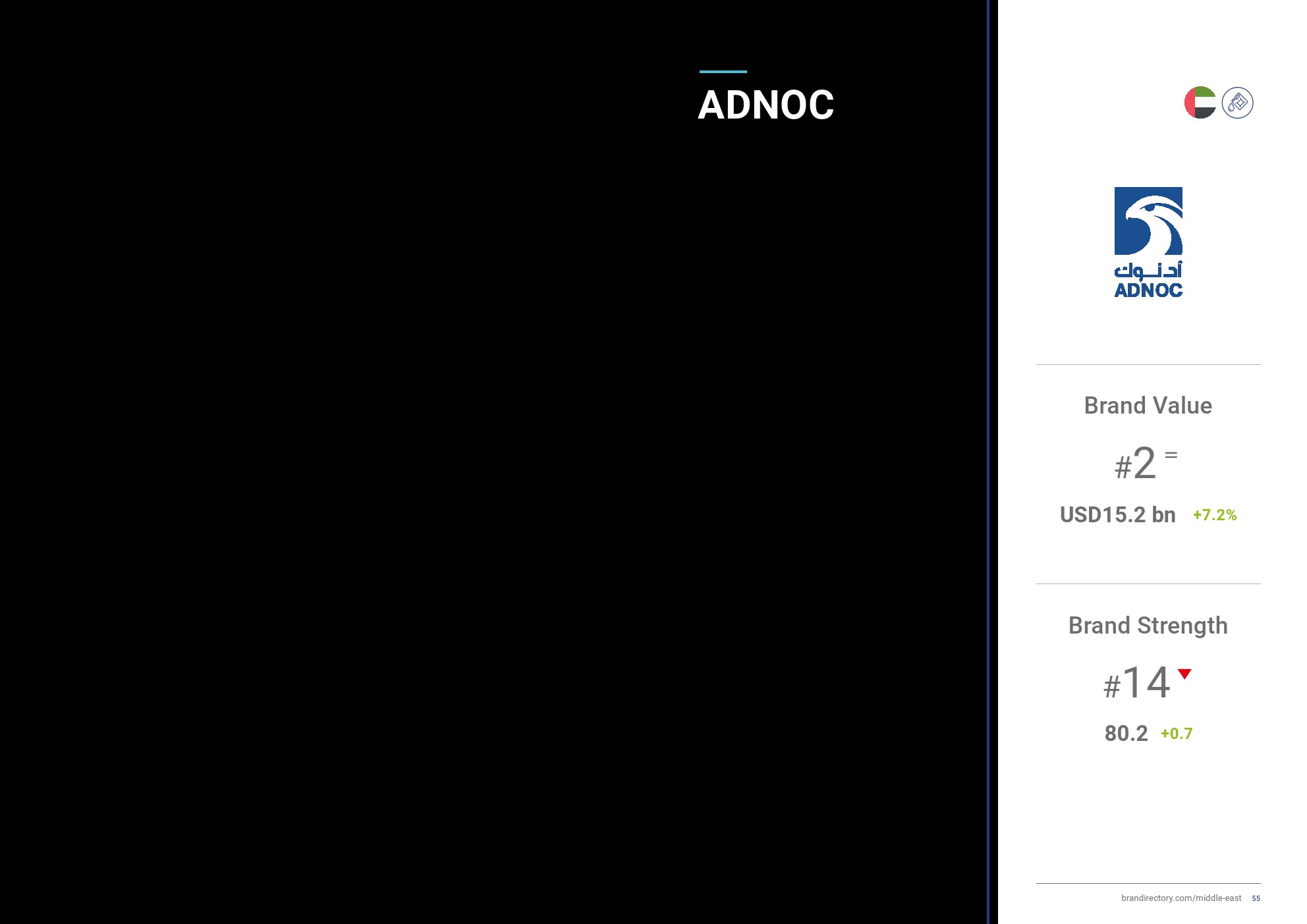 ADNOC是中东第二大最有价值品牌(品牌价值增长7%,达到152亿美元),也是阿联酋最有价值品牌。在其脱碳和多元化努力的推动下,该品牌的BSI提高了1个百分点,达到80.2,使其成为该地区最强大的能源品牌。