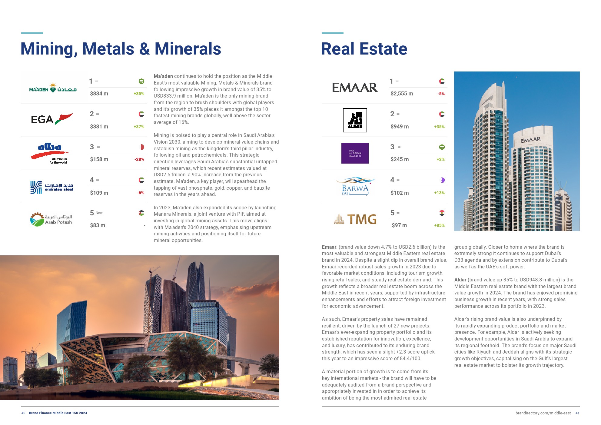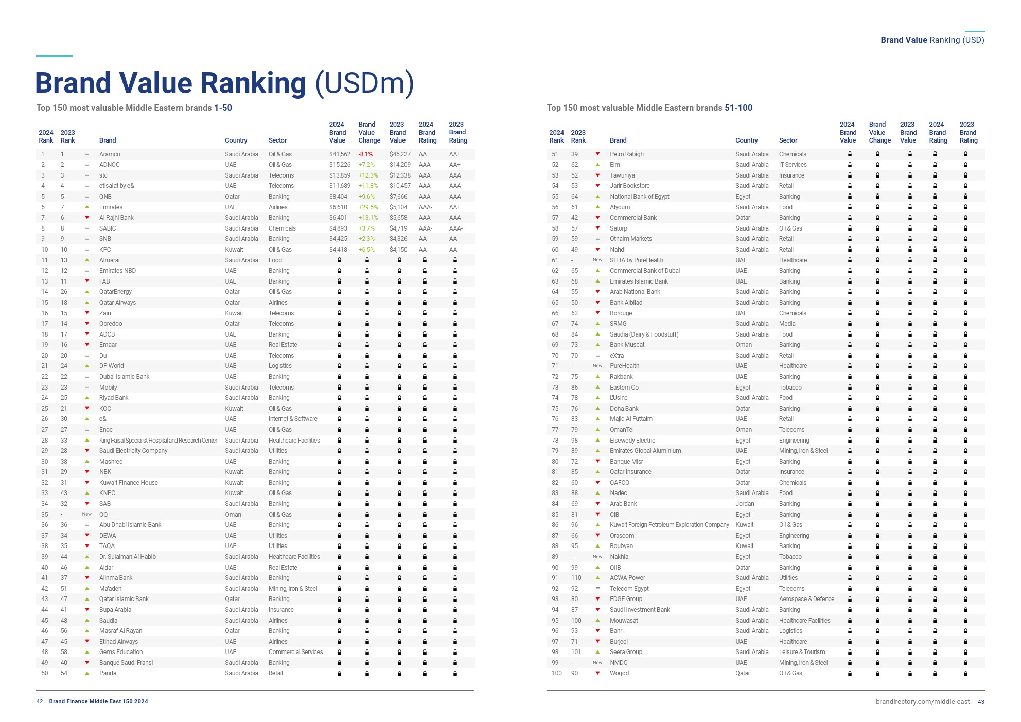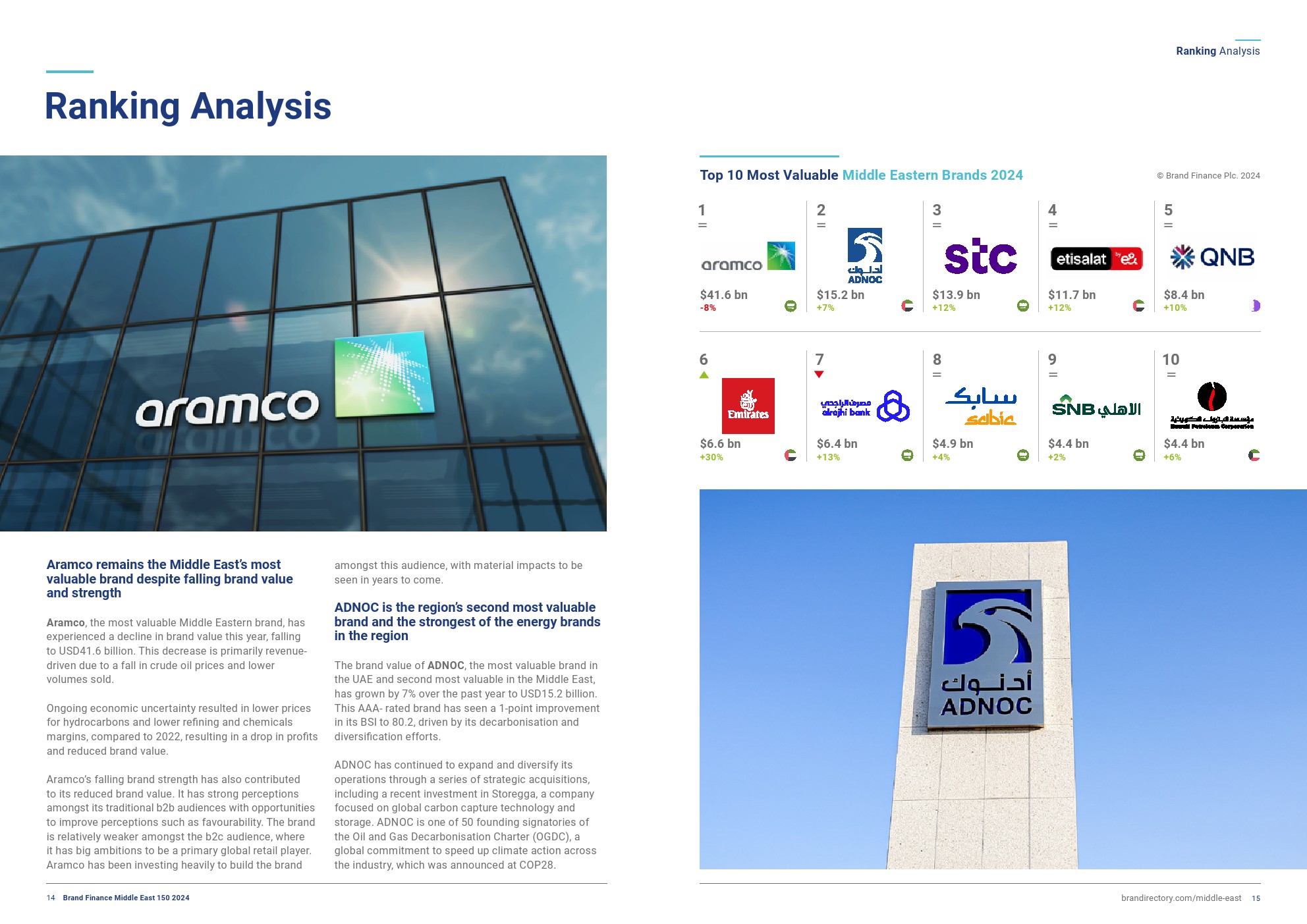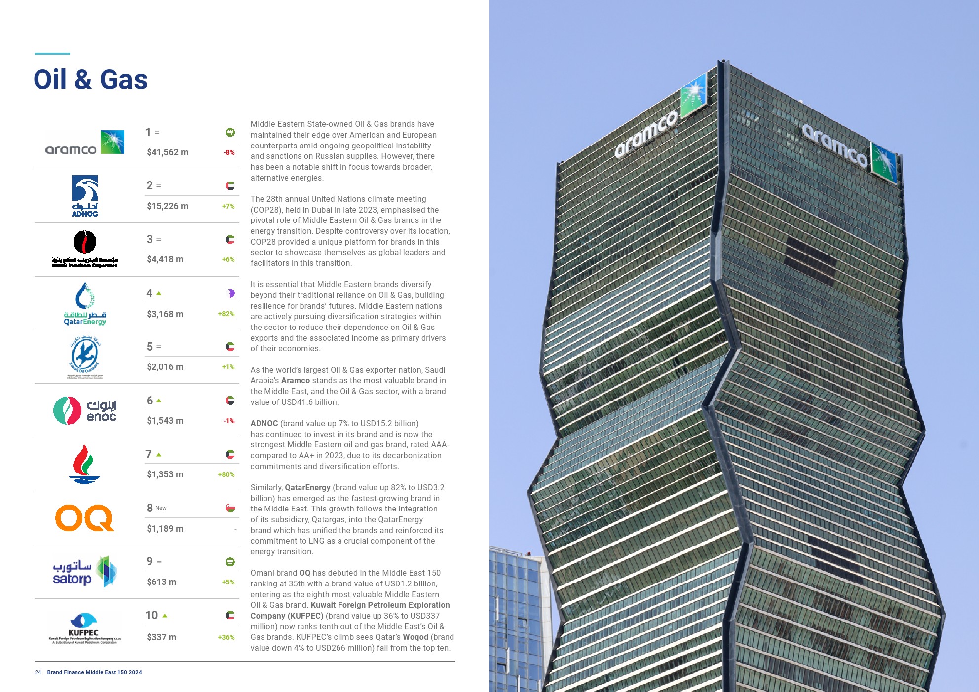 Brand Finance发布了“2024年中东品牌150强”。尽管沙特阿美的品牌价值下降了8%,达到416亿美元,但它仍保持着中东最有价值品牌的地位。这主要是由于原油价格下跌和销量下降造成的。
