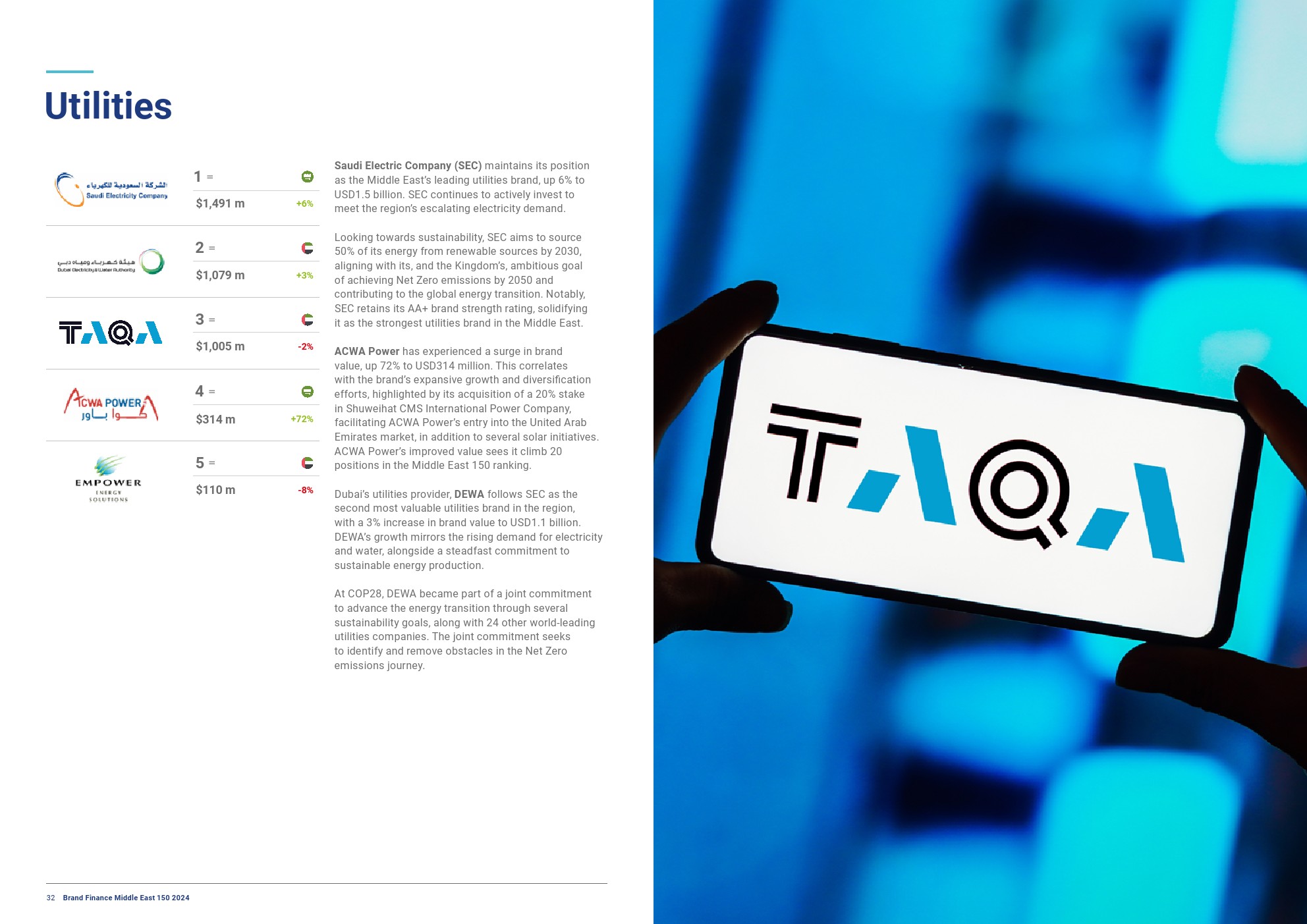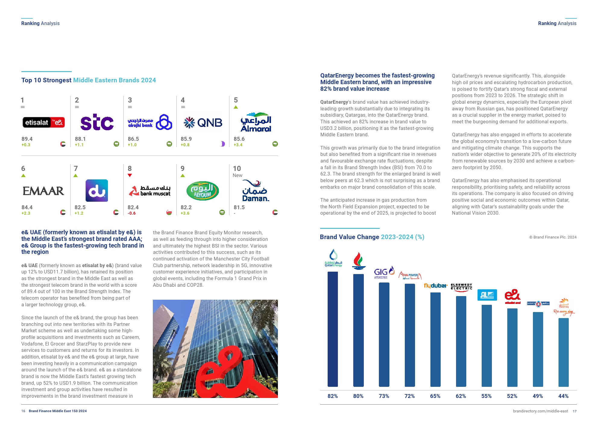 e& UAE(前身为etisalat by e&)是中东所有行业中最强大的品牌,品牌实力指数得分为89.4/100,评级为AAA。这也使它成为世界上最强大的电信品牌。这家电信运营商在规模更大的科技集团旗下蓬勃发展,通过其合作伙伴市场计划和战略收购,向新市场扩张。该公司还在宣传活动上进行了大量投资,以提高品牌知名度,并将该品牌从一家传统电信公司转型为一家全球科技公司。作为一个独立品牌,e&现在是中东增长最快的科技品牌,增长了52%。