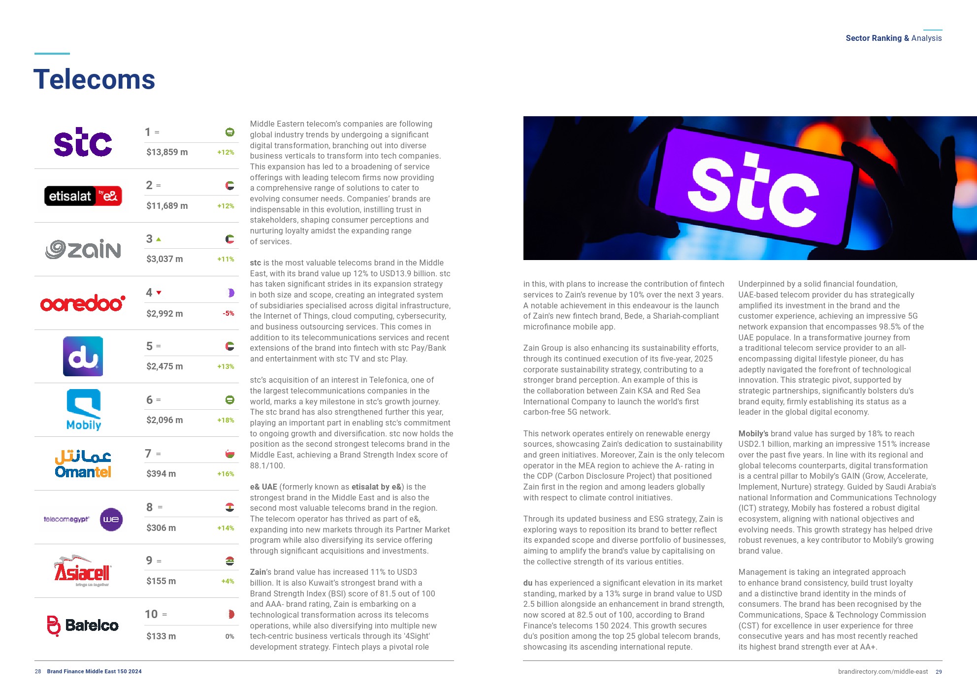 同为电信巨头的stc也采取了扩张性的增长战略,巩固了其作为该地区第二强大品牌的地位,品牌实力指数得分为88.1/100。该公司的品牌价值增长了12%,达到139亿美元,成为中东地区最有价值的电信品牌。