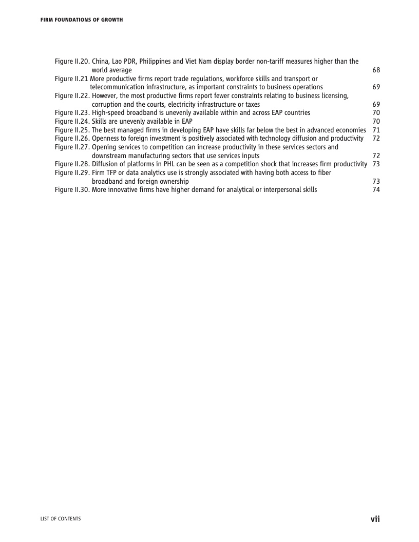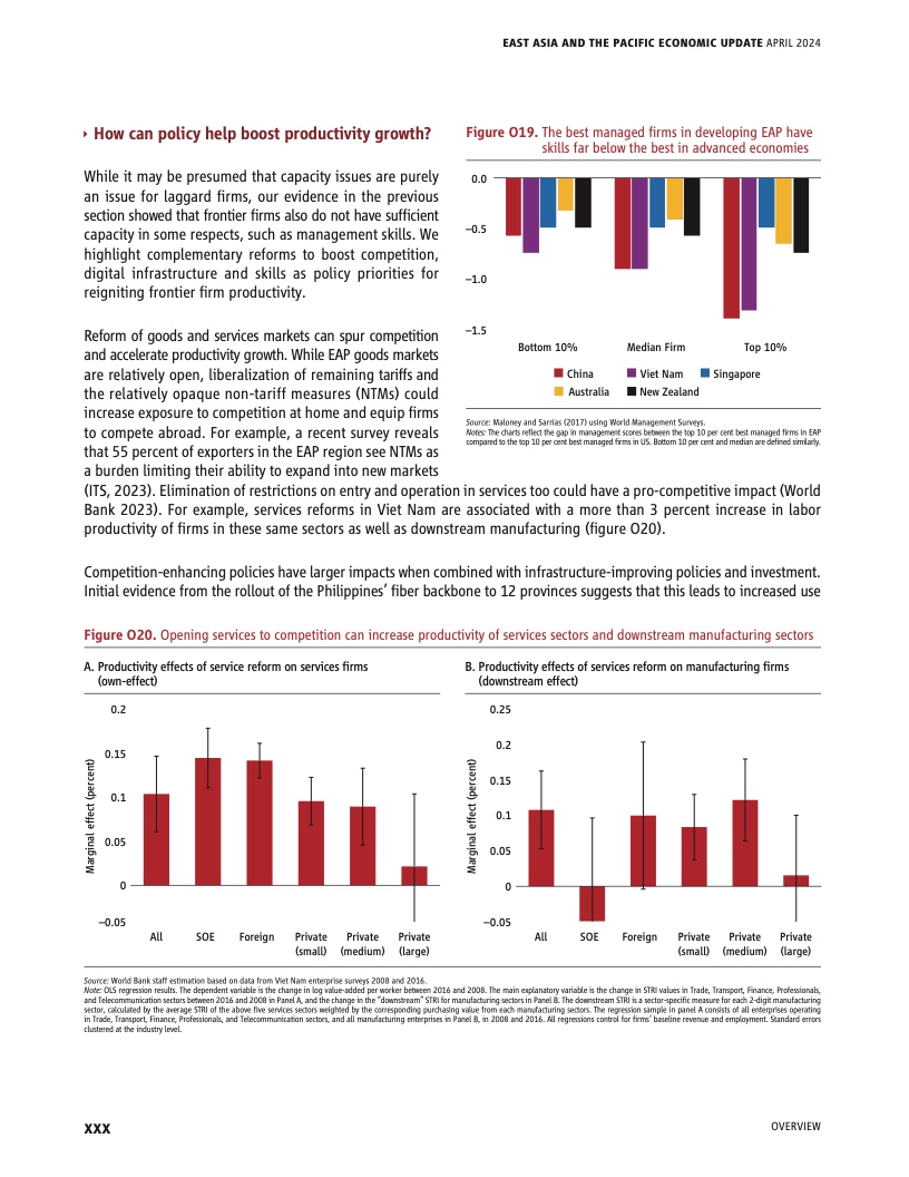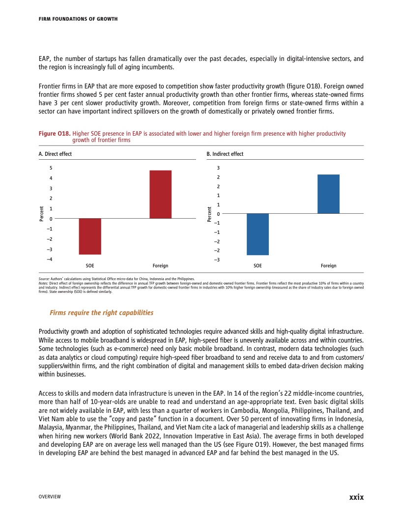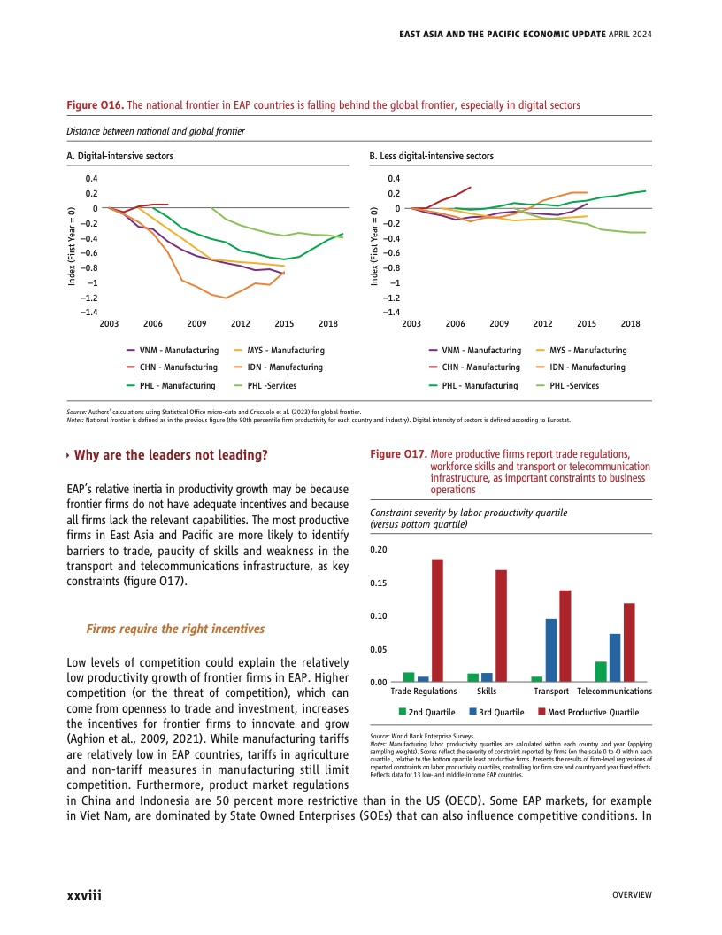 企业是生产力增长的基础。该地区私人投资疲软,生产率下降。一些生产率较低的企业开始追赶生产率较高的企业,但该地区的领先企业并未充分利用新技术,在生产率增长方面落后于全球领先企业。例如,2005 年至 2015 年间,全球前 5%的数字密集型制造业(如电子产品)的生产率增长速度是印度尼西亚、马来西亚、菲律宾和越南顶尖企业的 2.5 倍。因此,东亚和太平洋地区领先企业与全球领先企业之间的生产率差距扩大,特别是在数字密集型部门。