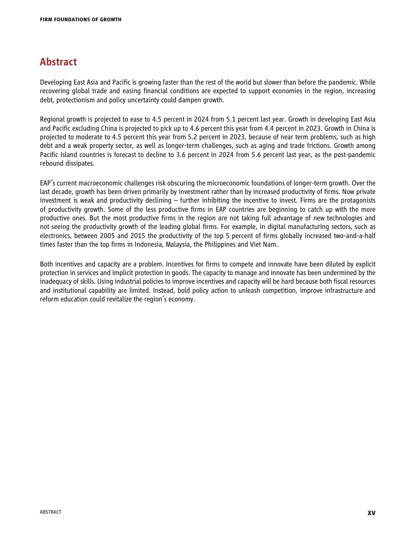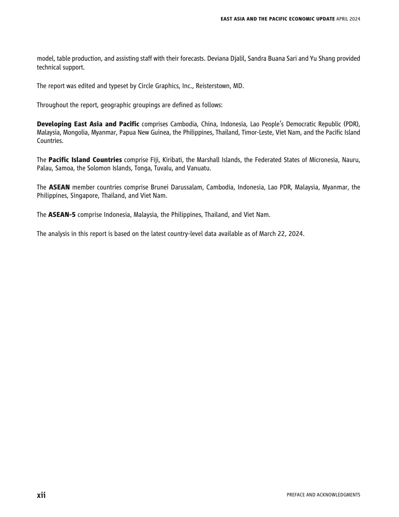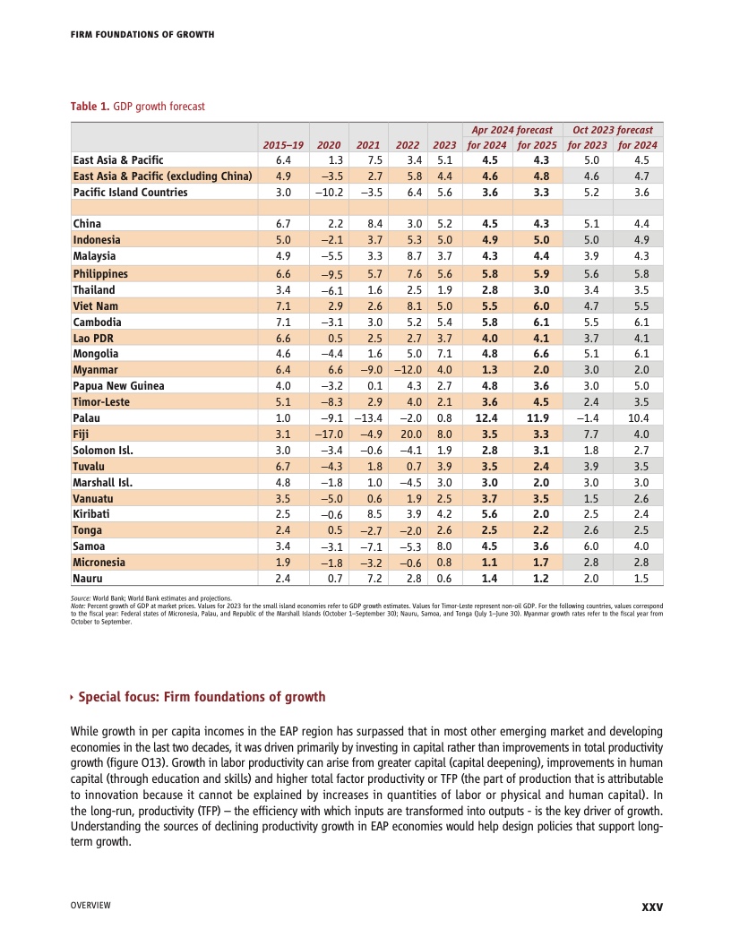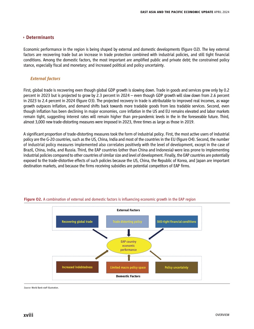 2023年,东亚和太平洋地区(EAP)的经济增长率达到 5.1%,高于其他新兴市场和发展中经济体,尽管存在高通胀、高利率和日益紧张的贸易关系(图 1)。然而,增长速度仍低于新冠疫情前的水平。更强劲的全球贸易和宽松的金融条件预计将支持该地区的经济,而债务增加、保护主义和政策不确定性可能会抑制增长。根据 3 月 31 日出版的《2024 年 4 月东亚及太平洋地区经济更新报告》(Firm Foundations of Growth),面对这些全球不利因素,该地区预计将保持增长,但 2024 年的增长率预计将放缓至 4.5%。