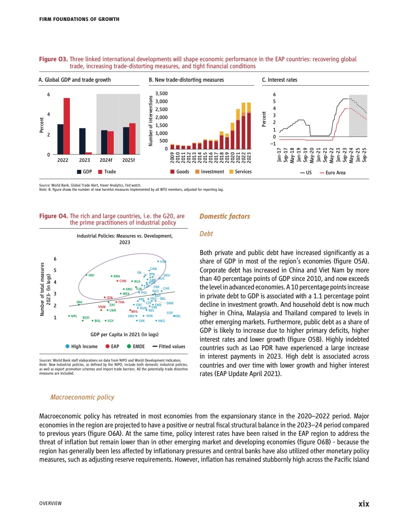 三个外部发展态势将影响本区域的经济表现:全球贸易复苏、贸易扭曲加剧和金融条件紧缩。尽管全球 GDP 增长放缓,但全球贸易正在复苏。商品和服务贸易在 2023 年几乎停滞不前,预计 2024 年将增长 2.3%。近年来,可能不利于贸易的产业政策,包括本地含量要求的使用急剧增加,这可能会损害发展中经济伙伴的出口(图 2)。主要经济体的通胀率已经下降,但美国和欧盟的核心通胀率仍然很高,劳动力市场紧张,这表明全球利率在几年内仍将高于新冠疫情发生前的水平。