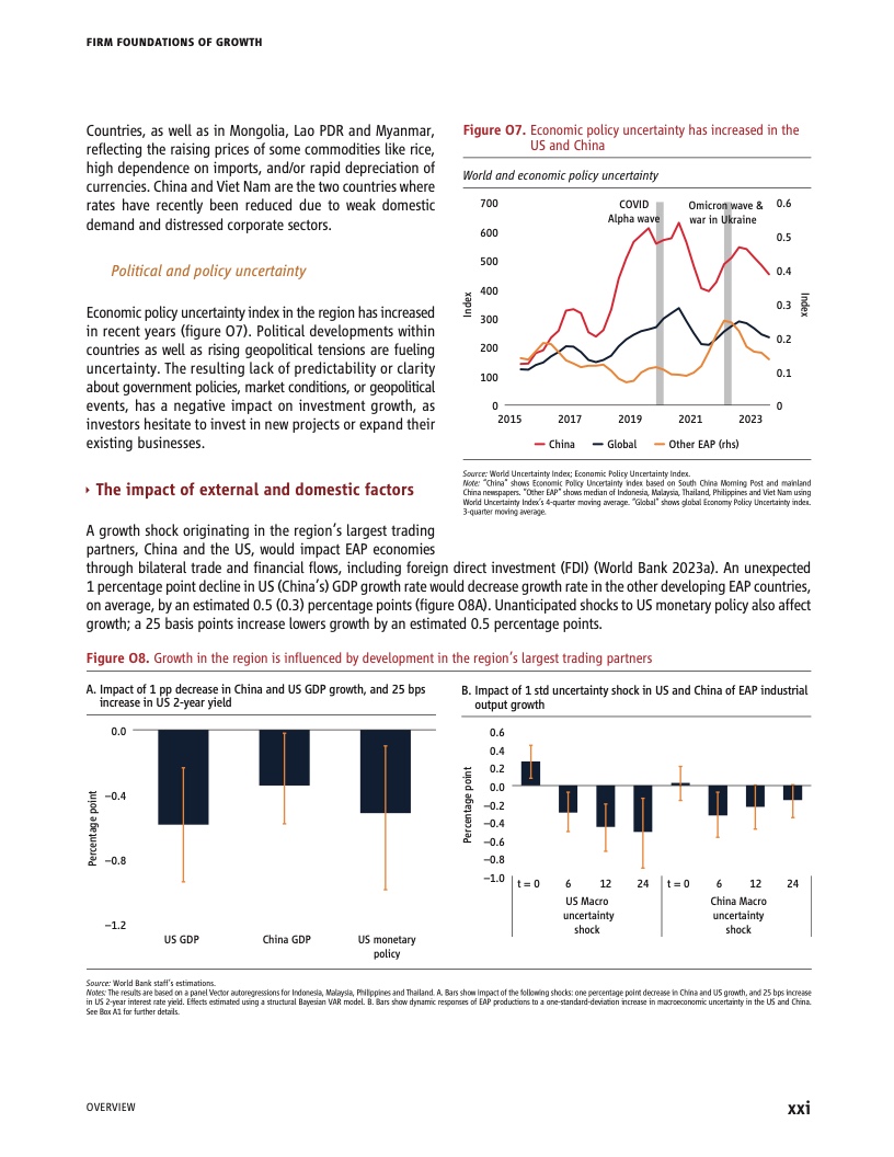债务、财政和货币政策的限制以及政策不确定性的增加也会影响增长前景。本区域大多数经济体的私人债务和公共债务都大幅增加。目前,菲律宾和泰国的政府债务占国内生产总值的比重比新冠疫情发生前高 20 个百分点。大多数经济体的宏观经济政策已从 2020-22 年采取的扩张性立场回落,并提高了政策利率以应对通胀威胁(图 3)。经济政策的不确定性也有所增加,使投资者不愿投资新项目或扩大现有业务。