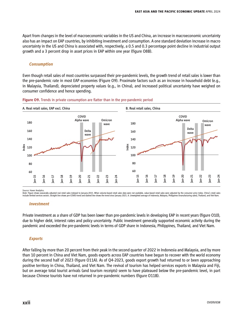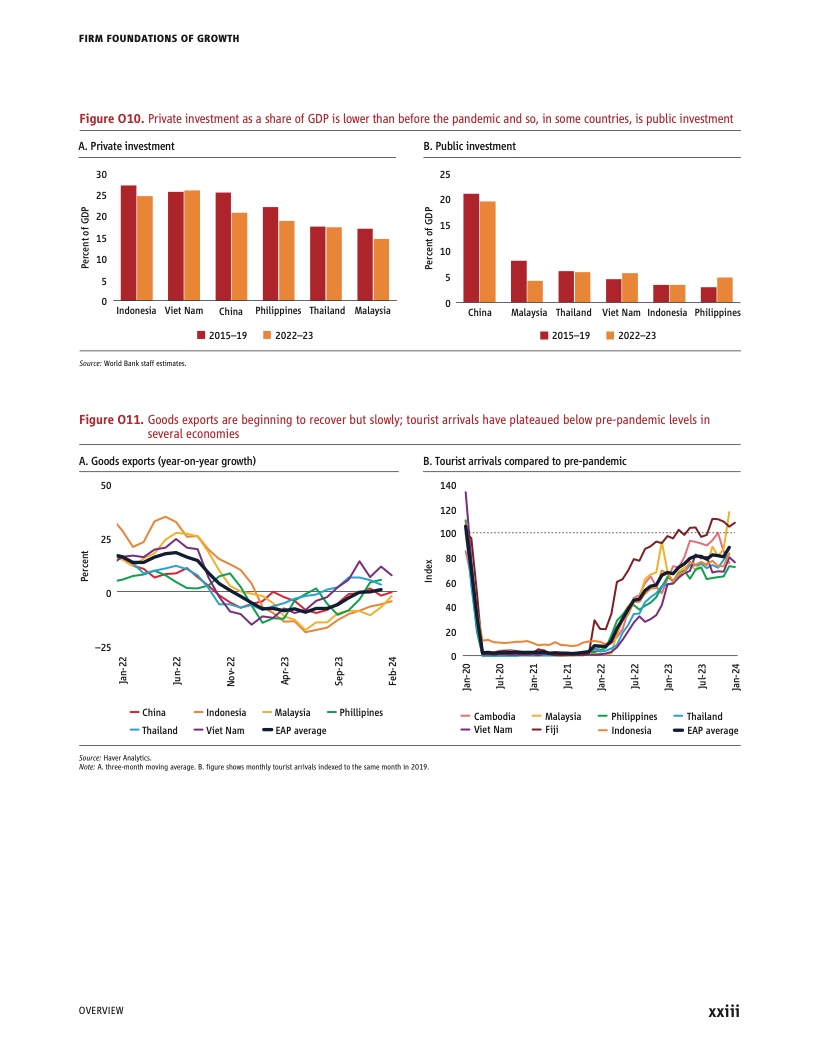 最近发布的2024年预测显示,区域内的增长存在差异。目前,东亚主要经济体的人均产出高于新冠疫情前的水平,但许多太平洋岛屿经济体的人均产出仍低于新冠疫情前的水平。