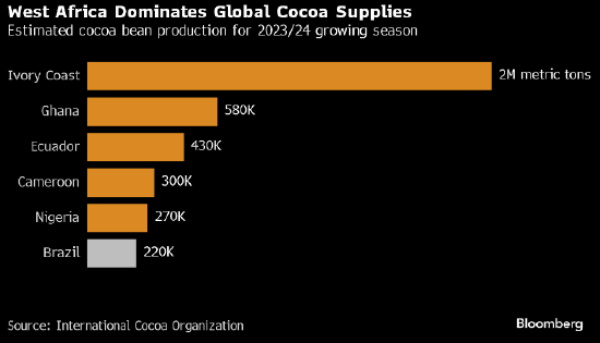 这种集中在两个国家的情况,使全球供应更容易受到恶劣天气和作物病害等风险的影响,随着天气波动变得更加极端,这些风险只会加剧。西非最近的可可生产短缺,导致今年全球可可价格上涨了一倍多,并推高了巧克力棒的消费价格,甚至迫使一些巧克力制造商关闭。