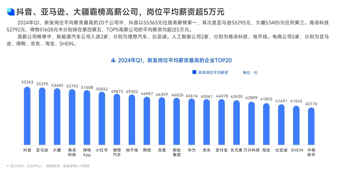 近日,脉脉高聘人才智库发布的《2024春招高薪职业和人才洞察》报告显示,抖音、亚⻢逊、大疆霸榜高薪公司,岗位平均薪资超5万元(月薪)。数据显示,2024年Q1,新发岗位平均薪资最高的20个公司中,抖音以55363元位居高薪榜第⼀,其次是亚马逊55295元,大疆53485元位列第三。