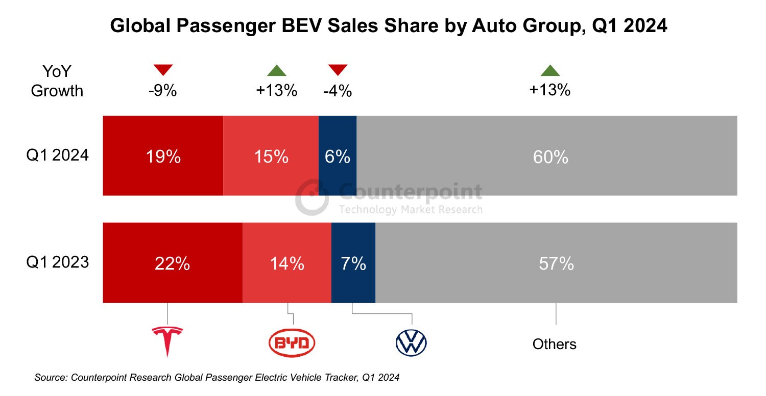2024年第一季度特斯拉销量同比下降了9%,但重新夺回了纯电动汽车销量的榜首位置,占19%的市场份额。紧随其后的是比亚迪集团和大众集团。值得注意的是,在排名前三的原始设备制造商中,只有比亚迪实现了增长(同比增长13%),而特斯拉和大众分别出现了9%和4%的同比下滑。