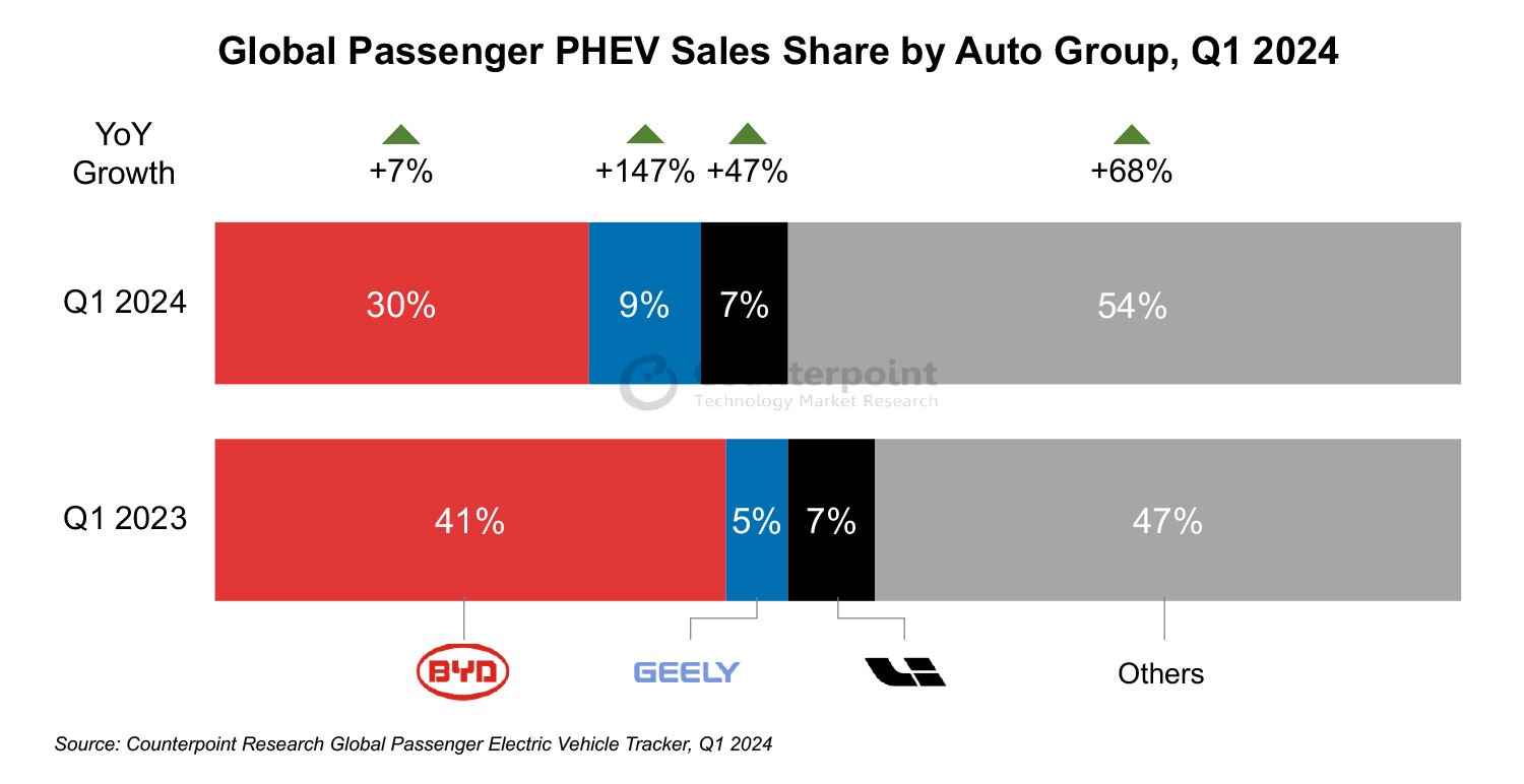根据Counterpoint的报告,2024年第一季度,全球乘用车(BEV+PHEV)销量同比增长18%。纯电动汽车销量同比增长7%,而插电式混合动力汽车销量同比增长46%。