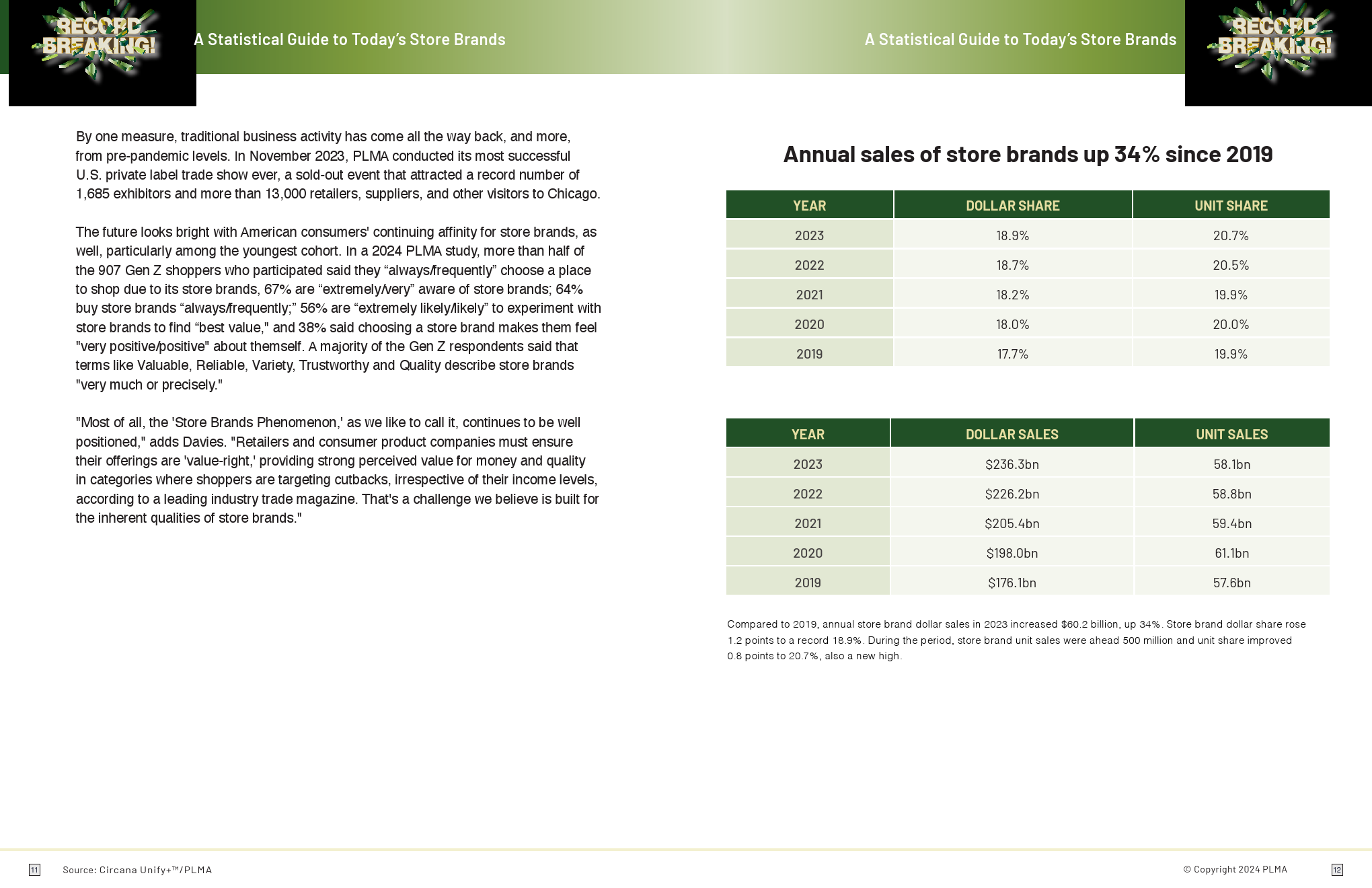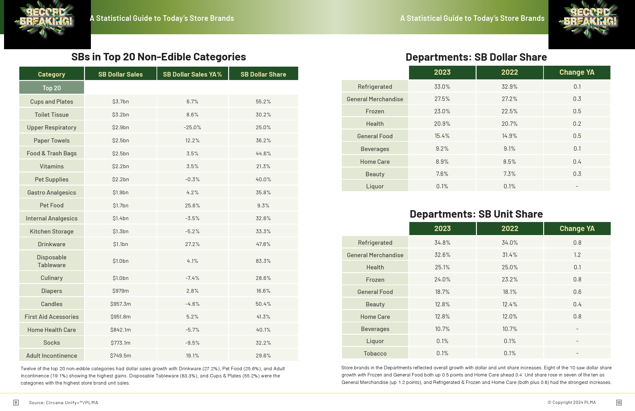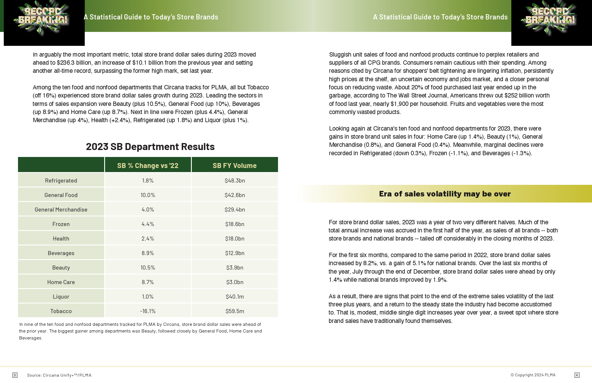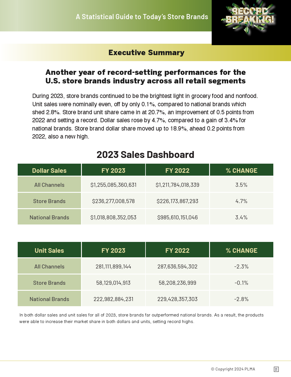 2023年,商店自有品牌继续成为食品杂货和非食品行业最亮眼的。名义上的销量持平,仅下降了0.1%,而美国全国品牌则下降了2.8%。自有品牌单位份额为20.7%,比2022年提高了0.5个百分点,创下了历史新高。销售额增长了4.7%,而全国品牌的销售额增长了3.4%。自有品牌销售份额上升至18.9%,比2022年高出0.2个百分点,同样创下新高。