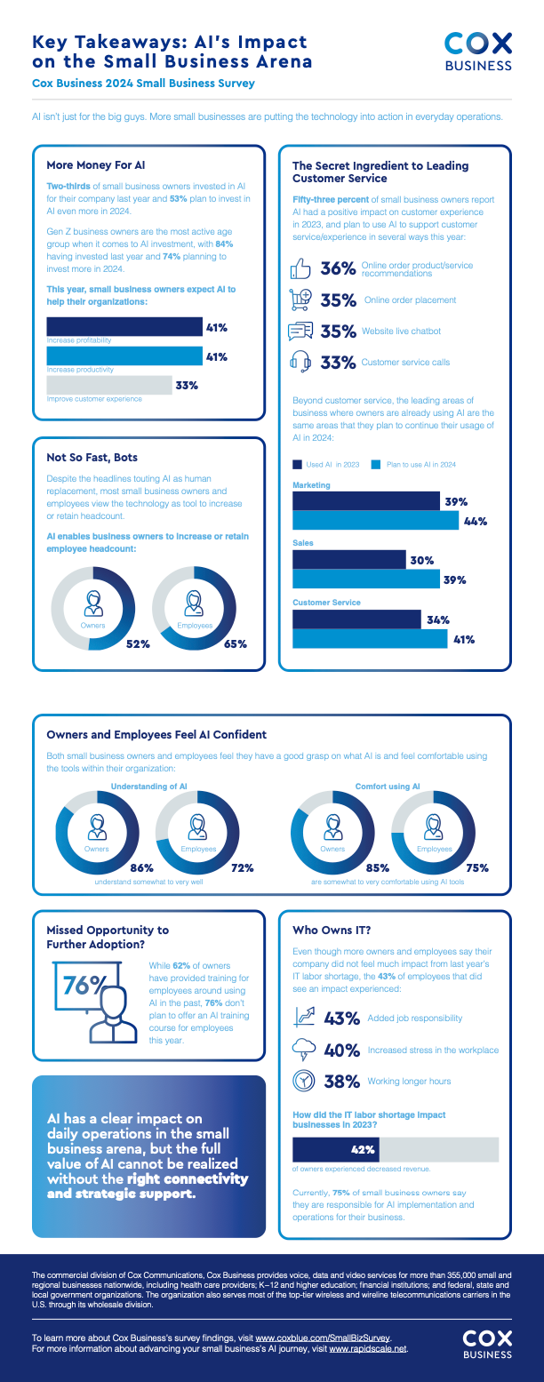 Cox Business对小企业主和员工进行了调查,以更好地了解他们在工作场所对人工智能的使用情况和看法。52%的小企业主表示,人工智能使他们能够增加或留住员工,65%的小企业员工也这么说。