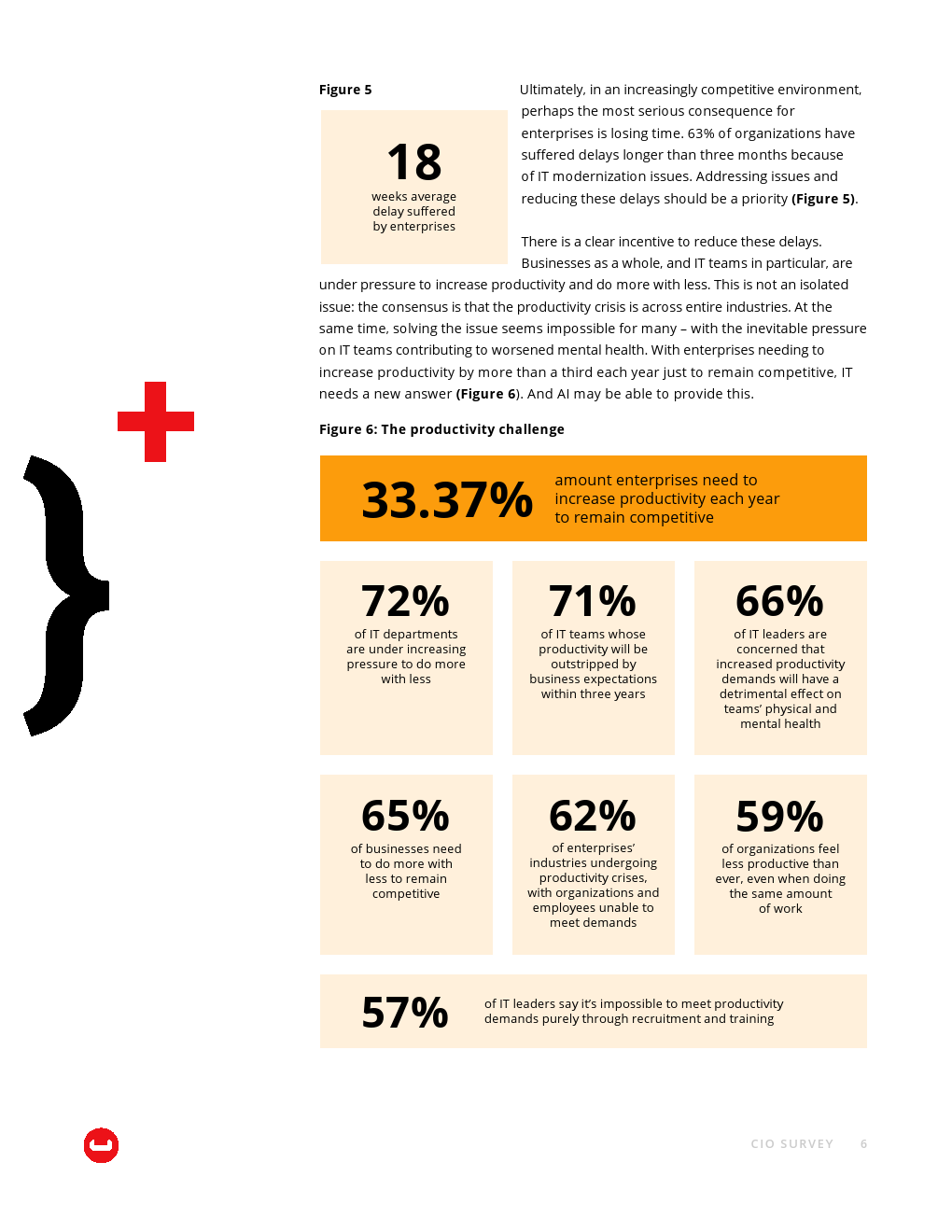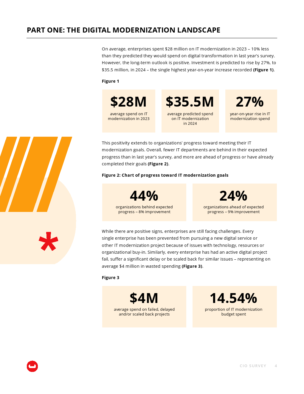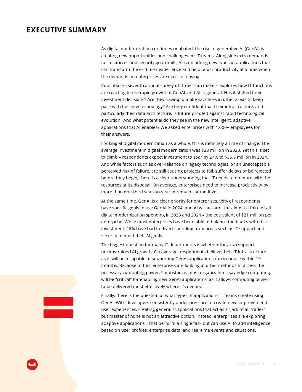 根据Couchbase的调查,从数字现代化的整体来看,这绝对是一个变革的时代。2023年,数字现代化的平均投资为2800万美元。预计2024年,投资将飙升27%,达到3550万美元。尽管诸如过度依赖遗留技术,或不可接受的失败风险等因素仍然可能导致项目失败,遭受延迟或在开始之前被拒绝,但人们清楚地认识到IT需要更多地利用其掌握的资源。平均而言,企业需要将生产率同比提高1/3以上才能保持竞争力。