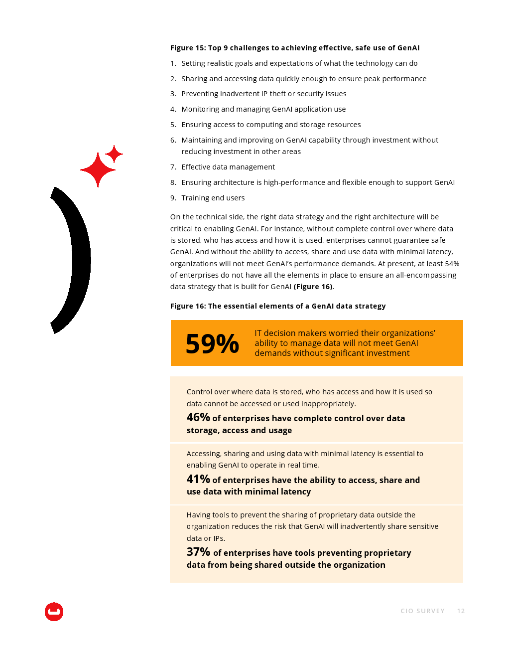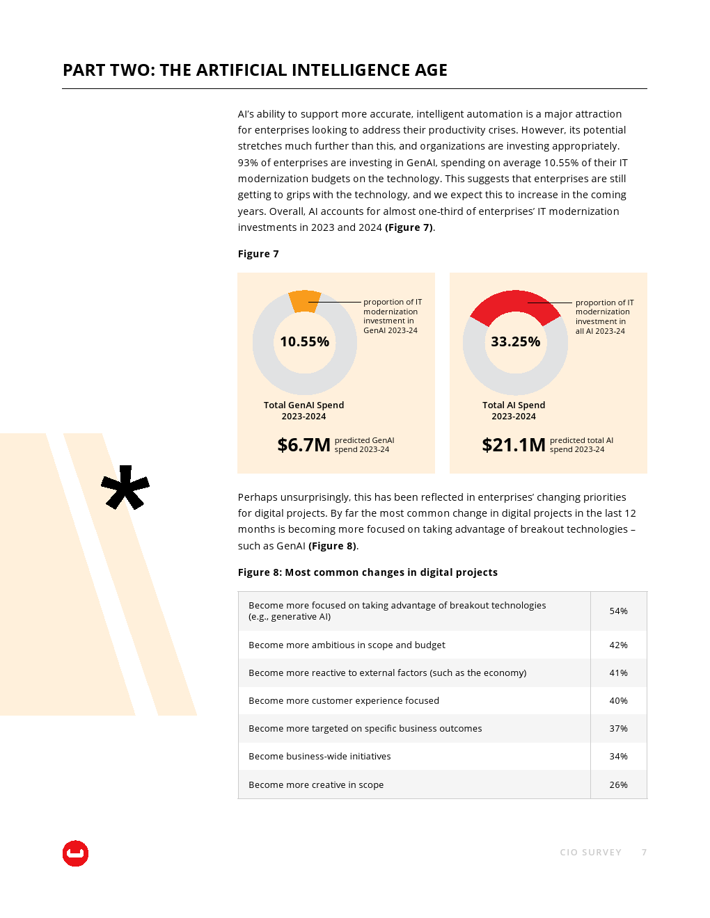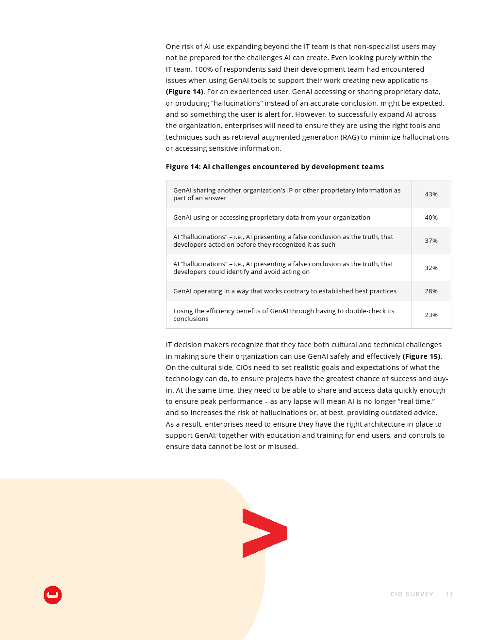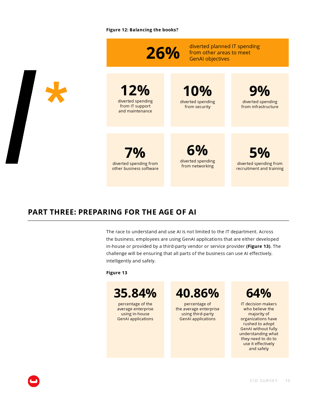 同时,GenAI显然是企业的优先选择。98%的受访者有在2024年使用GenAI的具体目标,人工智能占2023年和2024年所有数字现代化支出的近1/3,相当于每家企业2100万美元。虽然大多数企业能够通过这项投资平衡账目,但26%的企业不得不从IT支持和安全等领域转移支出,以实现其人工智能目标。