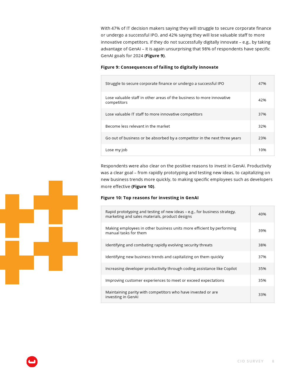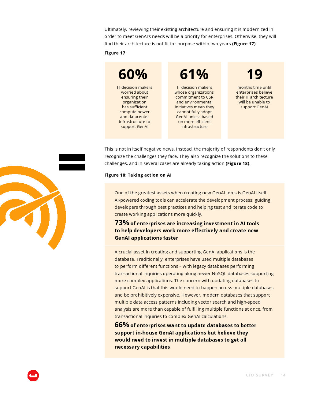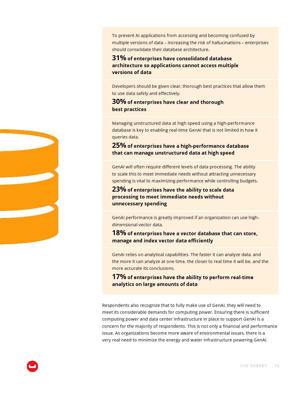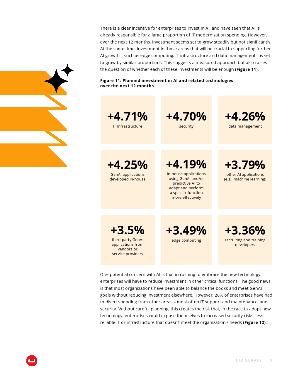 同时,GenAI显然是企业的优先选择。98%的受访者有在2024年使用GenAI的具体目标,人工智能占2023年和2024年所有数字现代化支出的近1/3,相当于每家企业2100万美元。虽然大多数企业能够通过这项投资平衡账目,但26%的企业不得不从IT支持和安全等领域转移支出,以实现其人工智能目标。