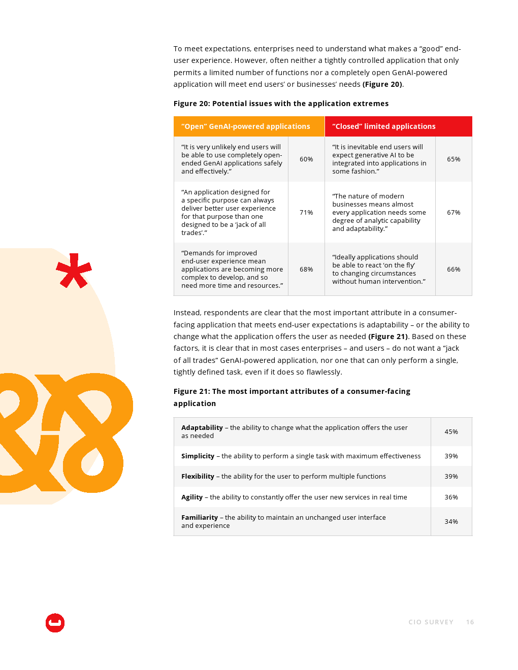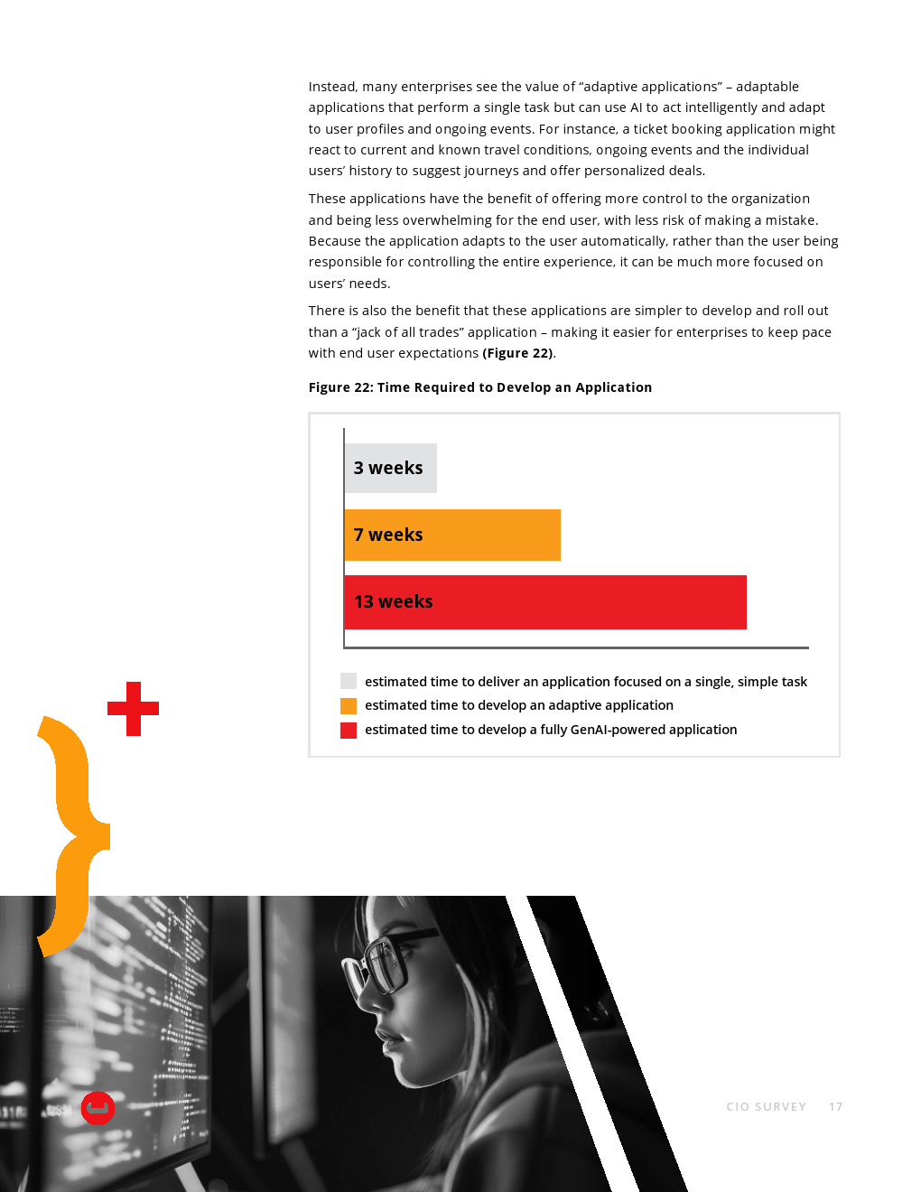 最后,还有IT团队使用GenAI创建什么类型的应用程序的问题。由于开发人员一直面临着创造全新的、改进的终端用户体验的压力,所以创建“万事通”但样样都不精通的通用应用程序并不是一个有吸引力的选择。相反,企业正在探索自适应应用程序,但可以使用人工智能来添加基于用户配置文件、企业数据和实时事件和情况的智能。