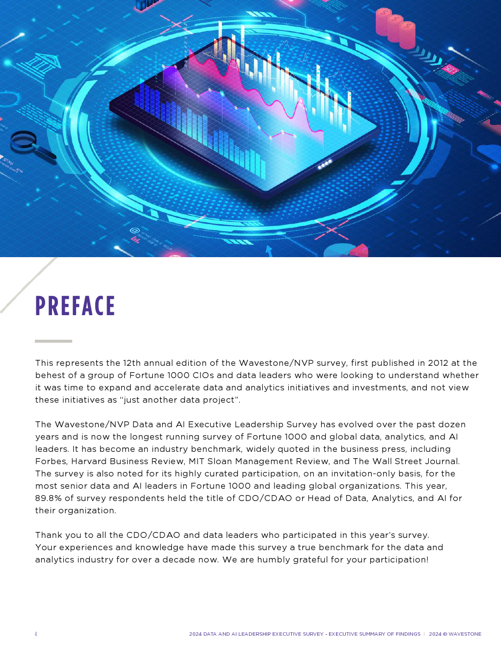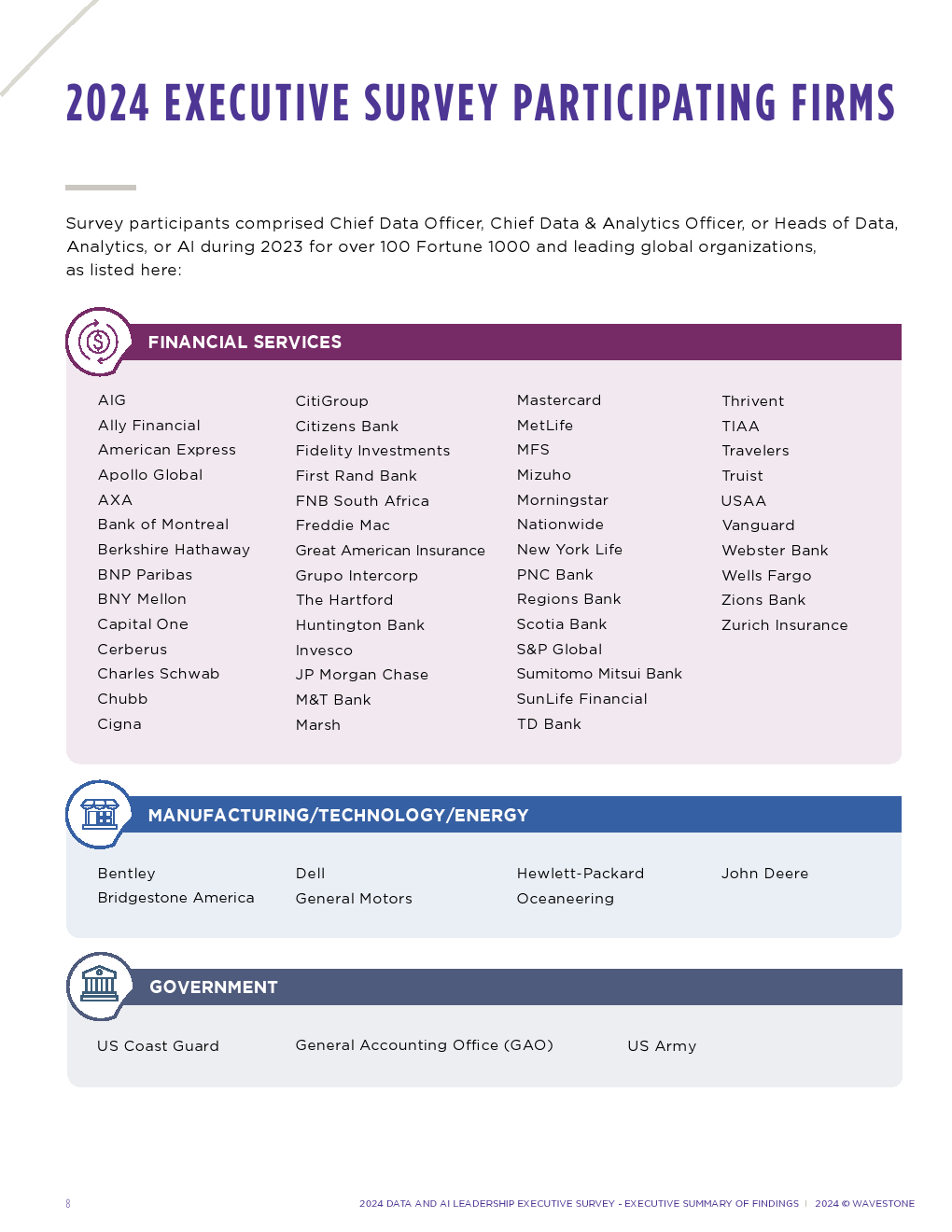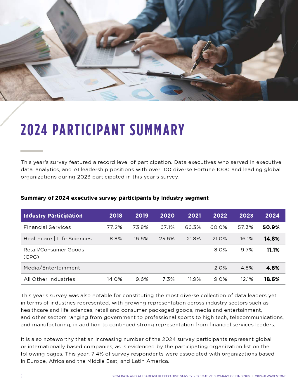 调查显示,参与人数达到了创纪录的水平。在2023年期间,在100多家不同的财富1000强和领先的全球组织中担任执行数据、分析和人工智能领导职位的数据高管参加了今年的调查。