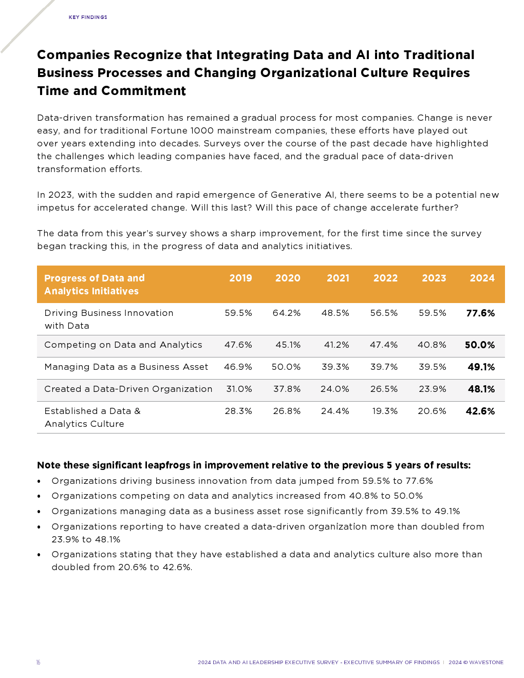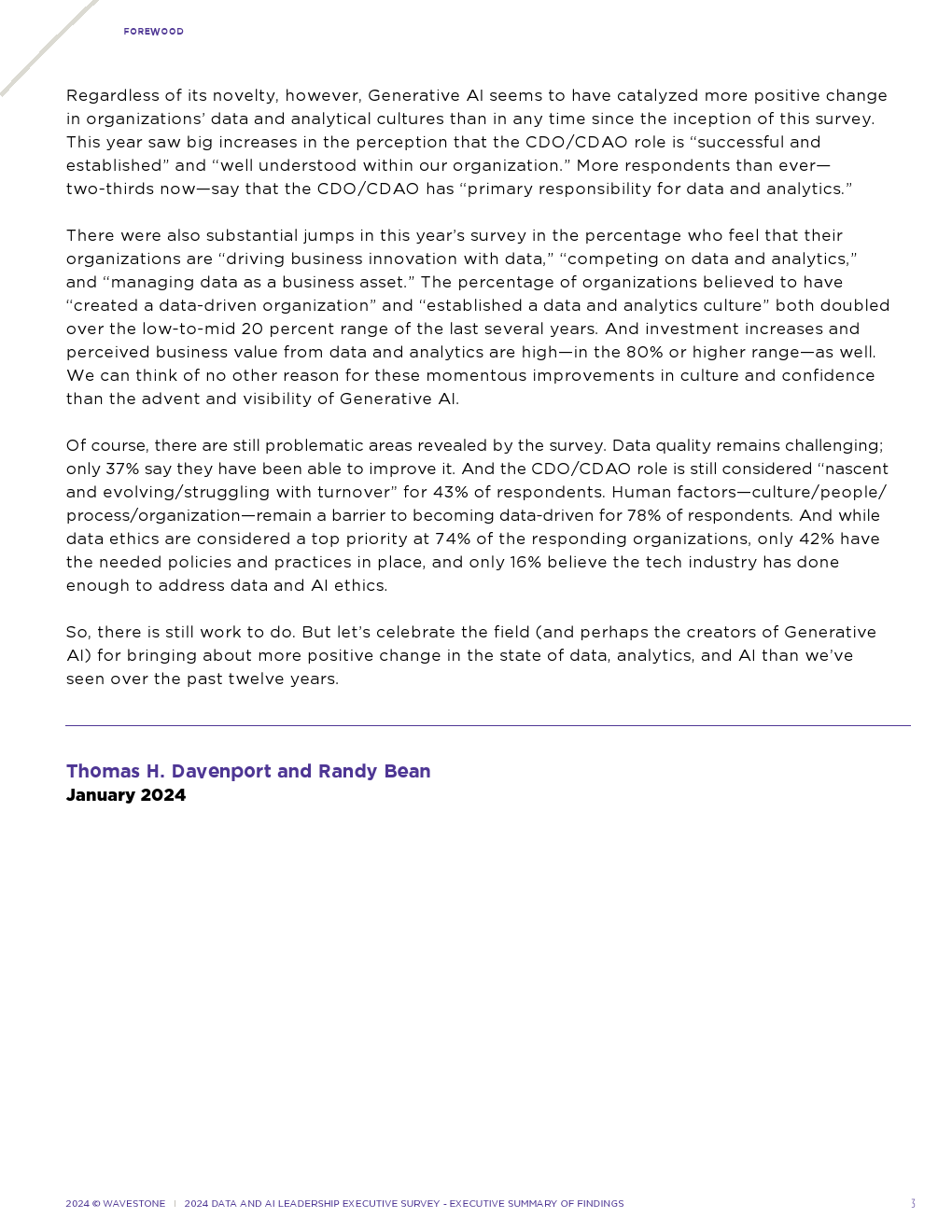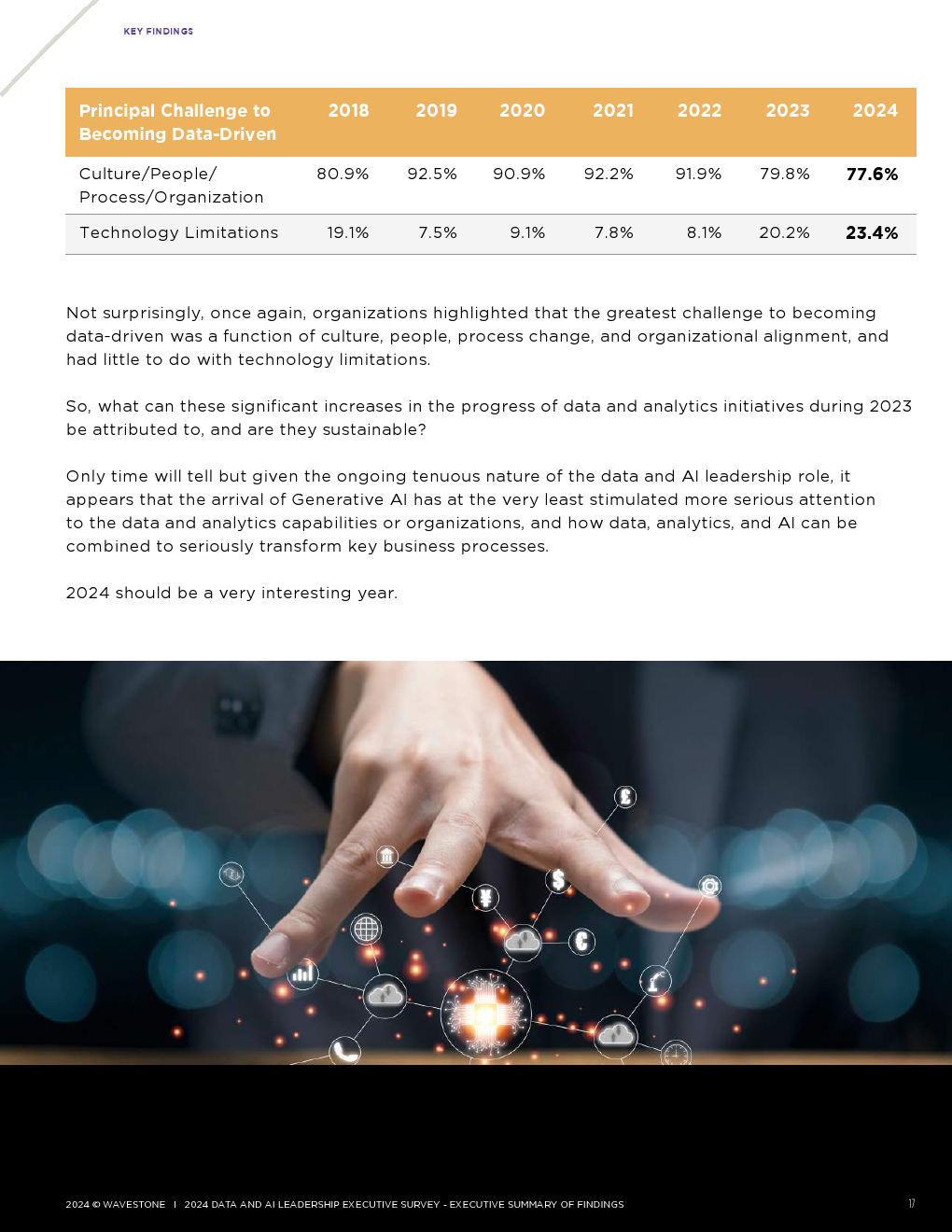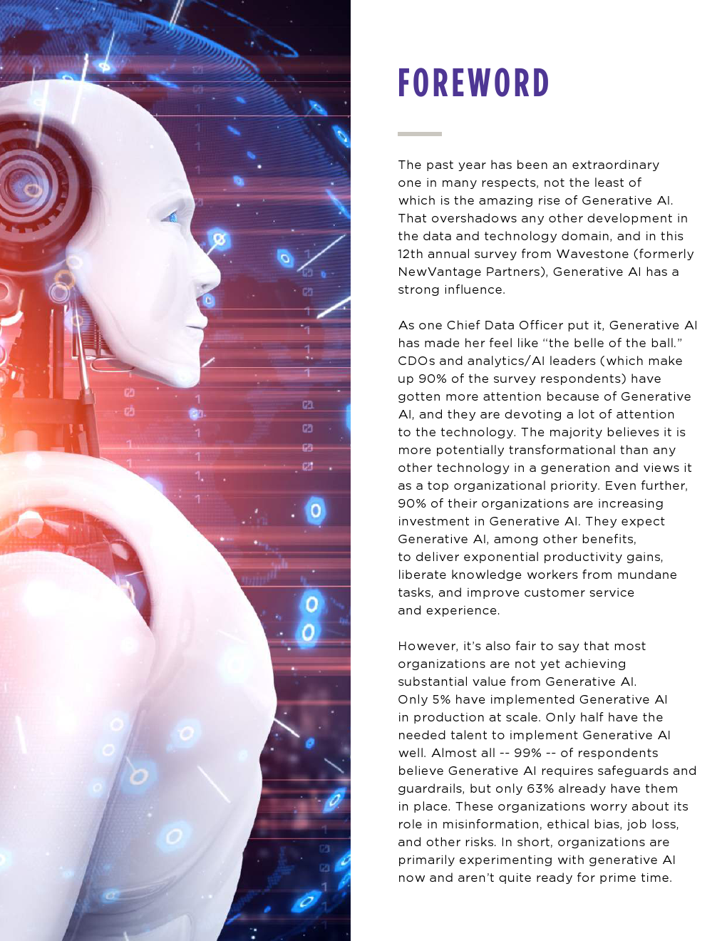 调查显示,参与人数达到了创纪录的水平。在2023年期间,在100多家不同的财富1000强和领先的全球组织中担任执行数据、分析和人工智能领导职位的数据高管参加了今年的调查。