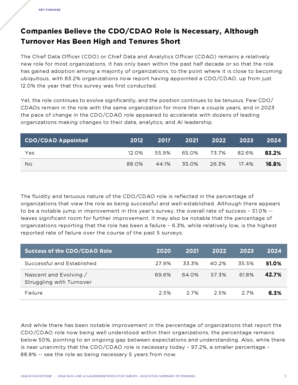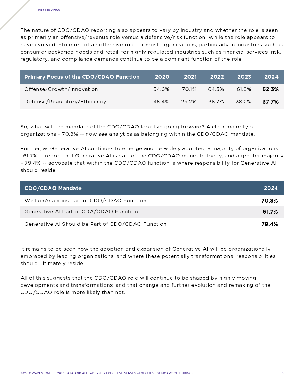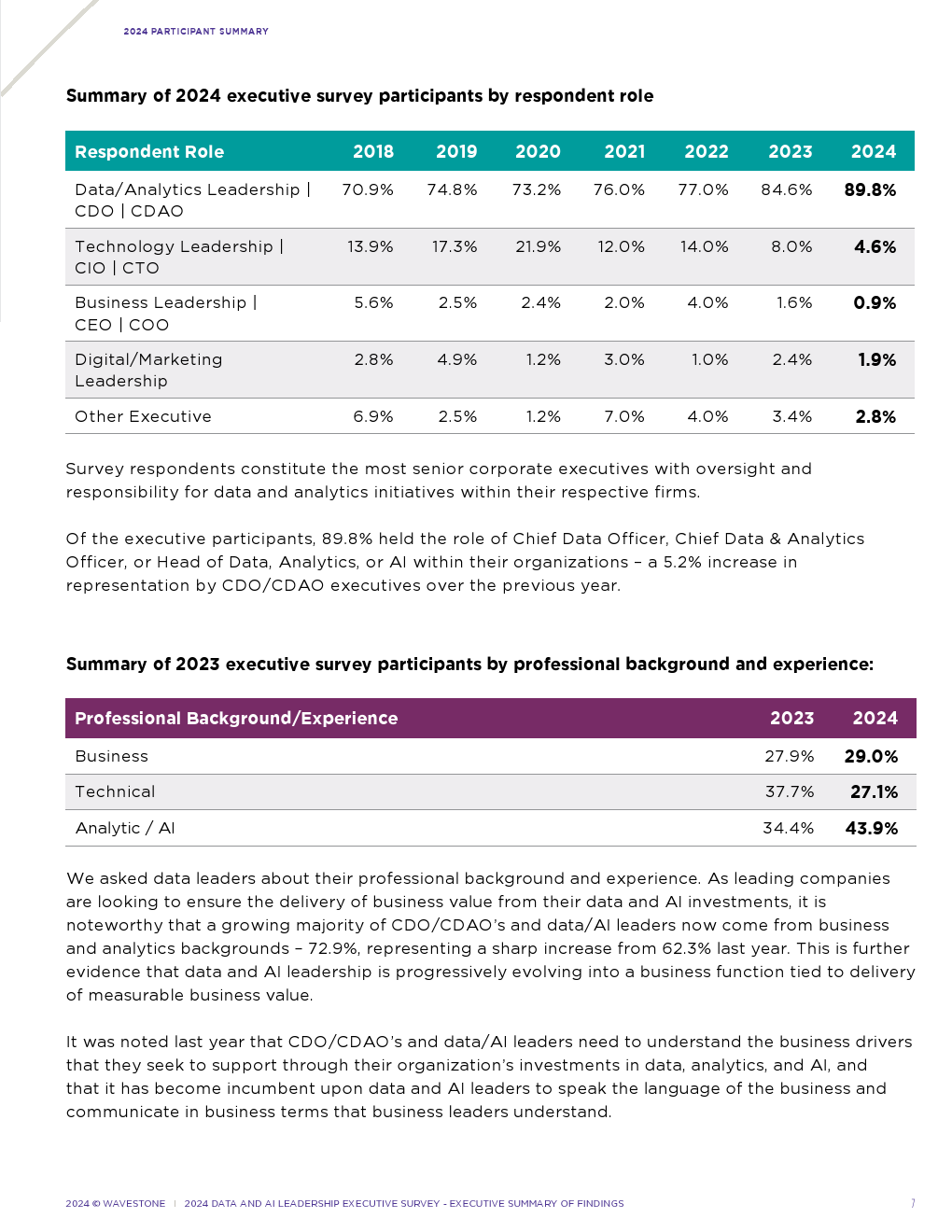 在高管参与者中,89.8%的人在其组织内担任首席数据官、首席数据与分析官或数据、分析或人工智能主管,CDO/CDAO高管的比例比前一年增长了5.2%。