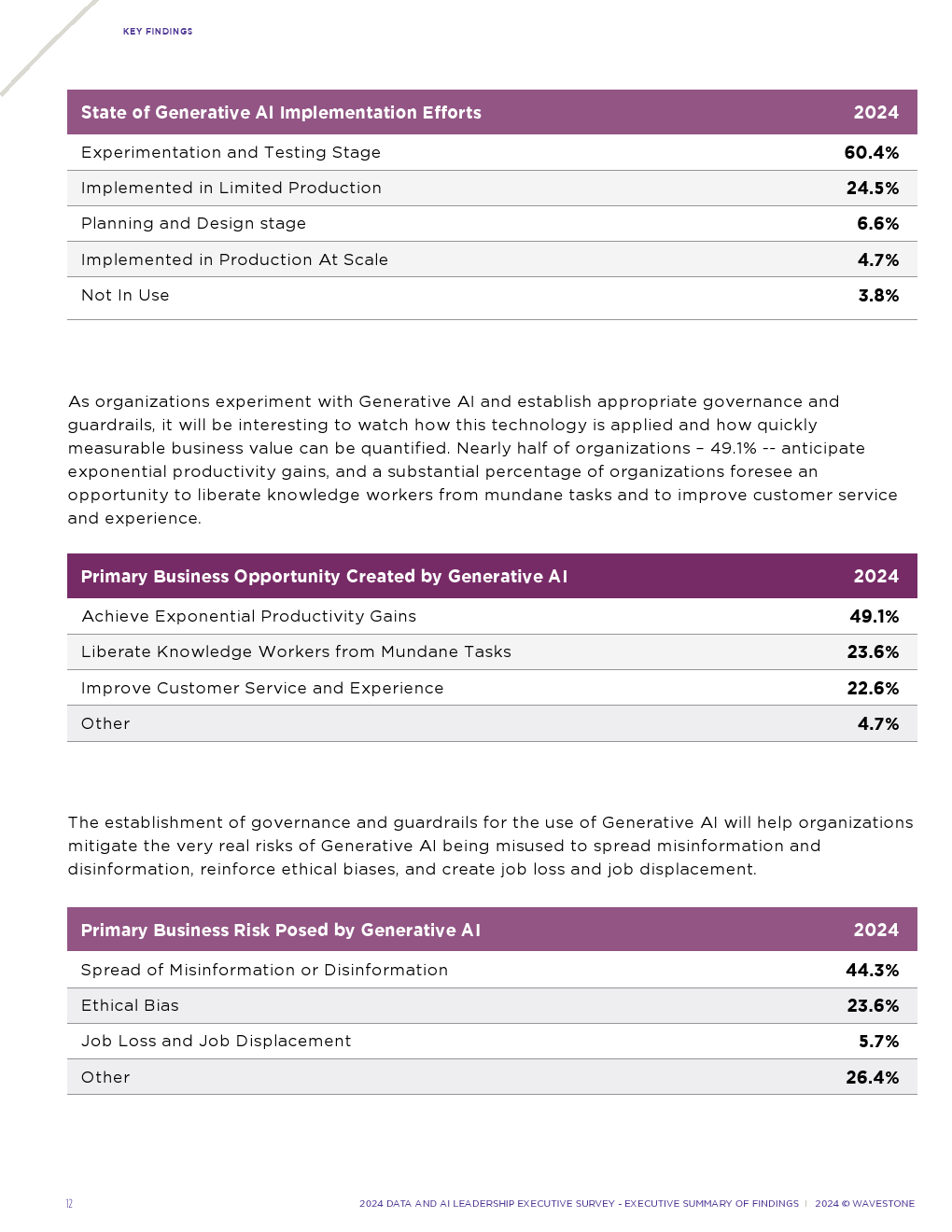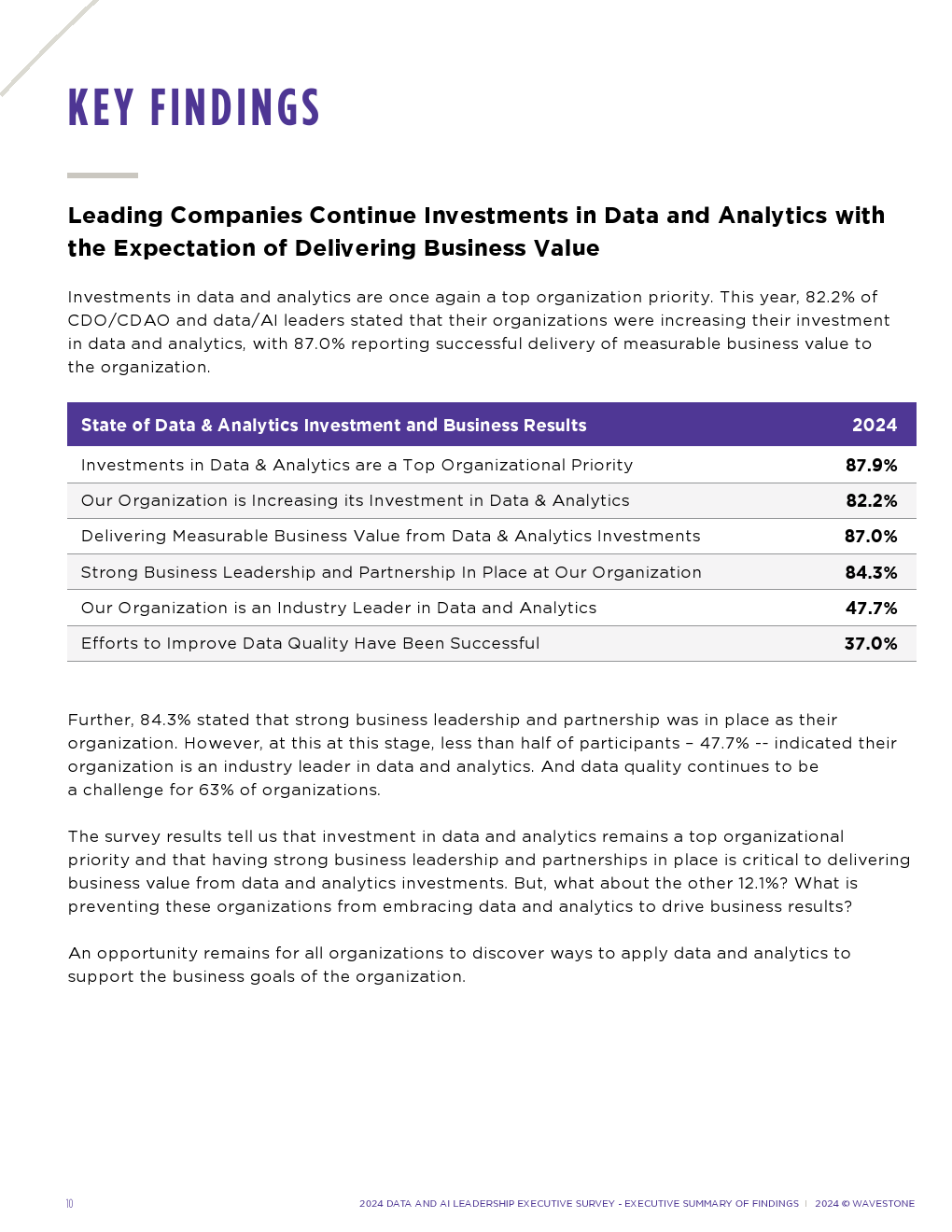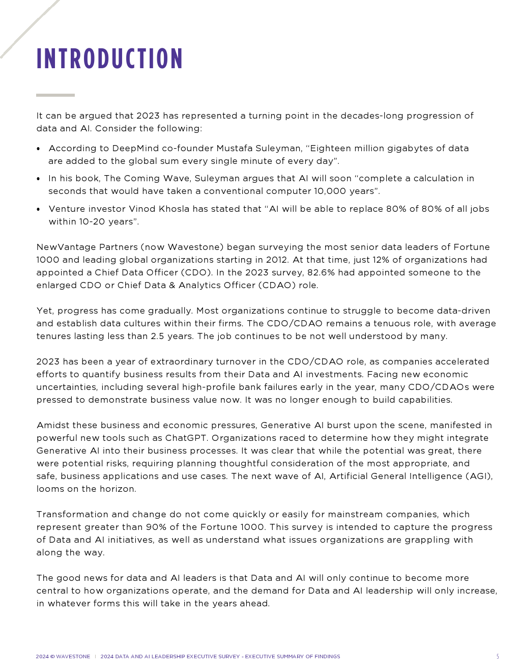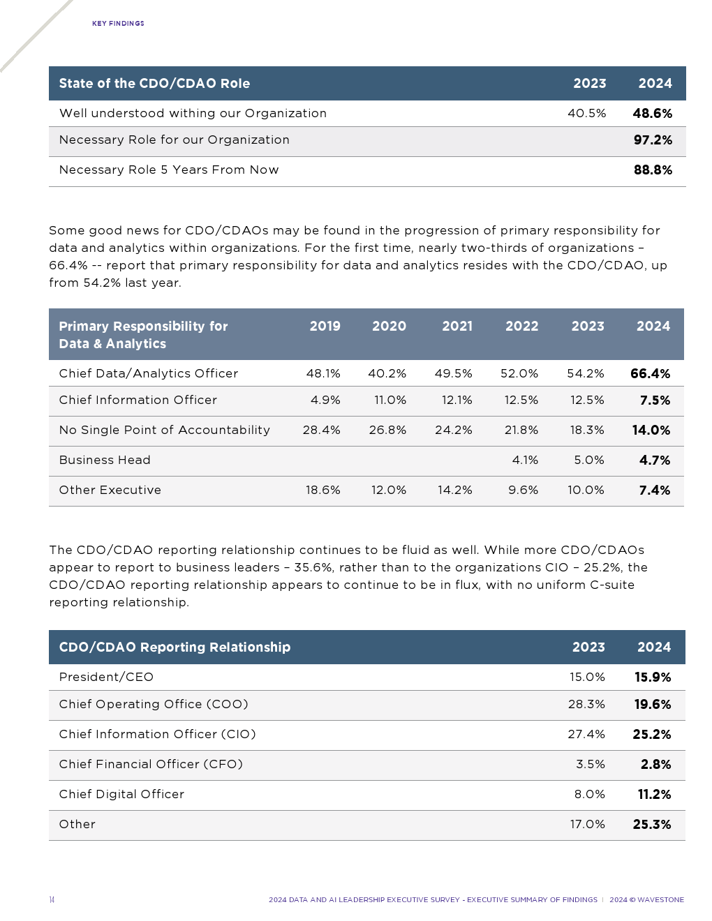 在高管参与者中,89.8%的人在其组织内担任首席数据官、首席数据与分析官或数据、分析或人工智能主管,CDO/CDAO高管的比例比前一年增长了5.2%。
