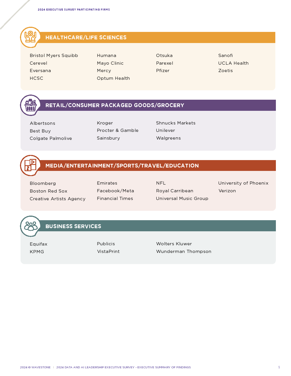 今年的调查还值得注意的是,就所代表的行业而言,数据领导者的集合最为多样化,在医疗保健和生命科学、零售和包装消费品、媒体和娱乐以及从政府到专业体育、高科技、电信和制造业等其他行业的代表性不断增加,此外,金融服务领导者的代表性继续保持强劲。