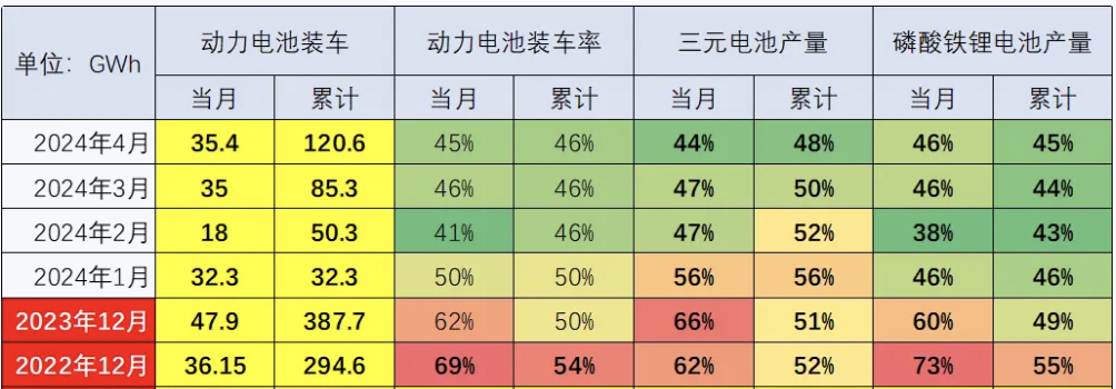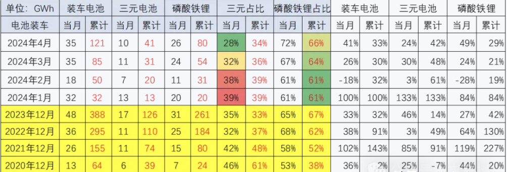 然而,2024年4月锂电池装车量同比增长41%,其中三元电池占比28%,磷酸铁锂电池占比66%,显示出三元电池增长放缓的趋势。