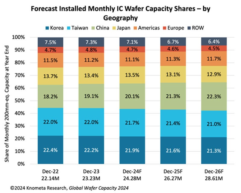 报告显示,2023年底产能占比为韩国22.2%、中国台湾22.0%、中国大陆19.1%、日本13.4%、美国11.2%、欧洲4.8%。展望未来,预计中国的份额将逐步增加,并有可能在2026年成为按国家/地区划分的最大份额。另一方面,日本的份额预计将从2023年的13.4%下降到2026年的12.9%。