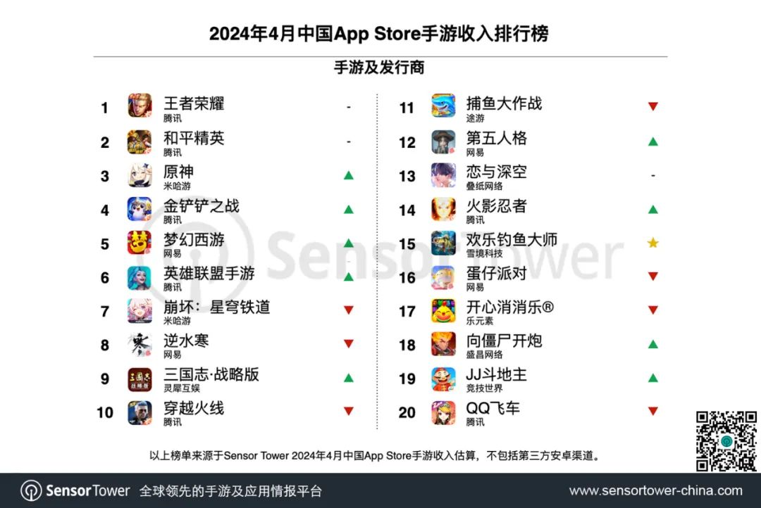 随着5.1版本更新,新英雄卡莉丝塔、新皮肤等上线,《英雄联盟手游》收入迎来又一轮峰值,4月游戏内购收入环比提升24%,位列国内iOS手游畅销榜第6名。