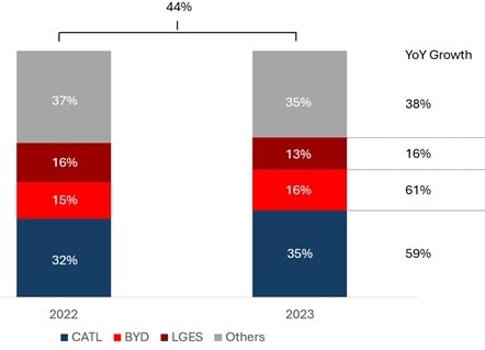 2023年全球电动汽车电池装机容量同比增长44%,宁德时代和比亚迪作为中国电池制造商的代表,拿下了超过三分之二的市场份额,其中宁德时代是最大的受益者。
