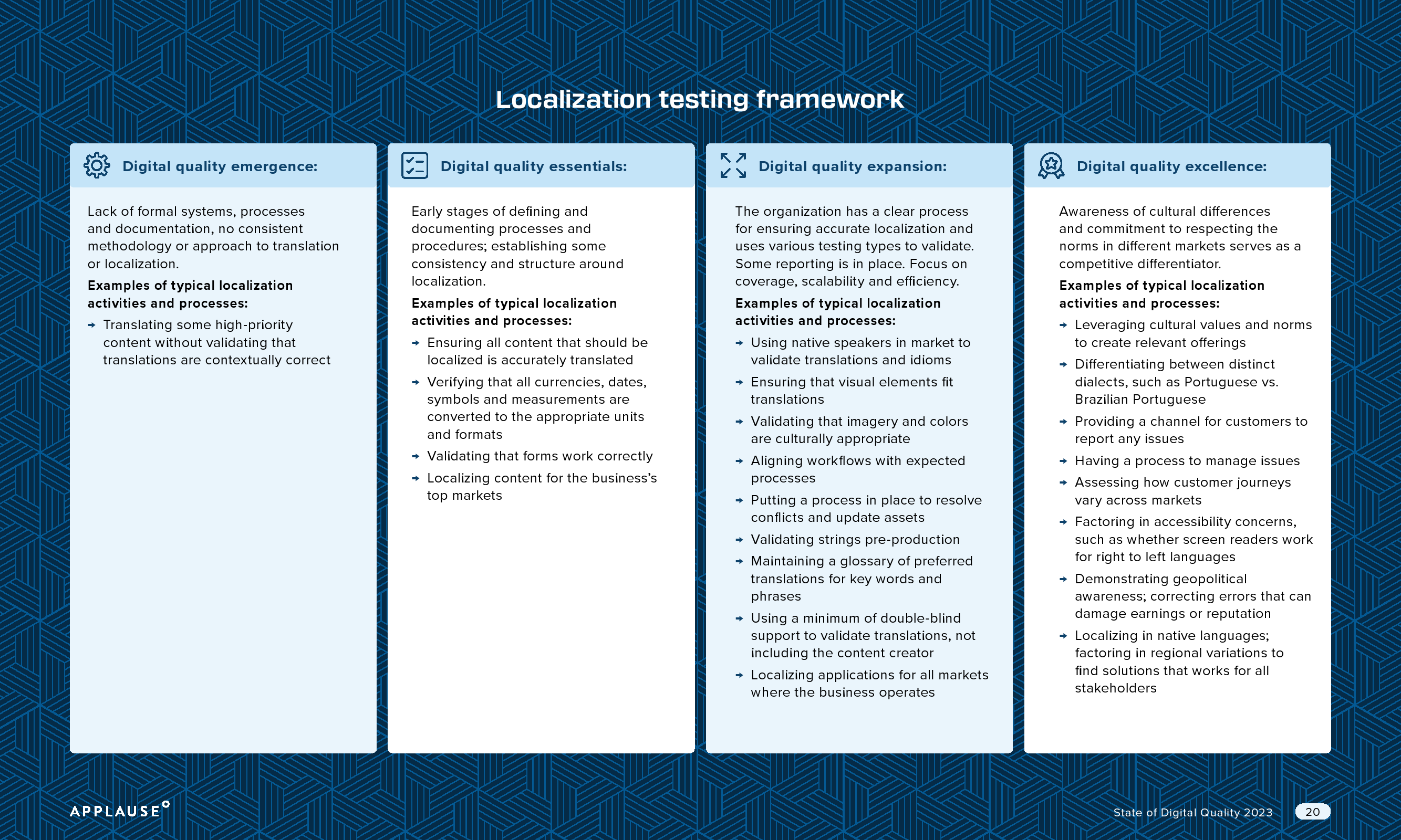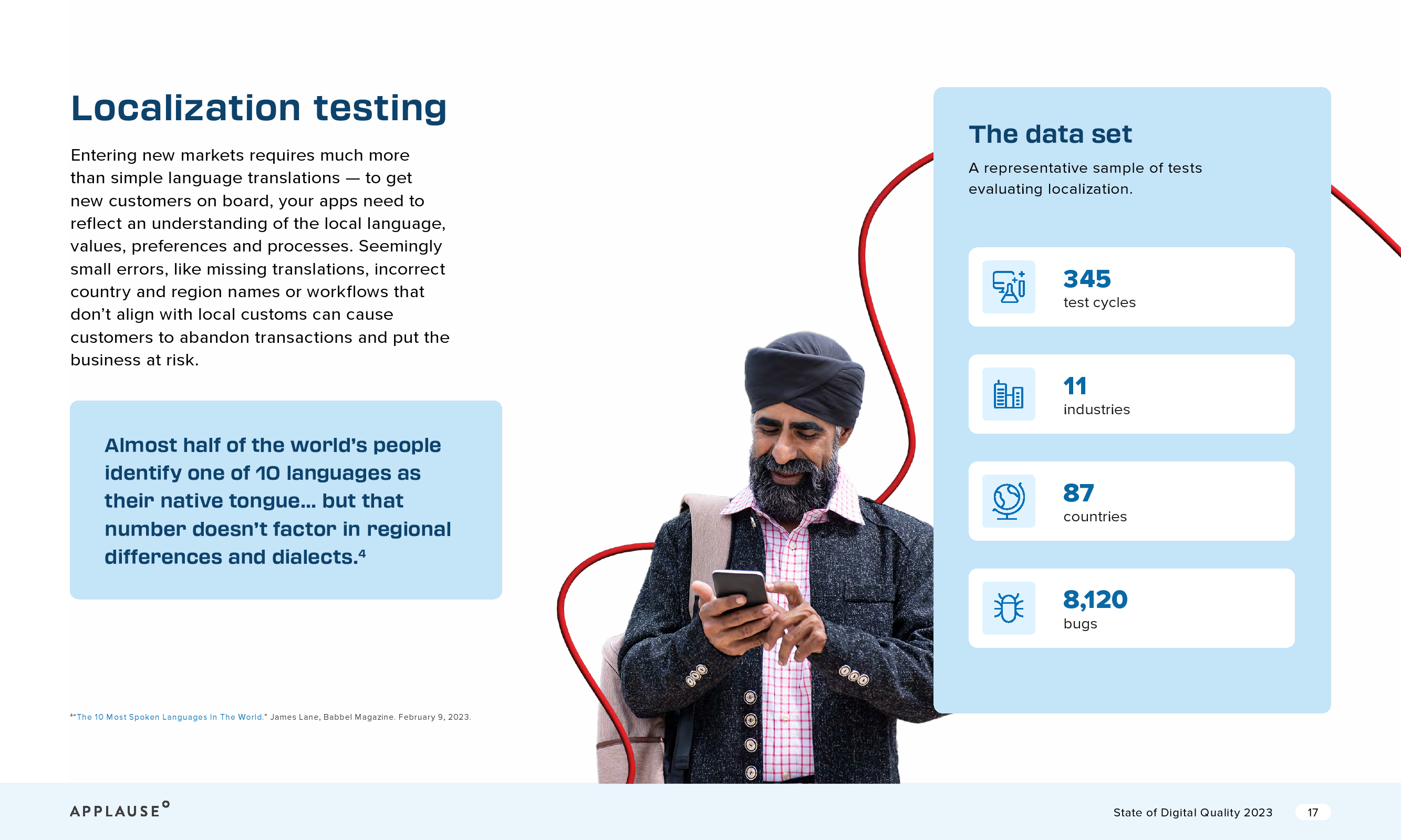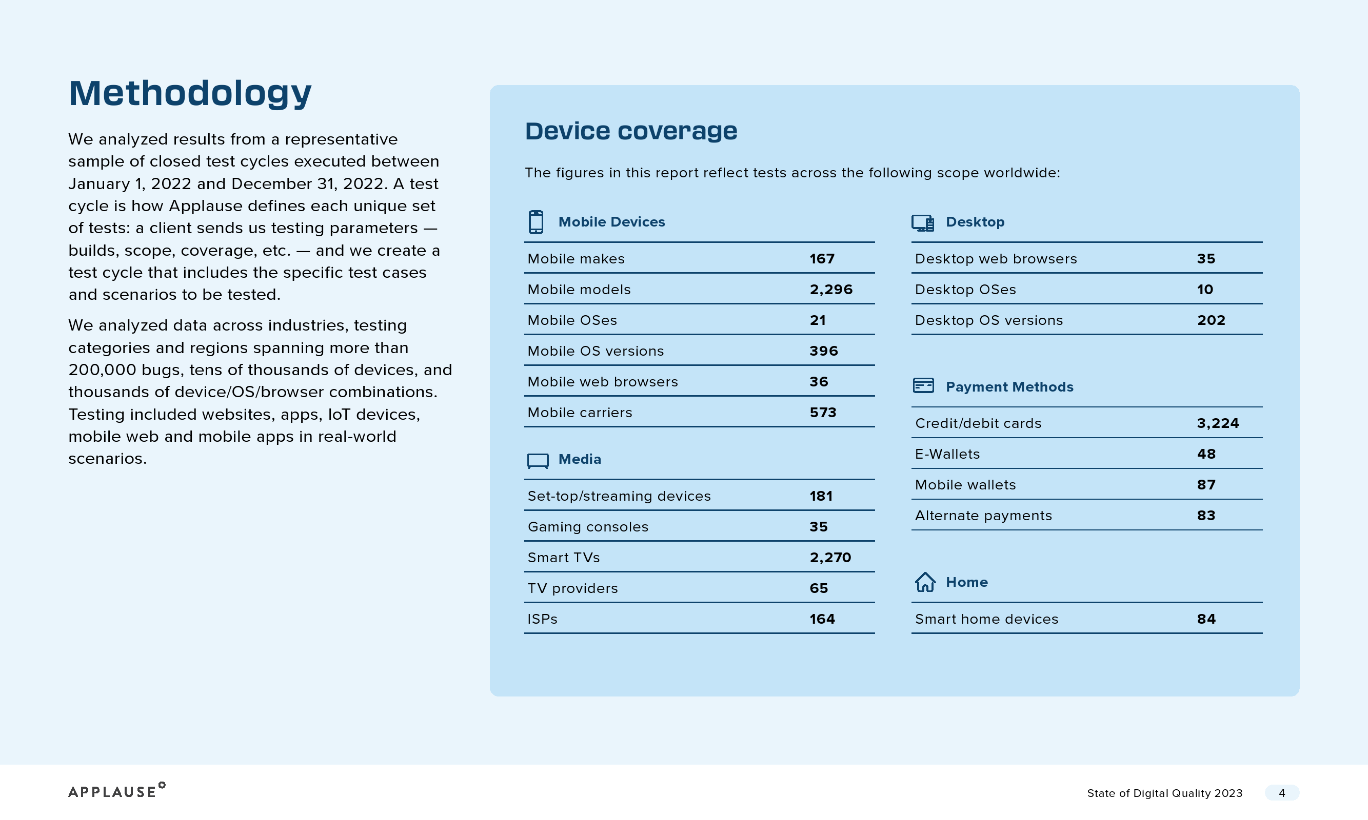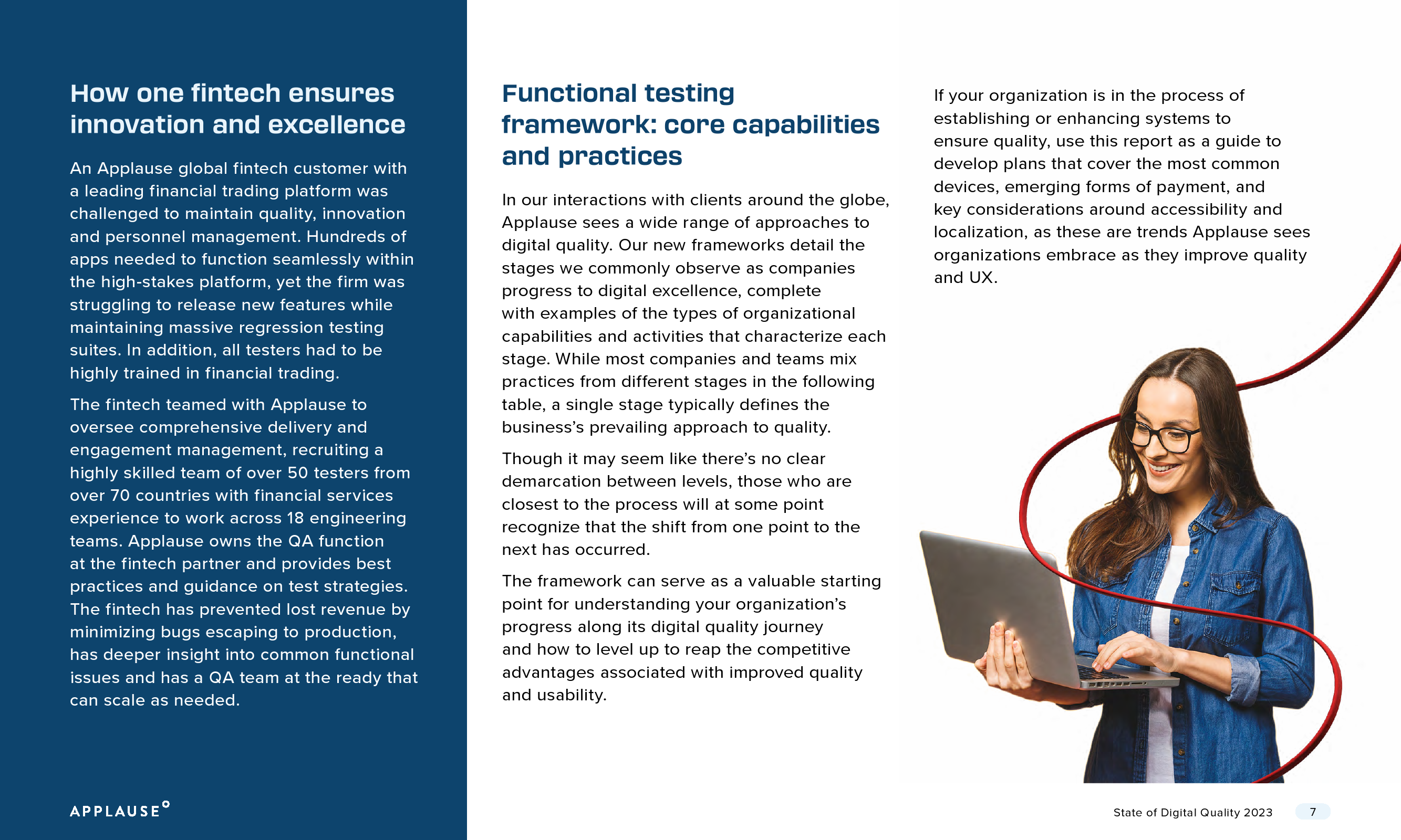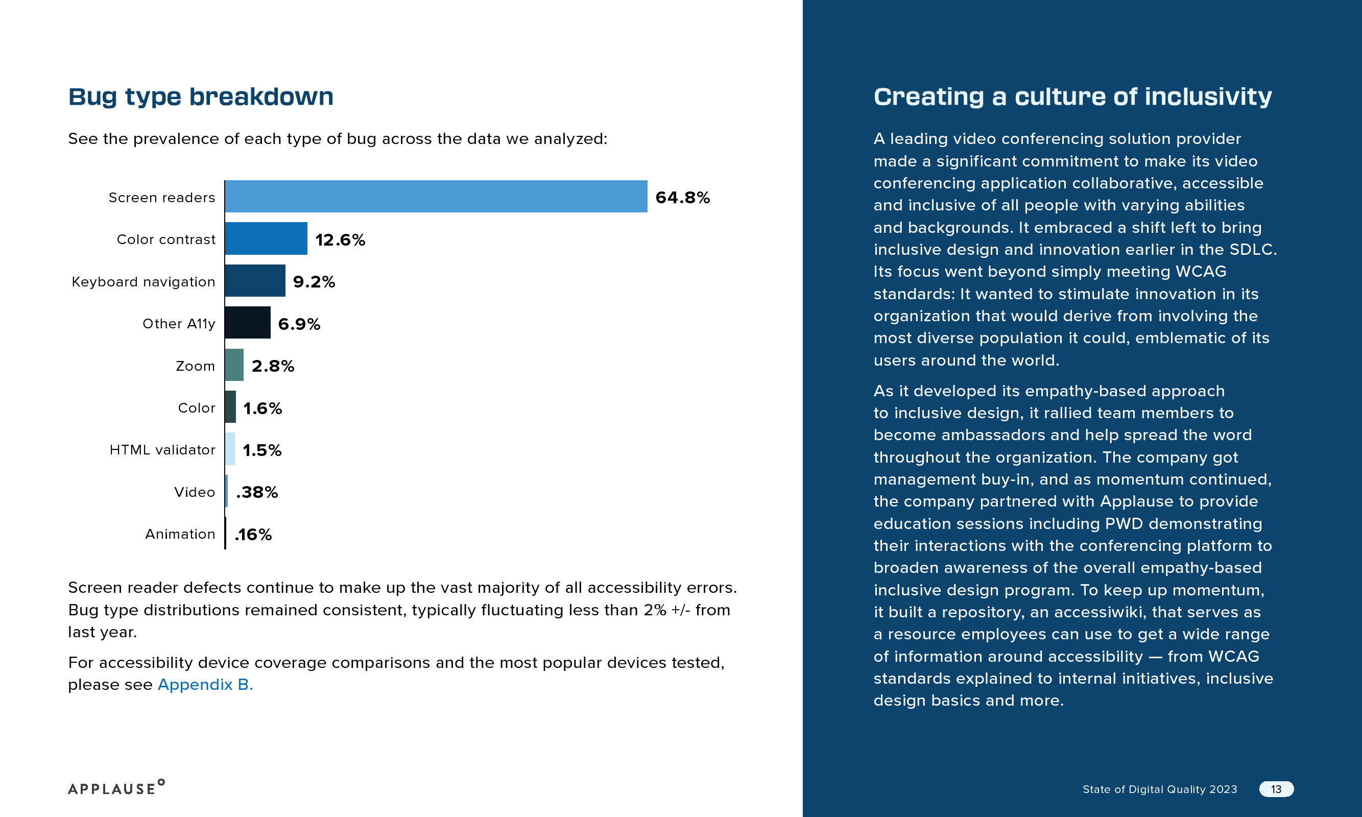 基于与不同行业和地区的公司的合作,Applause对数字质量的状态有着独特的见解,这些公司有不同的技术成熟度水平,正在创建广泛的应用类型。