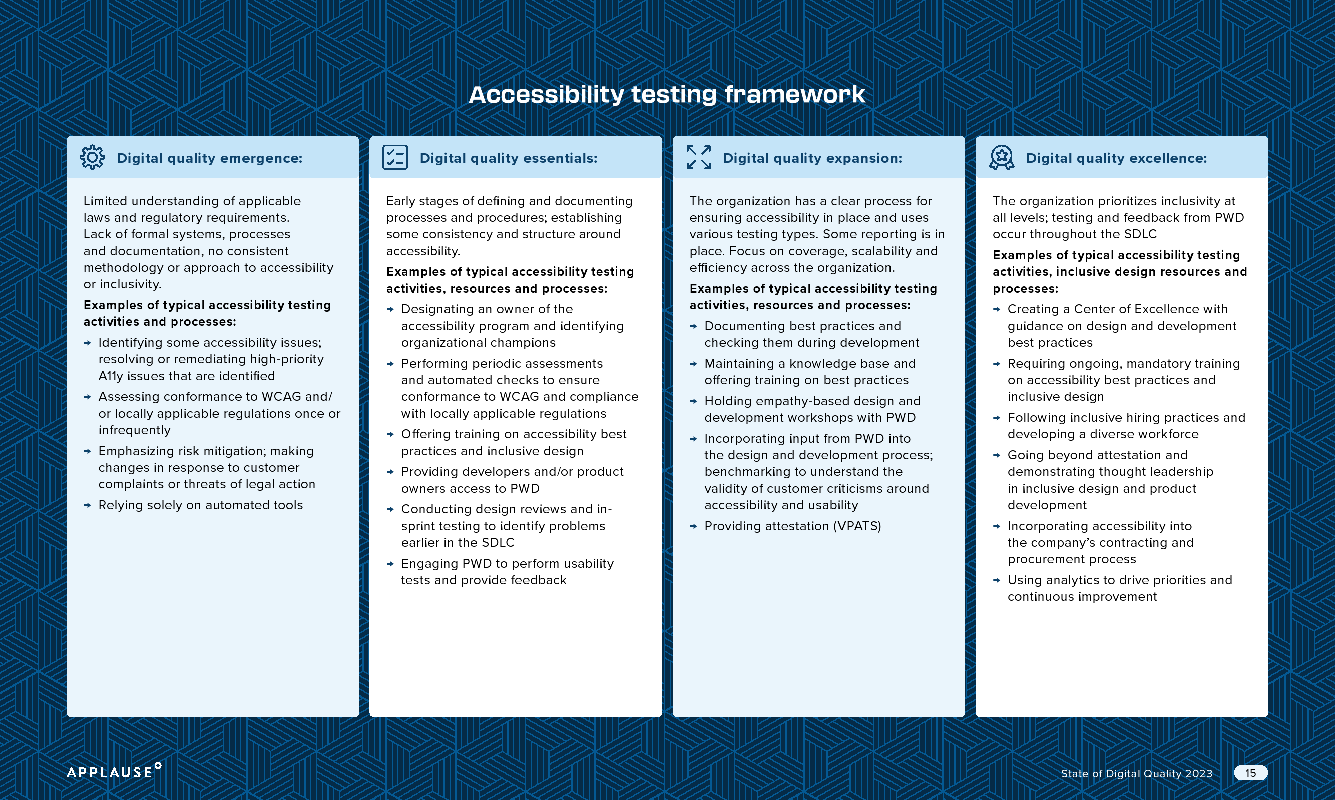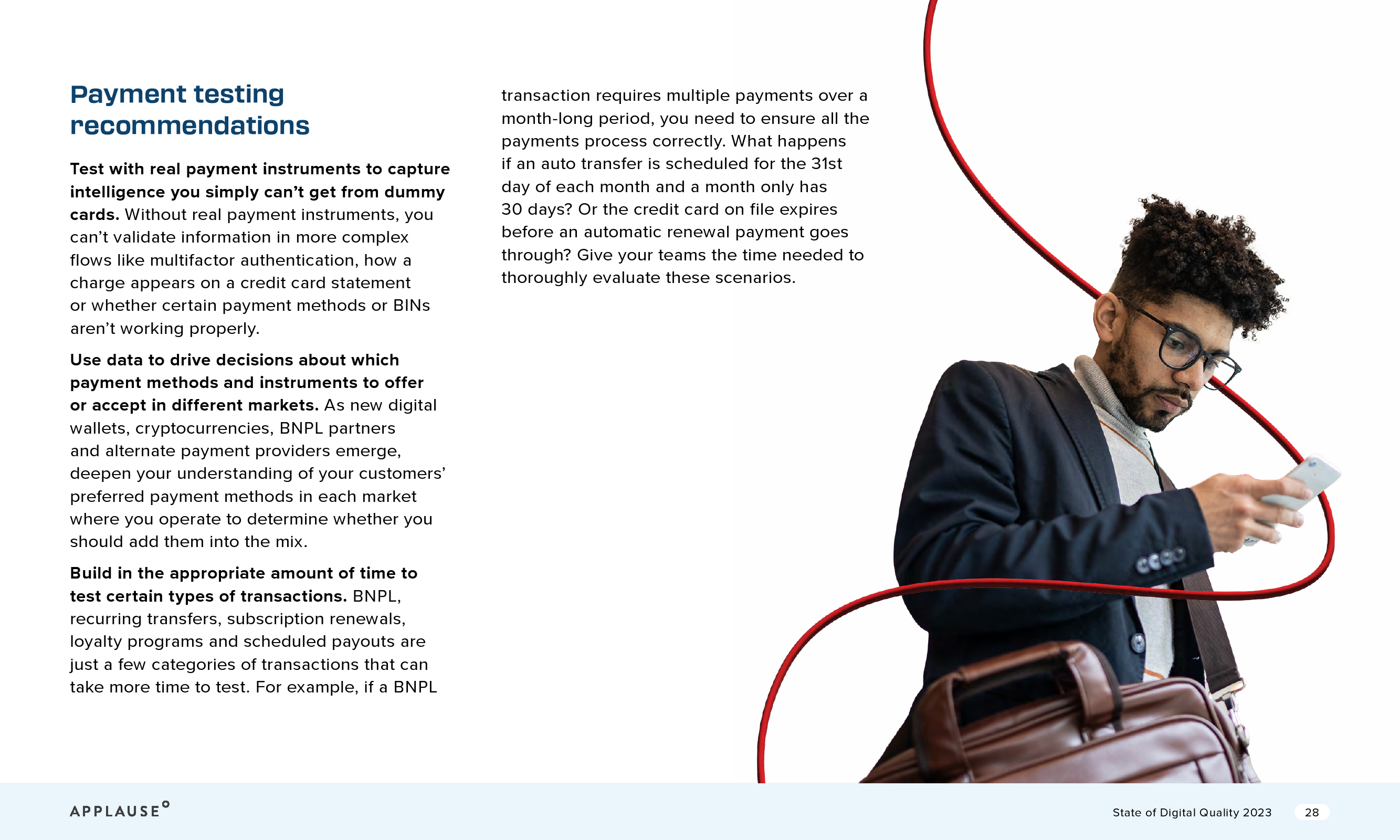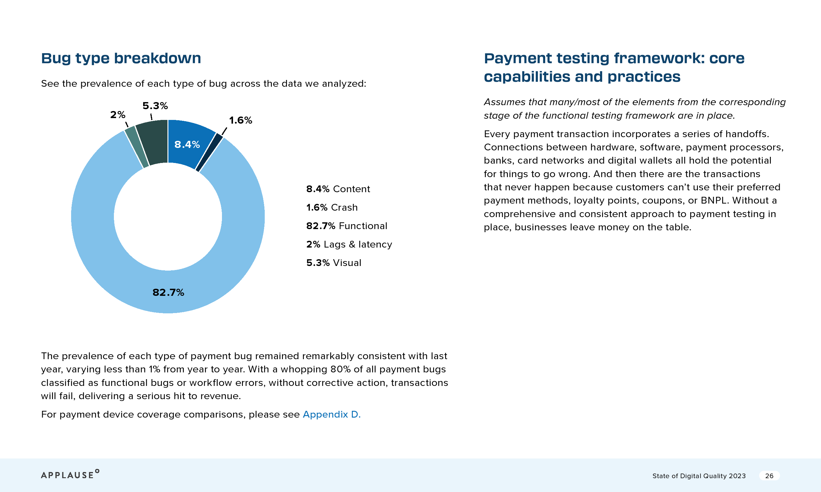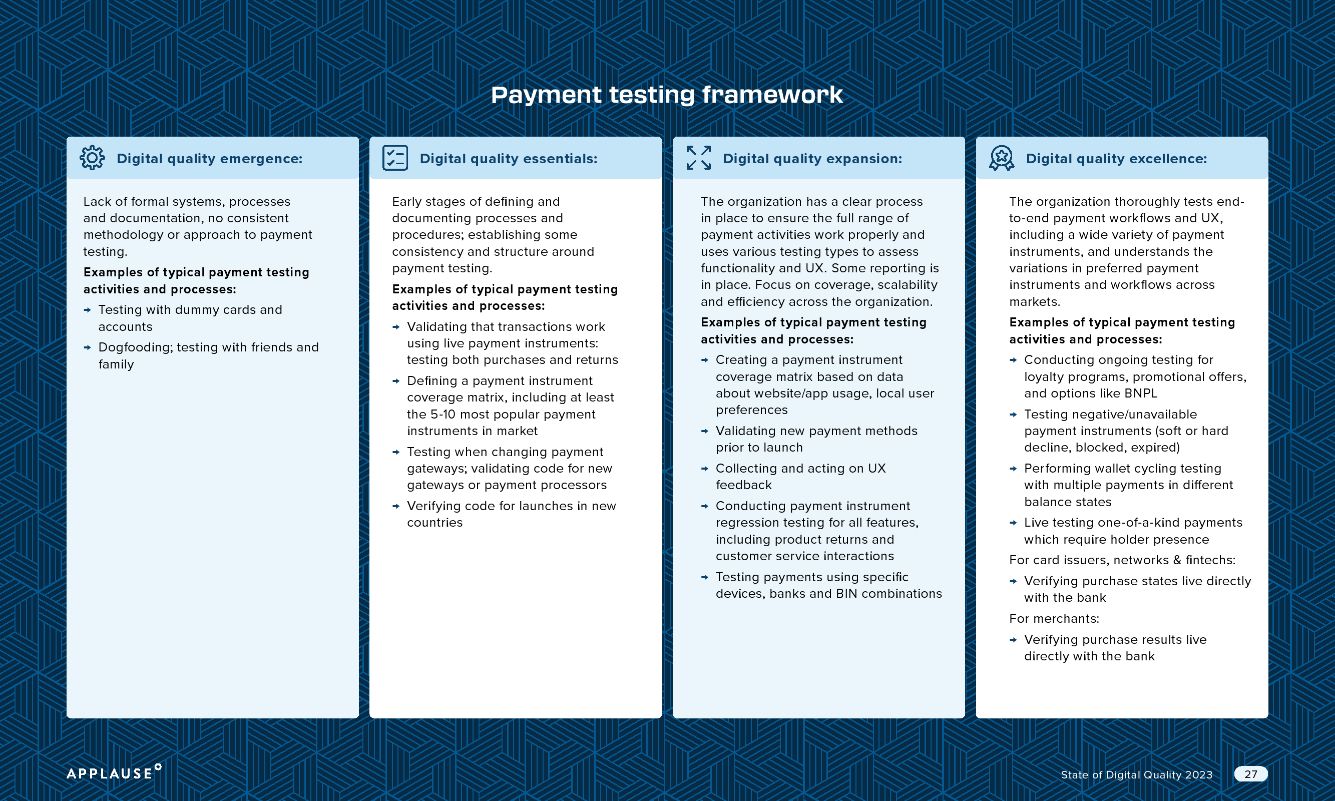 今年我们加入了关于不同地区和行业中最频繁测试的设备、配置和支付工具的额外数据,以及测试配置的平均数量。我们还分享了对处于不同数字质量承诺级别的组织的核心能力、实践和过程的观察。