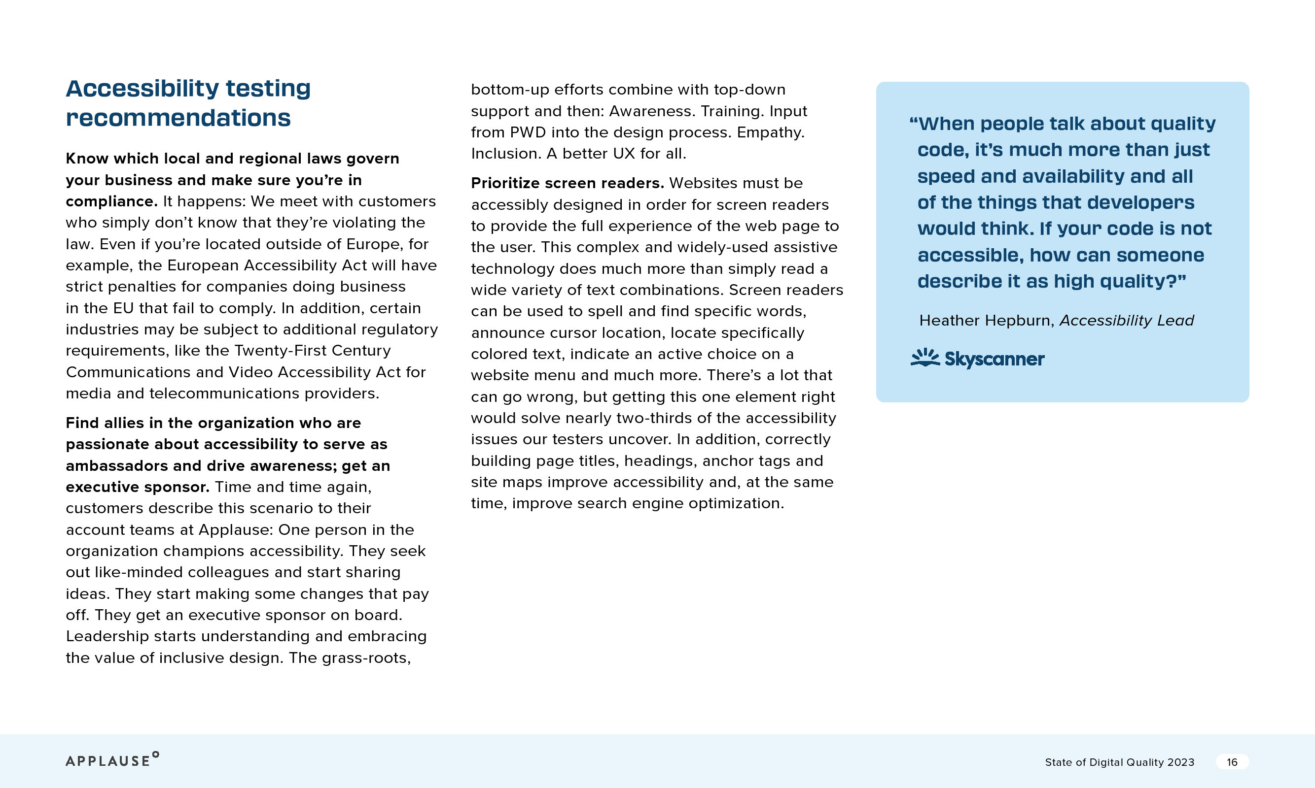 Applause的2023年无障碍和包容性设计调查发现,43%的受访者将无障碍视为其组织的首要任务。72%的受访者表示,他们的公司有专门的易访问性专家。