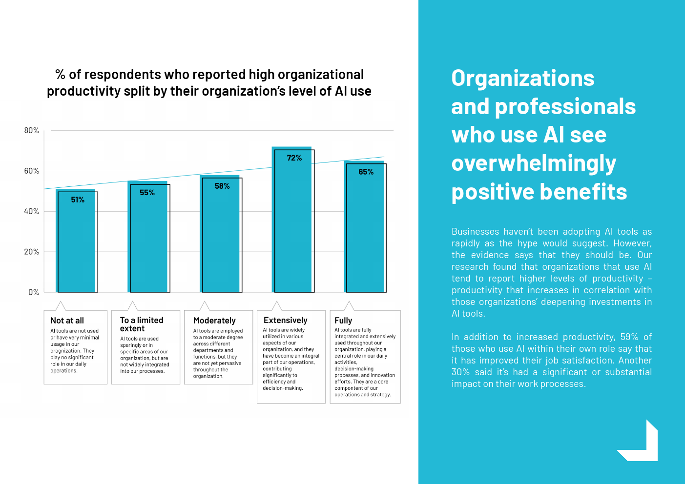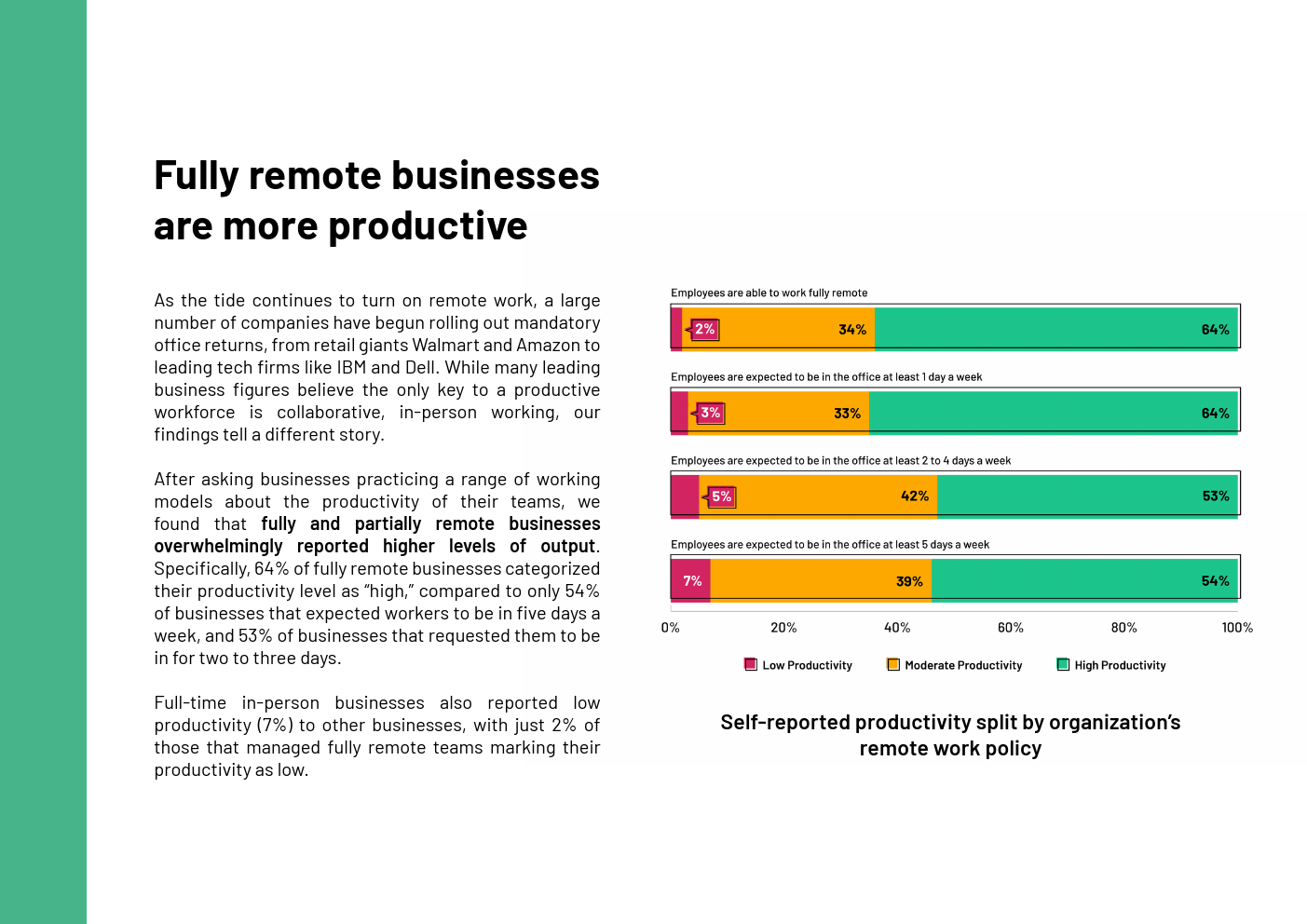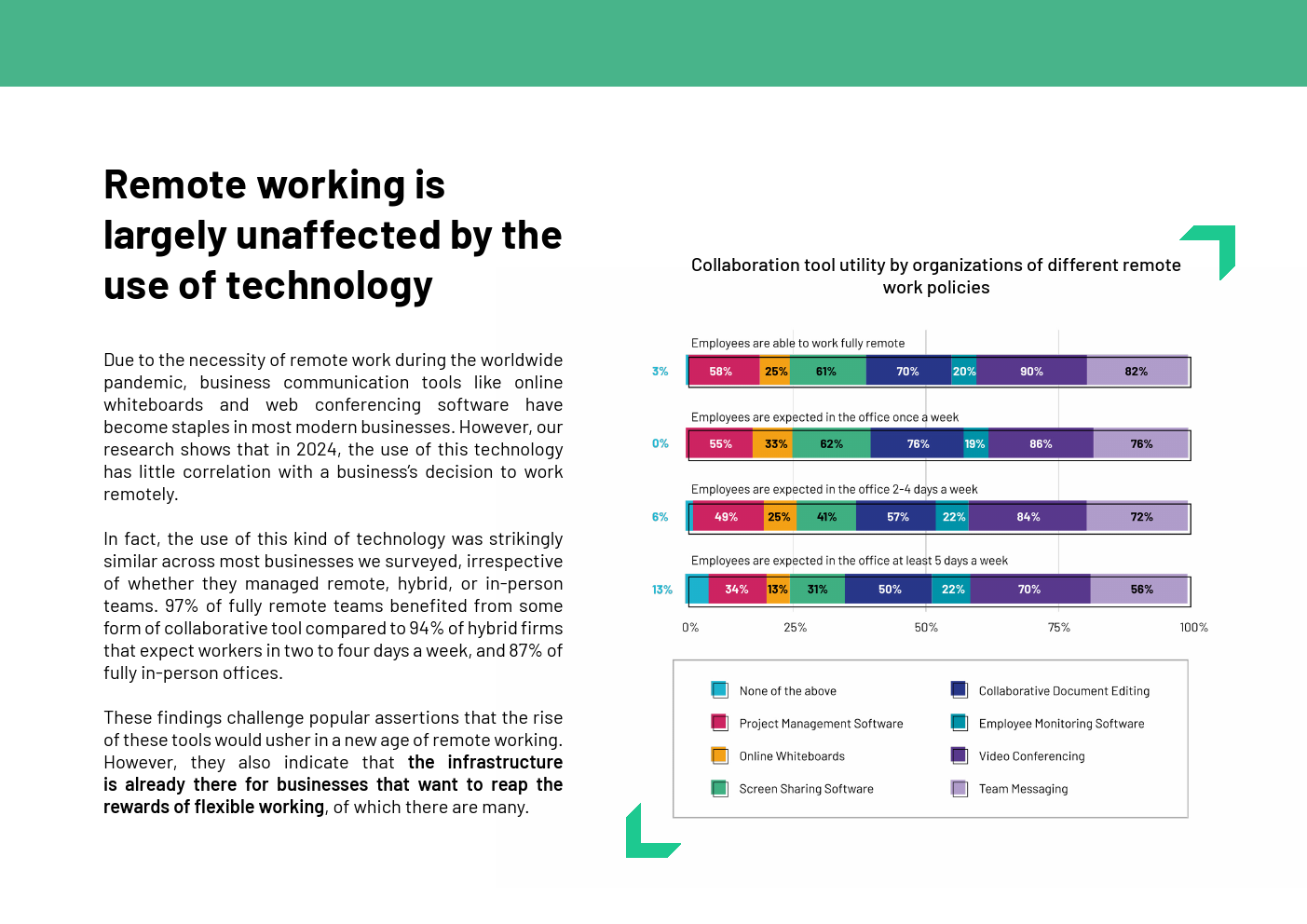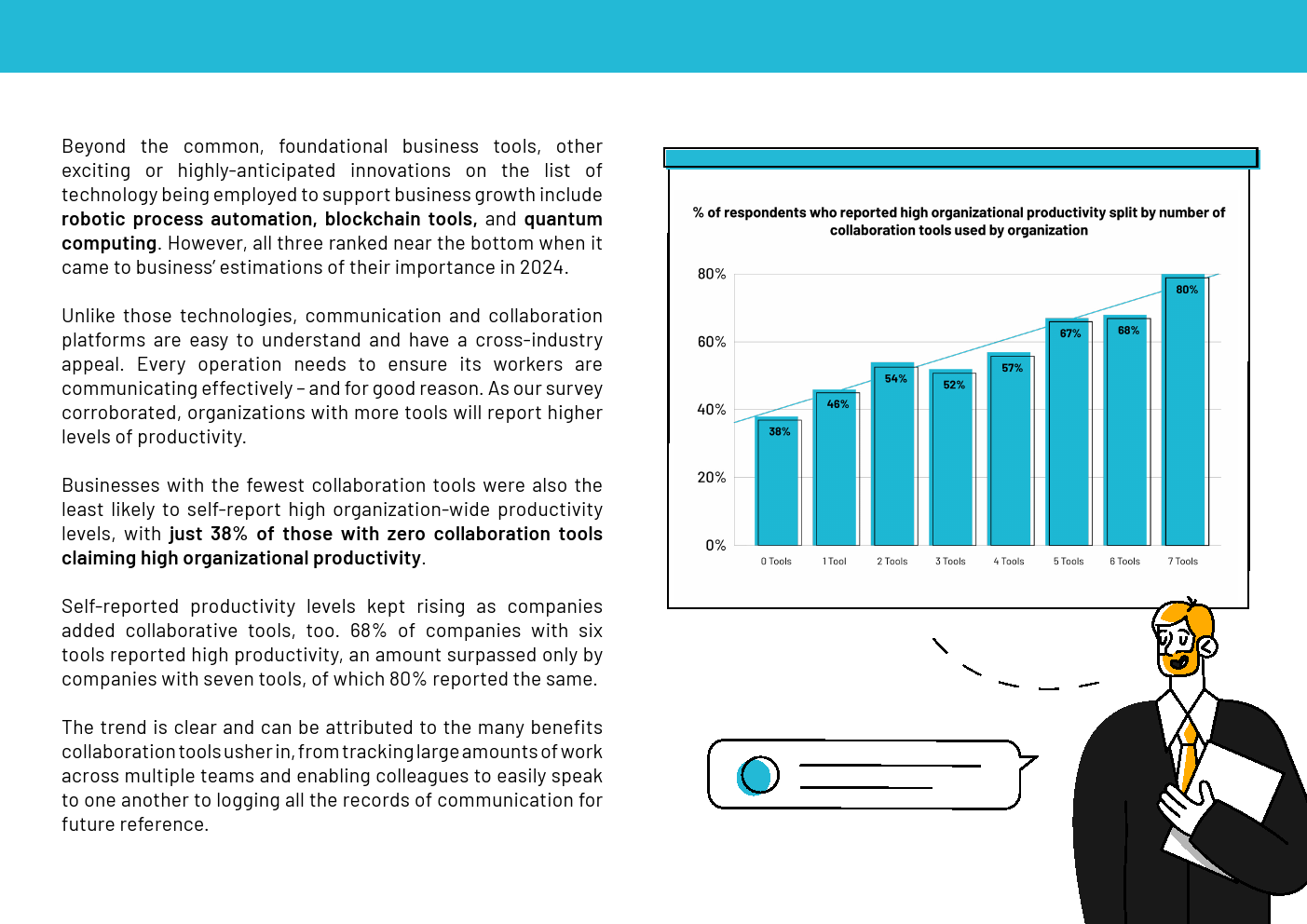 协作工具最少的企业最不可能报告高生产力水平,只有38%的没有协作工具的企业自称有高生产力。